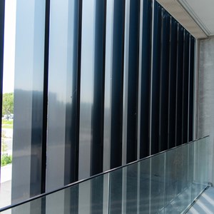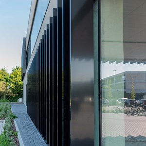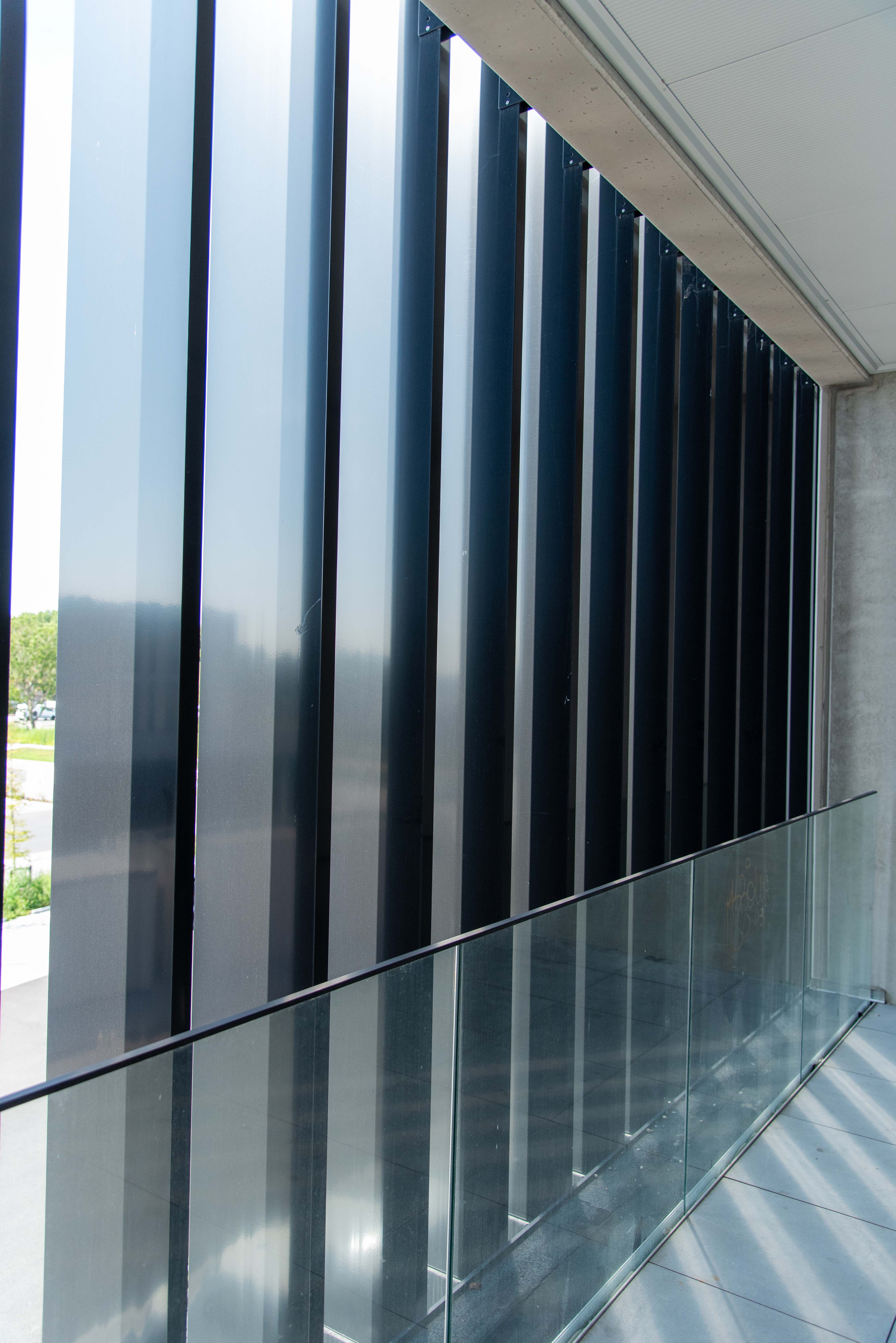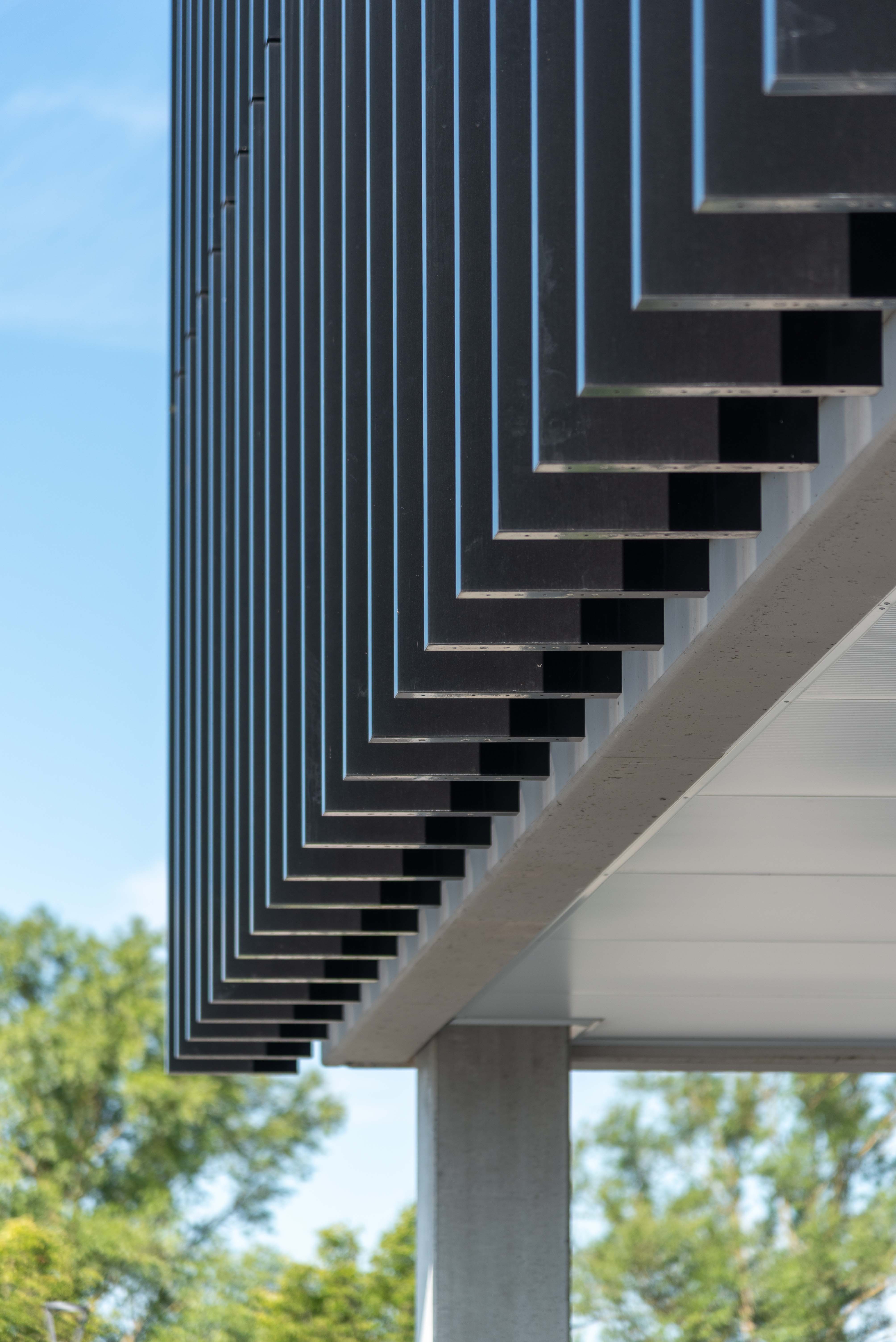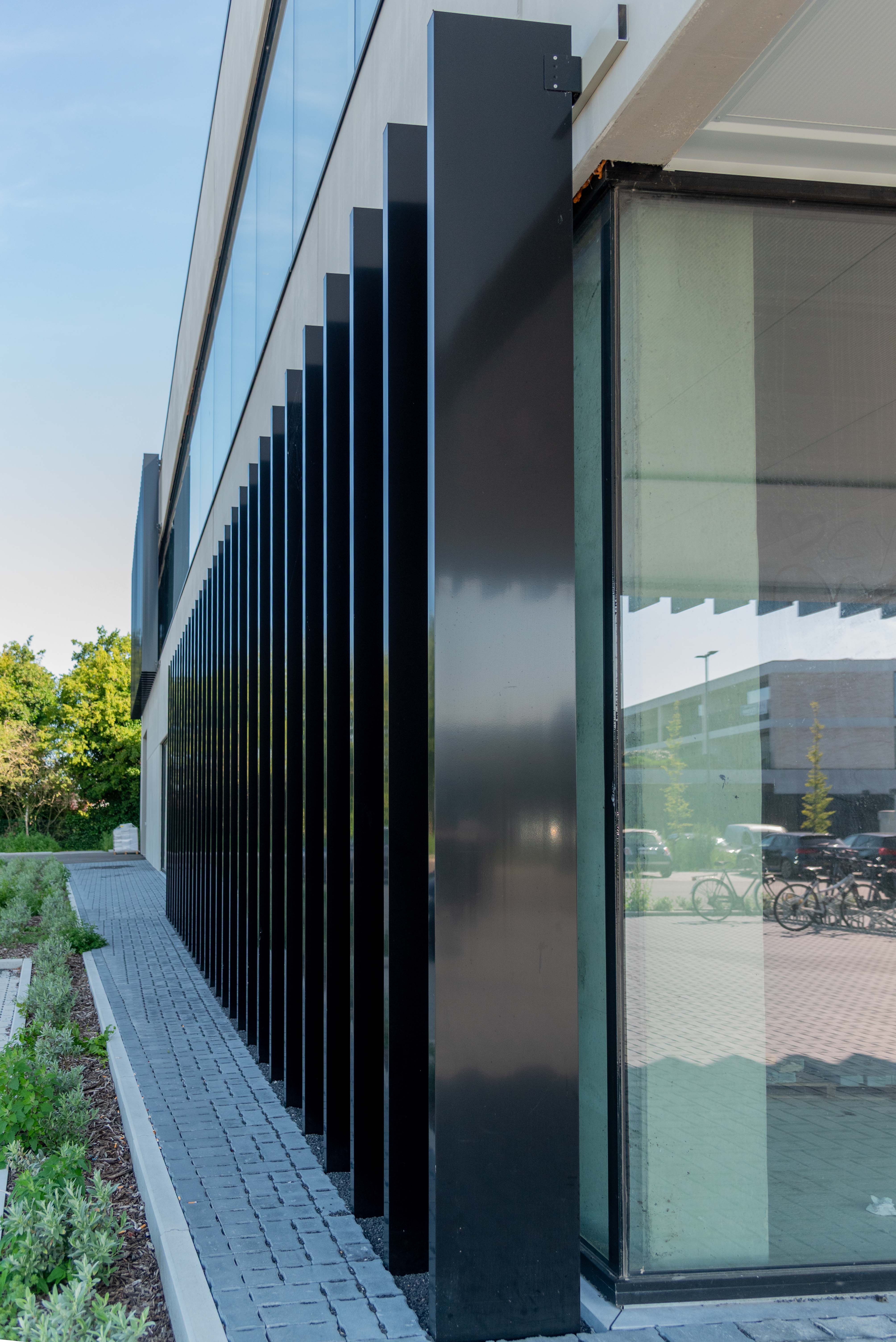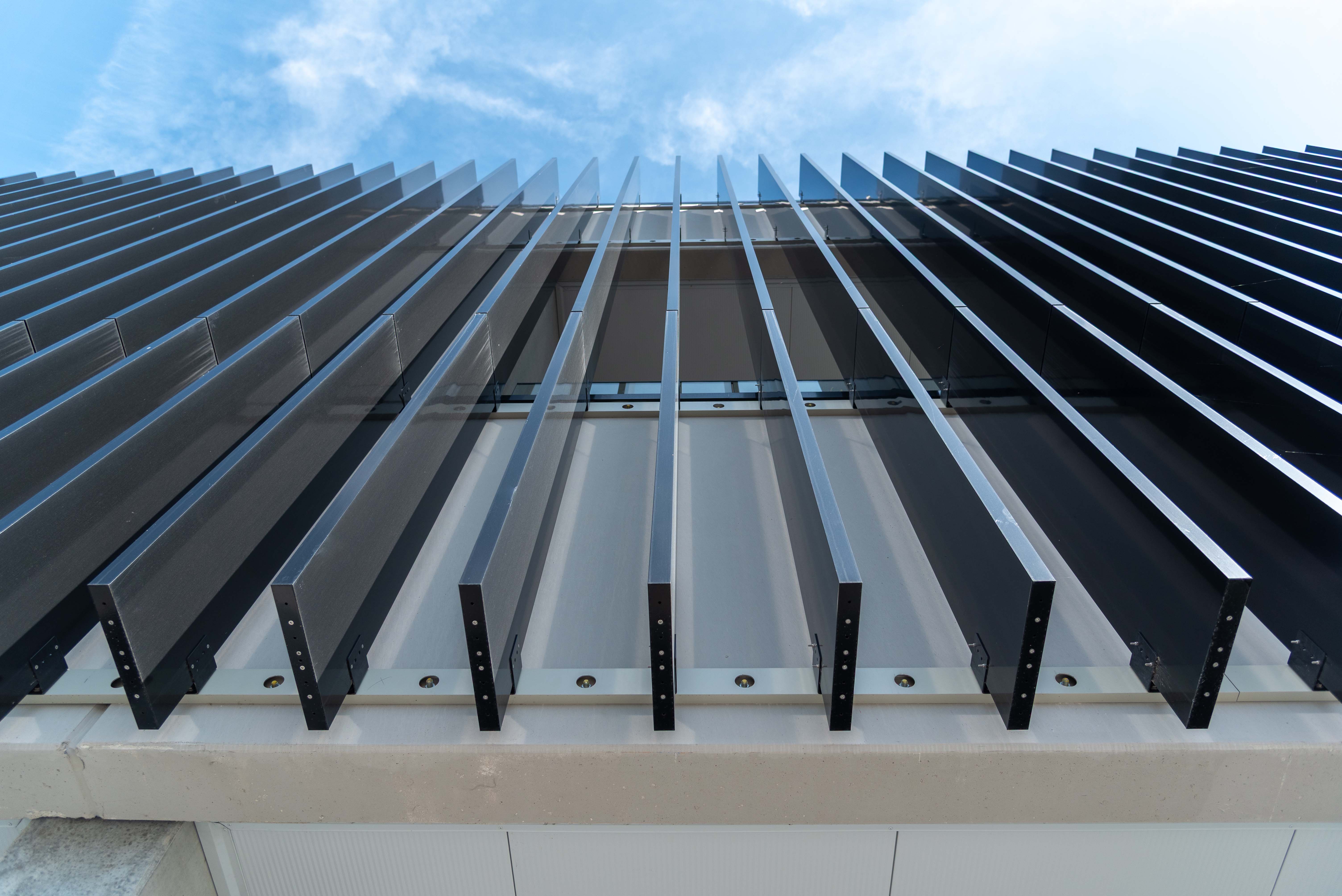 Les lames fixes assurent un filtrage permanent de la lumière solaire, sans compromettre l'apport lumineux ni la vue. De plus, elles contribuent à une consommation énergétique réduite pour le refroidissement en été – un avantage tant pour les sportifs que pour les employés de bureau.