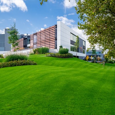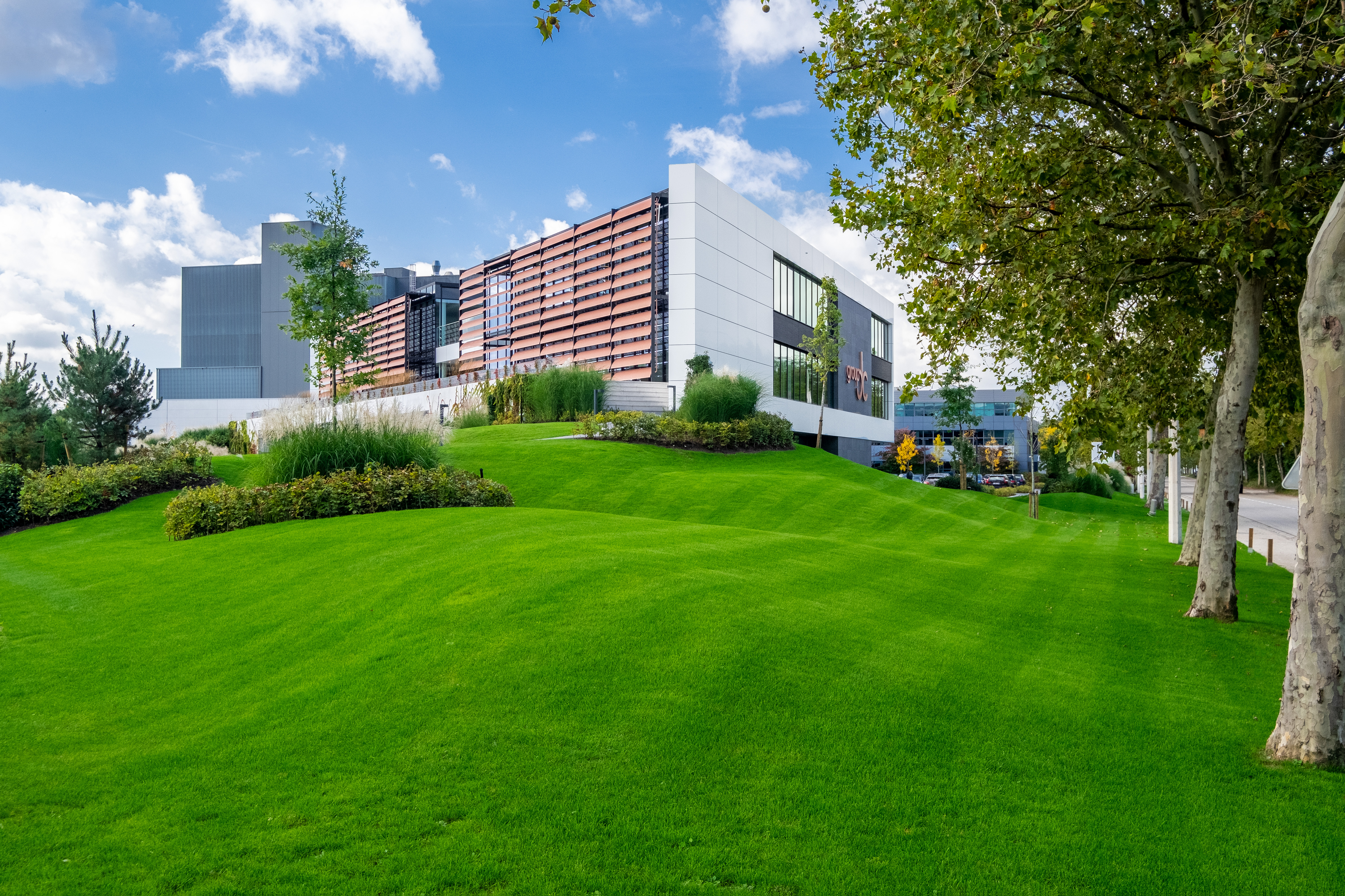 Le siège social de DCM respire le dynamisme dans sa conception et sa finition. Le bâtiment triangulaire d’une superficie de 2800 m² exploite au maximum la forme de la parcelle. De plus, la conception s’adapte à l’orientation sud-ouest et au relief existant. Le bâtiment est pour ainsi dire encastré dans un versant, et donc ancré dans son environnement. La relation entre l’intérieur et l’extérieur joue un rôle clé et tient fortement compte des plantes et de la nature. Logique, puisque DCM œuvre dans le secteur horticole.