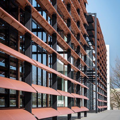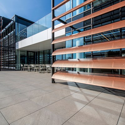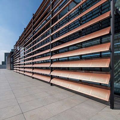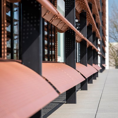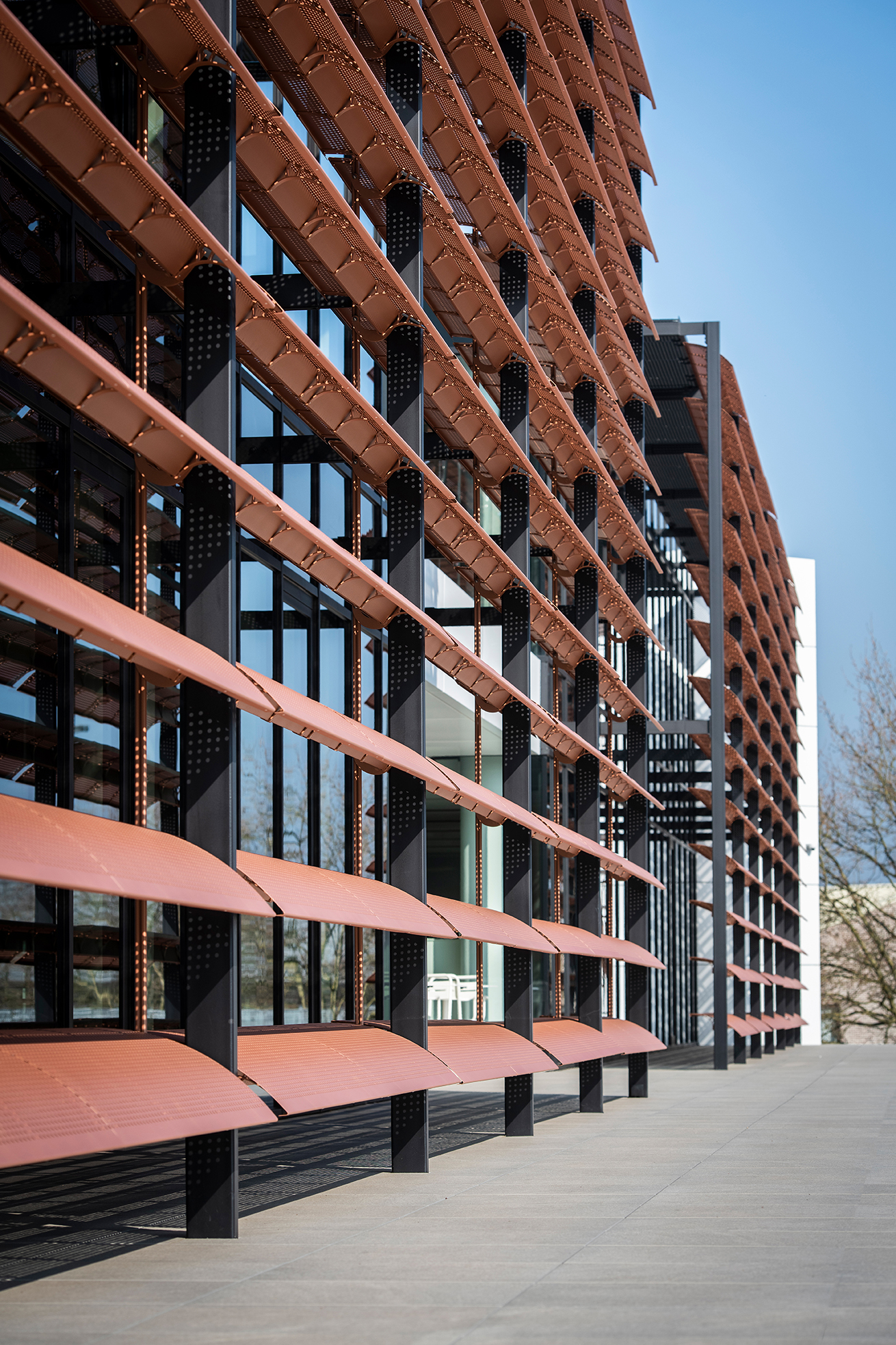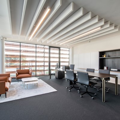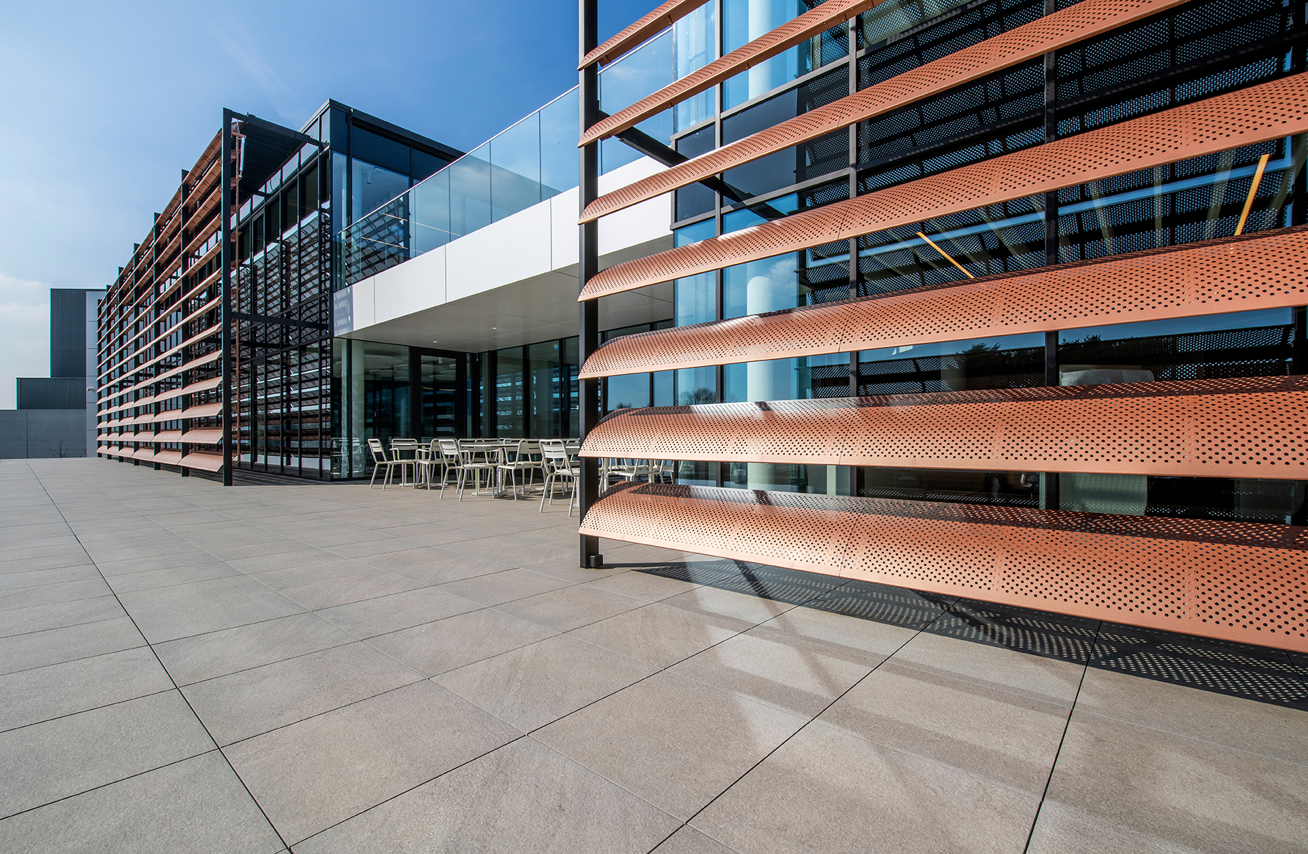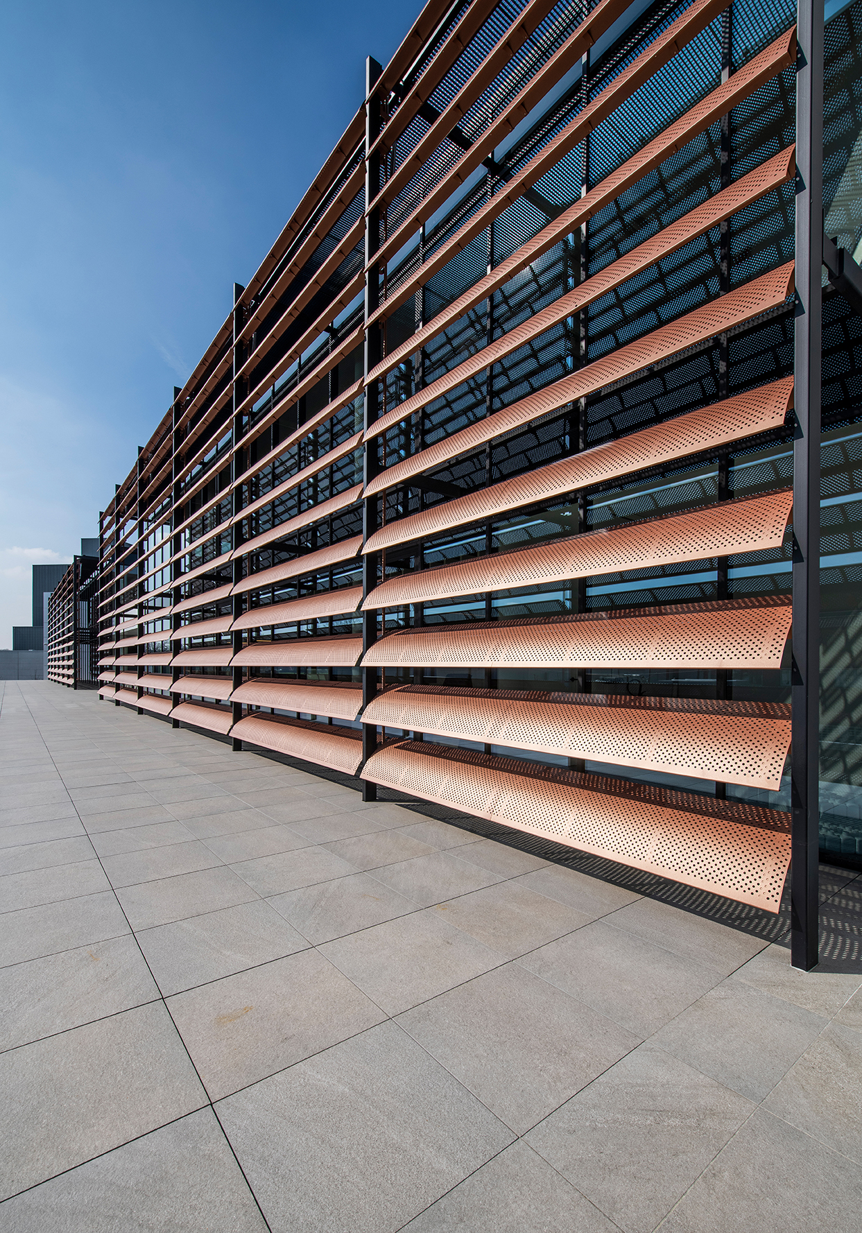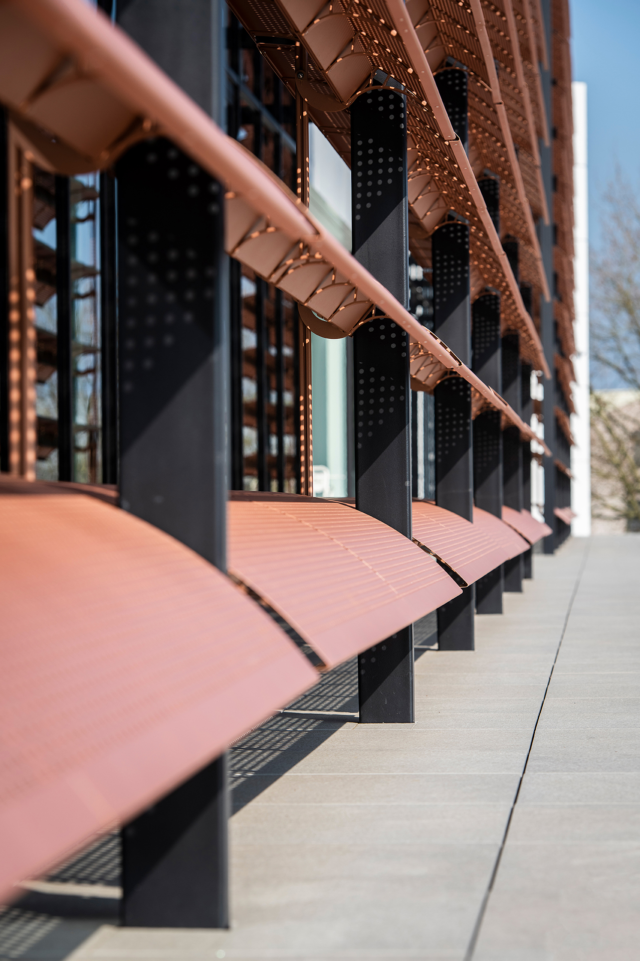 « Pour éviter que le soleil estival ne devienne l’ennemi du confort, une protection solaire structurelle extérieure est essentielle », souligne Reginald Schellen. « D’où le choix des lames DucoSun Wing, à la forme unique. Nous savons par expérience avec d’autres bureaux qu’il est préférable de placer les lames à l’horizontale sur une façade exposée au sud, car le soleil est haut. La valeur ajoutée architecturale des lames de l’immense façade sud ne doit pas être sous-estimée. DUCO se démarquait dans la comparaison, tant sur le plan financier que technique. Il suffit de penser à la forme et à la suspension spécifiques des lames. Ensemble, nous avons recherché la couleur chaude idéale. »