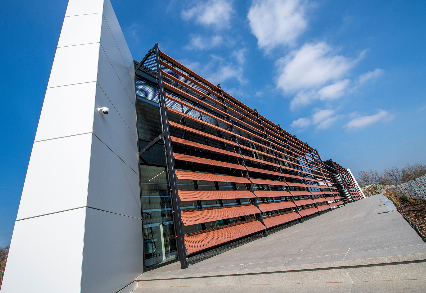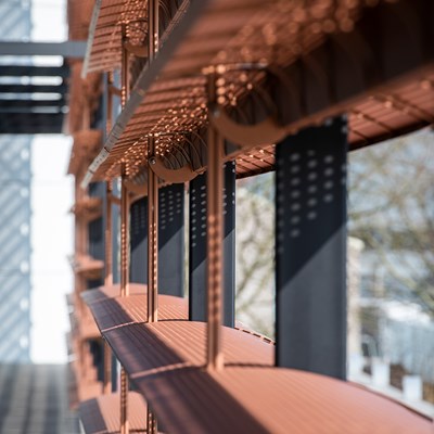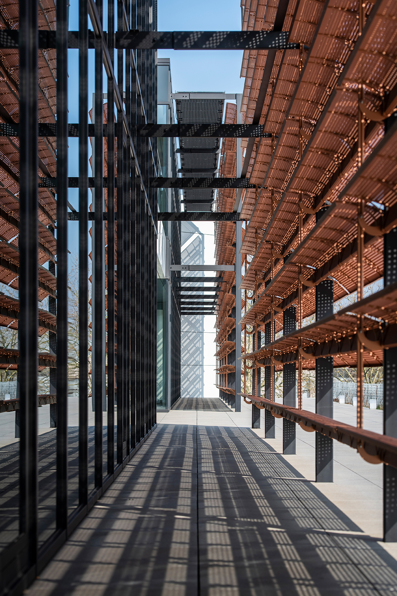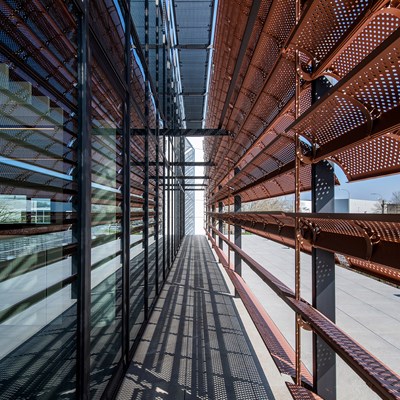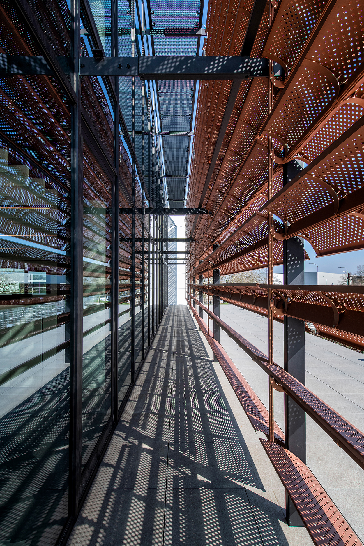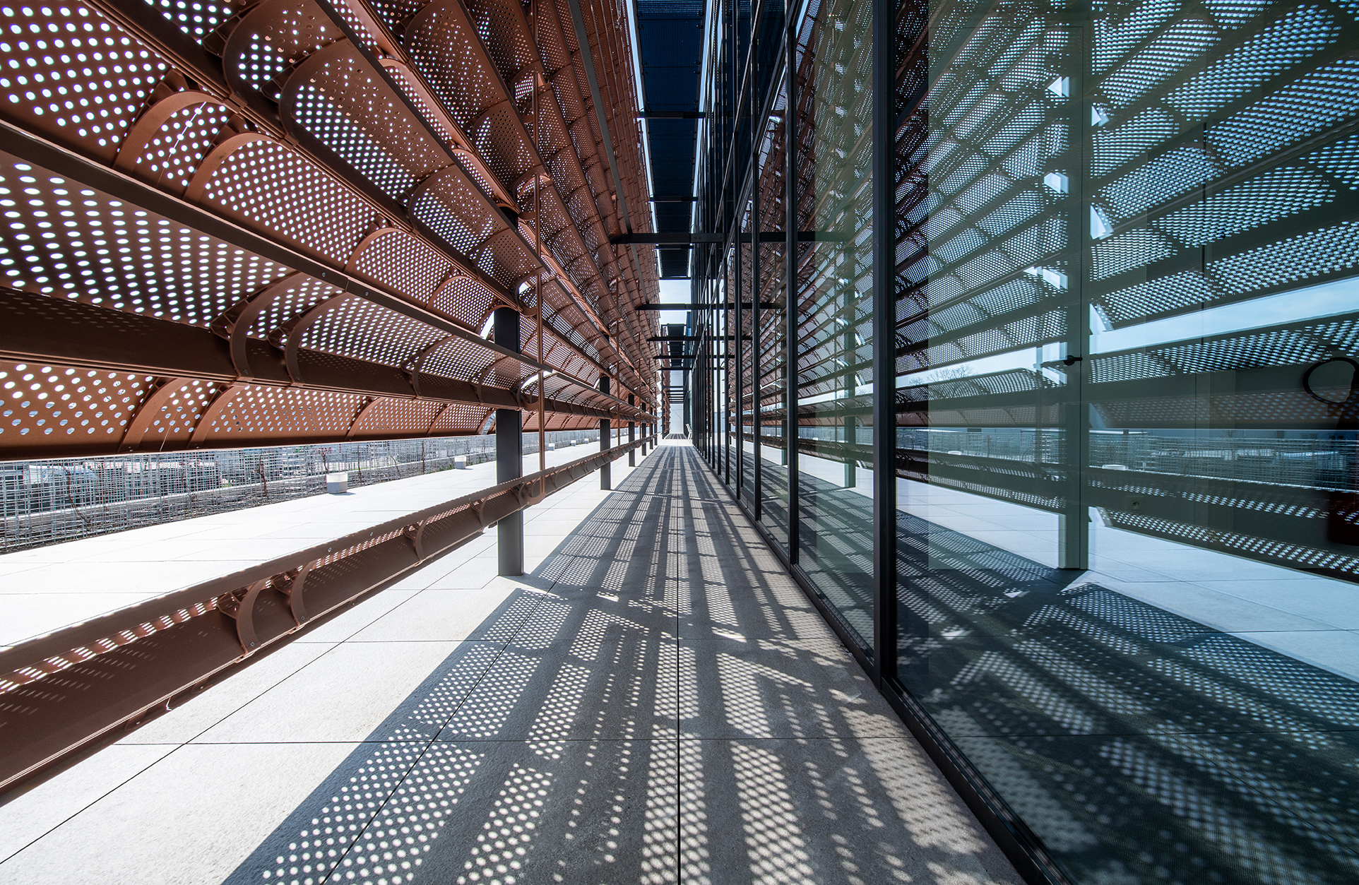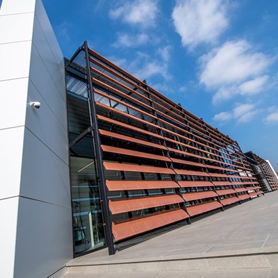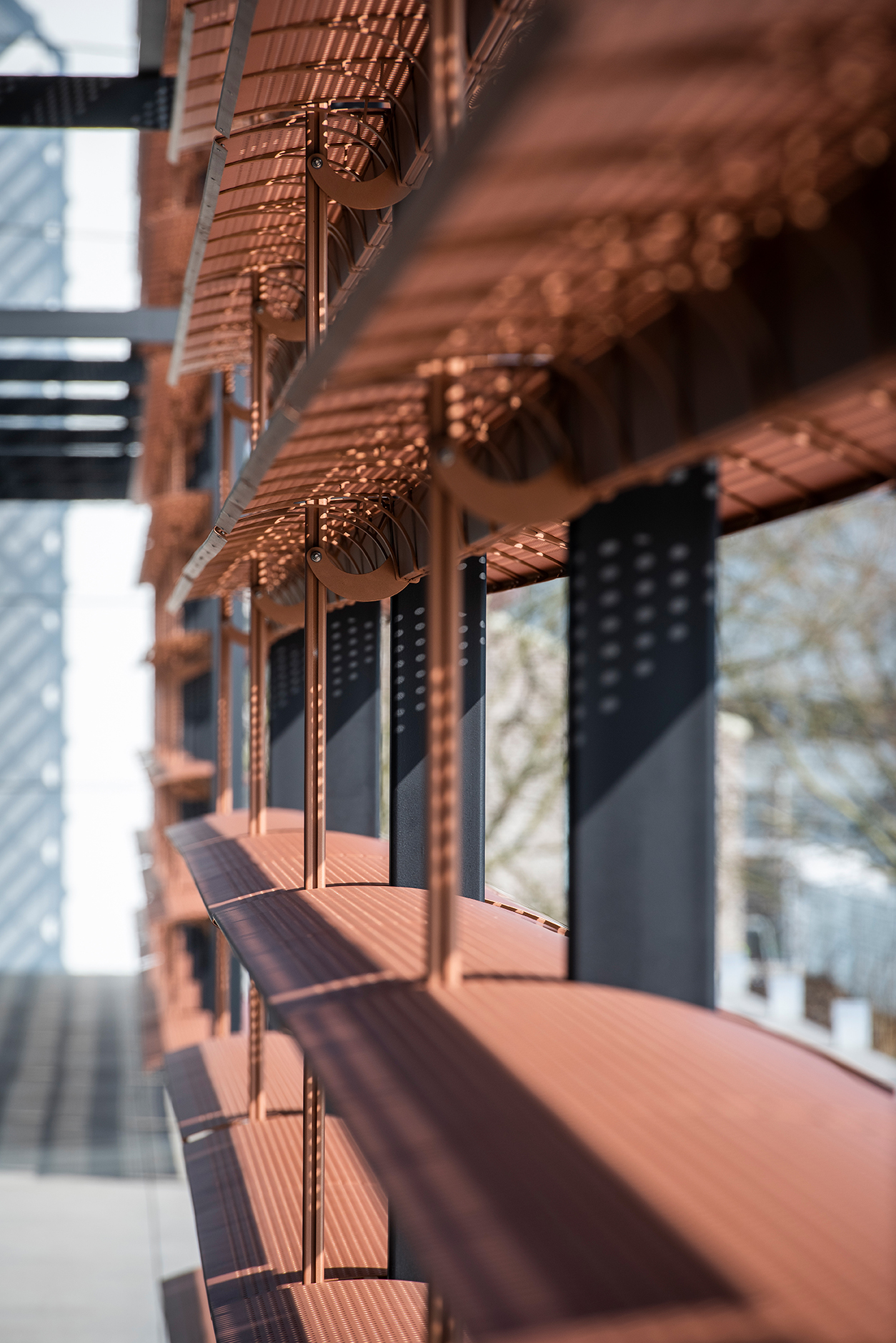 « Pour éviter que le soleil estival ne devienne l’ennemi du confort, une protection solaire structurelle extérieure est essentielle », souligne Reginald Schellen. « D’où le choix des lames DucoSun Wing, à la forme unique. Nous savons par expérience avec d’autres bureaux qu’il est préférable de placer les lames à l’horizontale sur une façade exposée au sud, car le soleil est haut. La valeur ajoutée architecturale des lames de l’immense façade sud ne doit pas être sous-estimée. DUCO se démarquait dans la comparaison, tant sur le plan financier que technique. Il suffit de penser à la forme et à la suspension spécifiques des lames. Ensemble, nous avons recherché la couleur chaude idéale. »