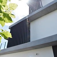 La vitrine de l'espace commercial FortyFour au rez-de-chaussée s'étend sur toute la largeur de la façade, interrompue par l'entrée des appartements situés au-dessus. Ici, les lames verticales DucoSun Cubic ont été utilisées avec reconnaissance pour garder la porte d'entrée quelque peu hors de vue. La combinaison des auvents en béton et des lames verticales DucoSun Cubic offre une transition idéale vers les appartements, ainsi qu'une ligne épurée de l'ensemble.