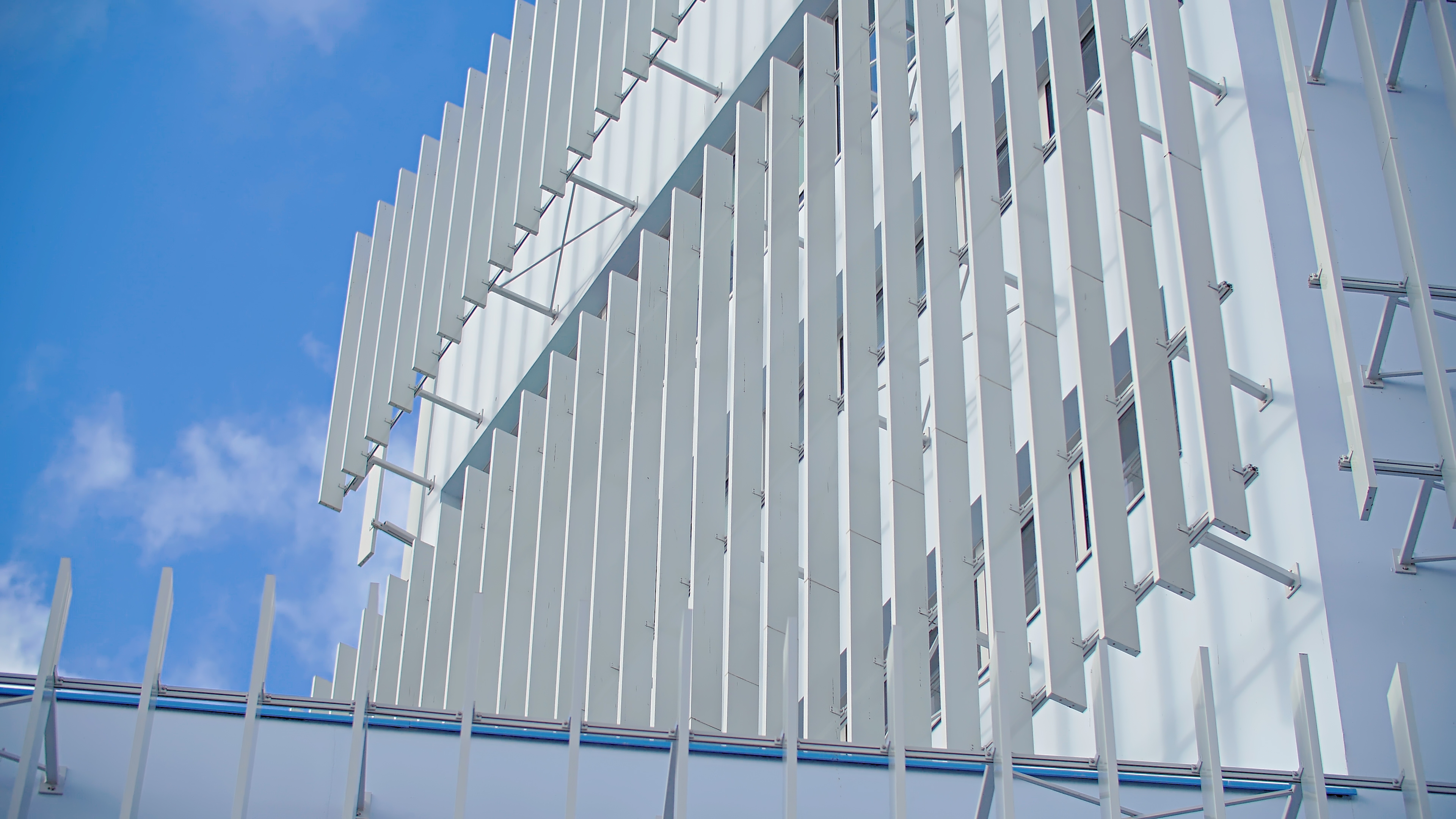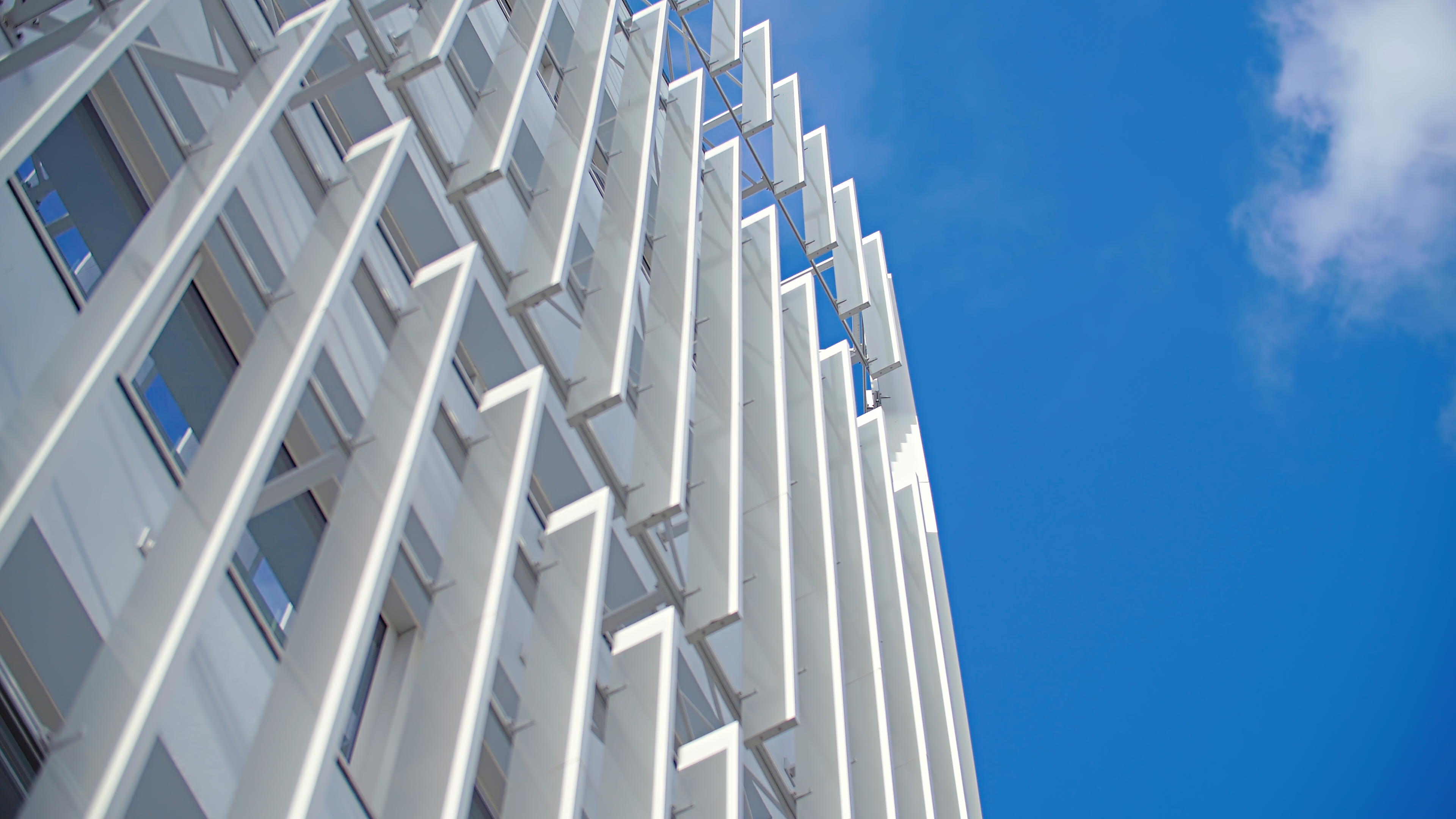 Pour habiller la façade du projet Mabella à Rennes, des brise-soleil DucoSun Cubic ont été utlisées, donnant au bâtiment un aspect très épuré et contemporain.