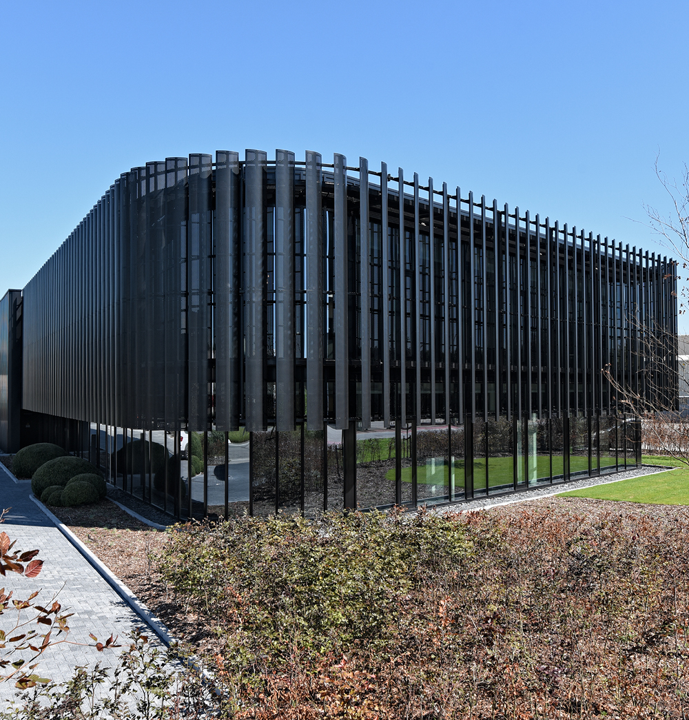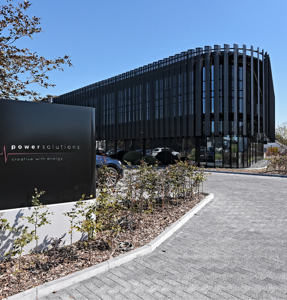 Grâce à sa façade drapée de noir, fonctionnant comme protection solaire d'une part et contribuant à la qualité esthétique d'autre part, Power Solutions est un bel exemple de la magie que peuvent réaliser ensemble la technique et l'architecture.