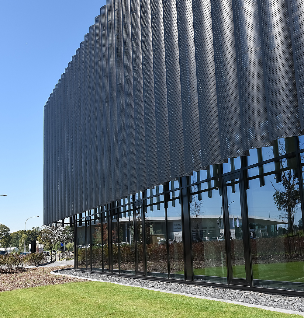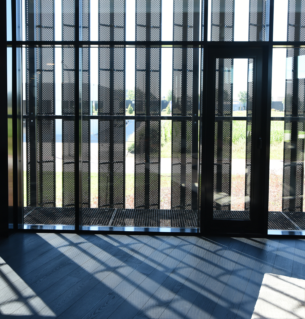 « XL Boom a été le premier projet à faire usage de lames elliptiques du type DucoSun Ellips de divers formats, placées verticalement devant la façade afin de créer un effet ludique », explique l'architecte. « Mais chez Power Solutions aussi, nous avons opté pour une approche particulière. Comme l'un des impératifs était de réduire l'incidence directe de la lumière solaire, nous avons pensé à utiliser DucoSun Wing pour la façade. Ces grandes lames en forme d'ailes d'avion sont constituées d'un panneau perforé noir aux dimensions spécialement étudiées pour ce projet. Ce système a donc une double fonction : protection solaire d'une part, et une contribution considérable à la qualité esthétique du bureau, qui détermine son apparence. »
