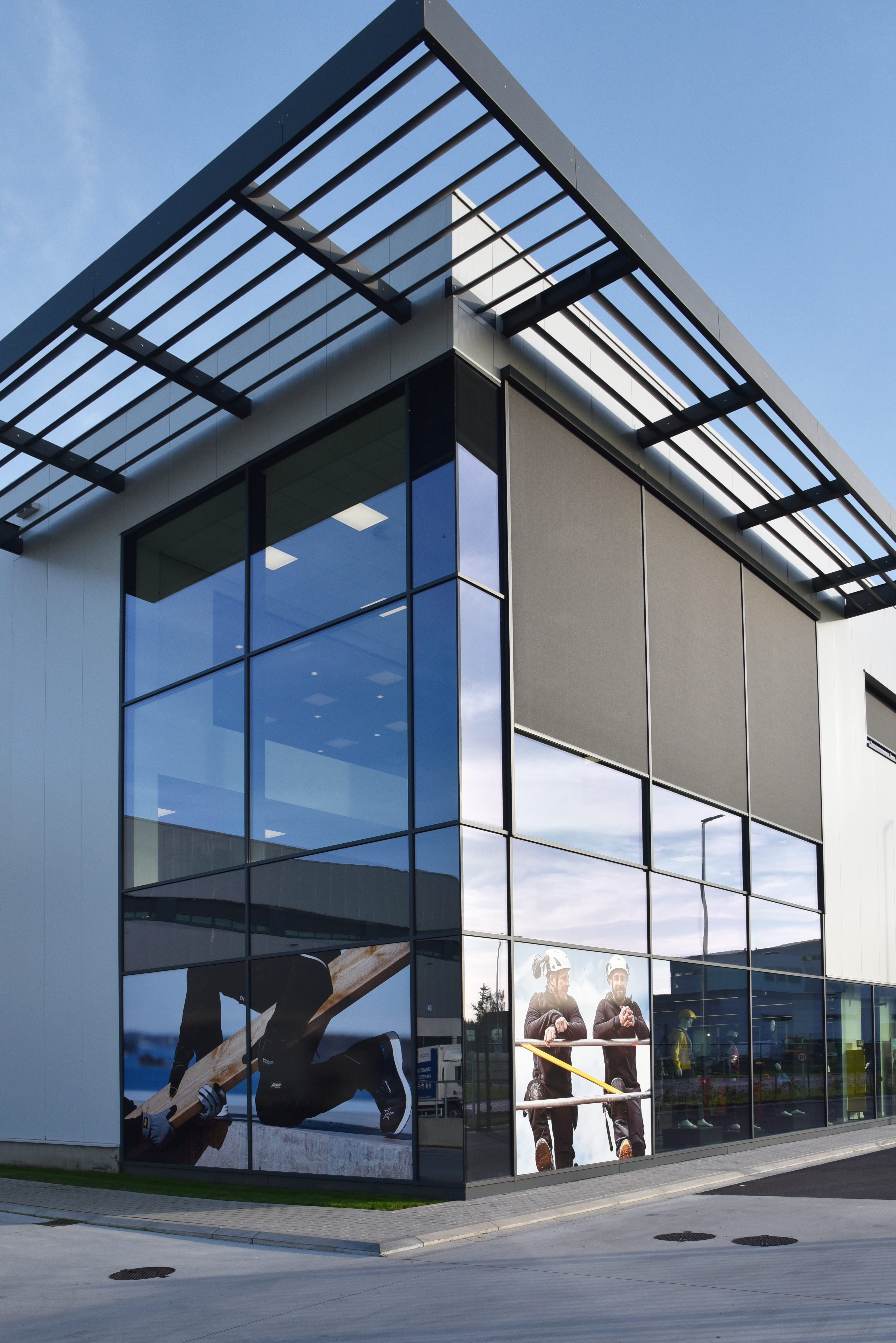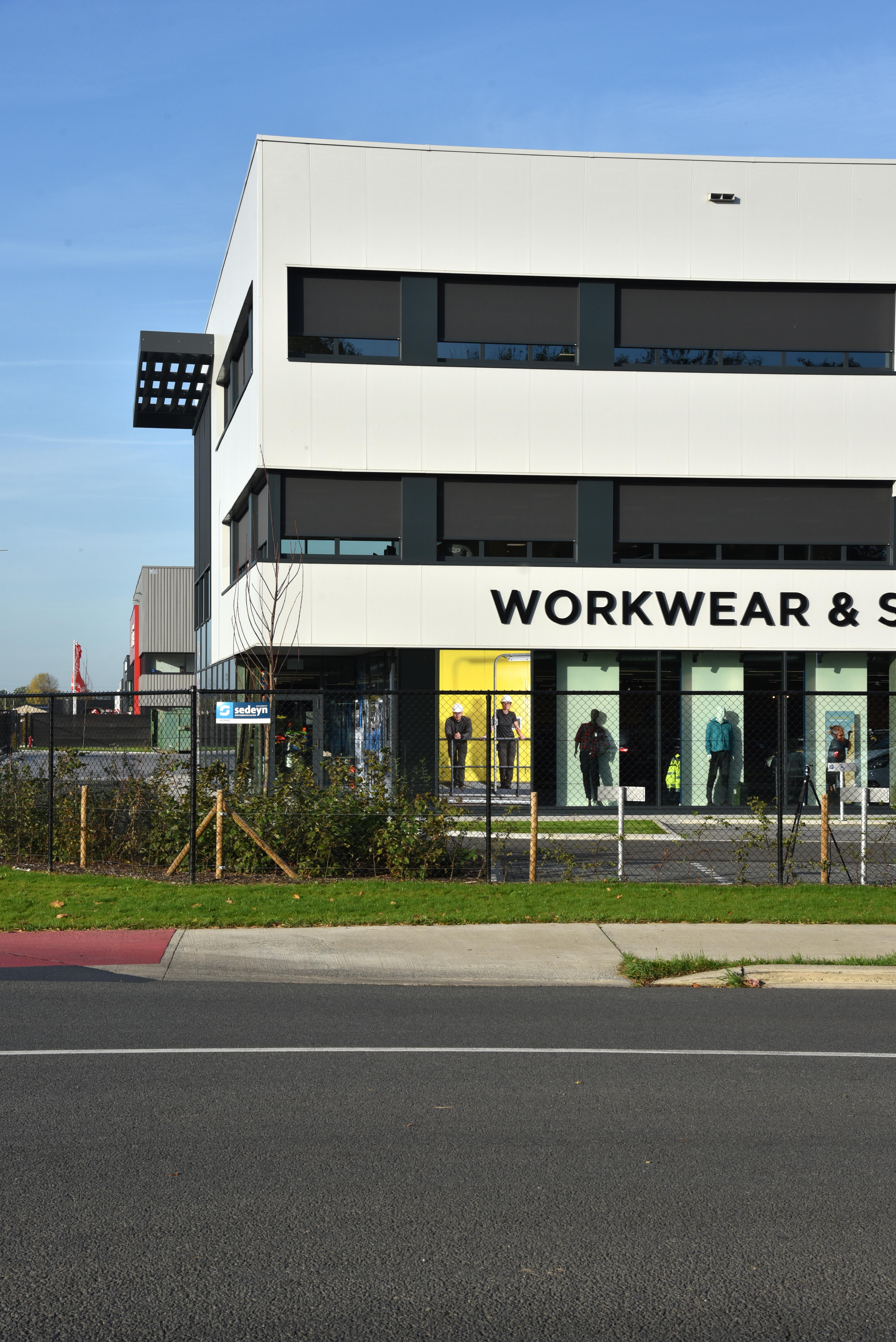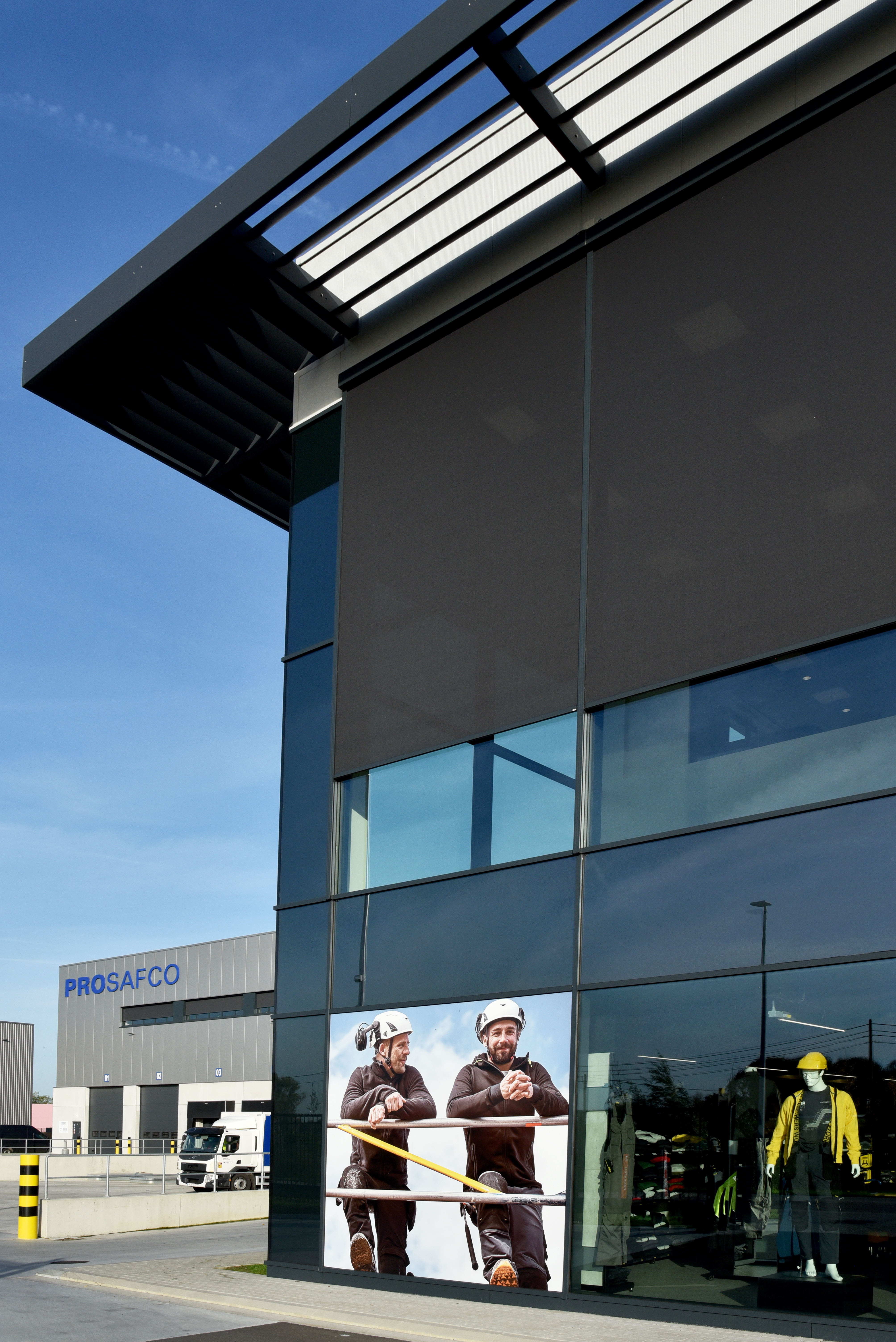 Prosafco est une entreprise de premier plan à Roeselare et un spécialiste des vêtements de travail et de la sécurité. Grâce à son expertise et à sa large gamme de vêtements de travail, de chaussures de travail, de gants et d'autres équipements de protection individuelle, elle aide les professionnels à rentrer chez eux sans se blesser, jour après jour. Pour protéger les employés de bureau de la surchauffe et des rayons de soleil aveuglants, la façade du bâtiment a été équipée d’une protection solaire en toile DucoScreen Front 150 Curtain Wall.