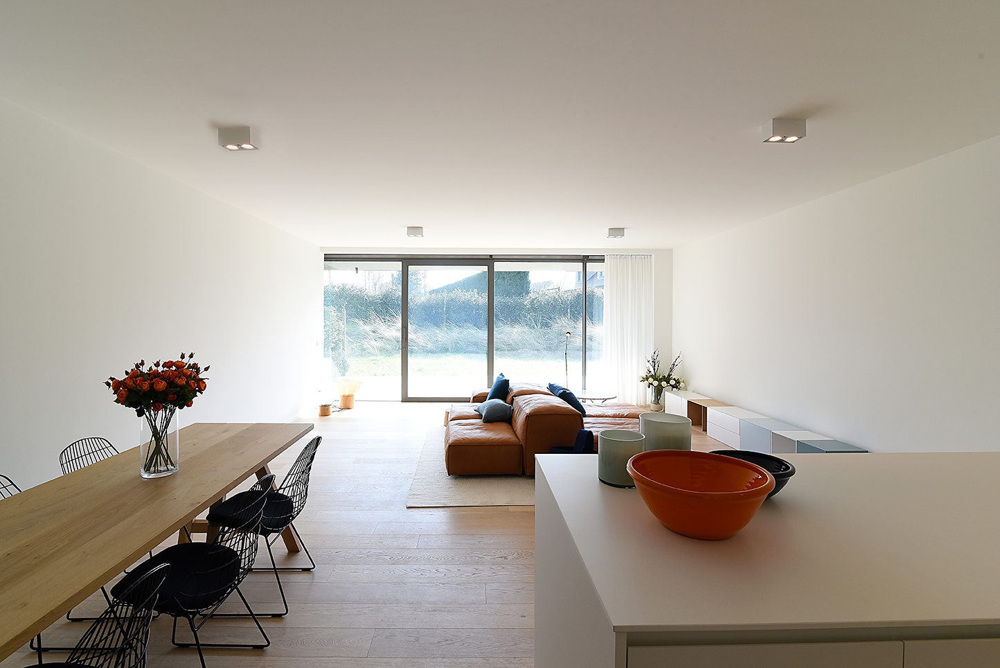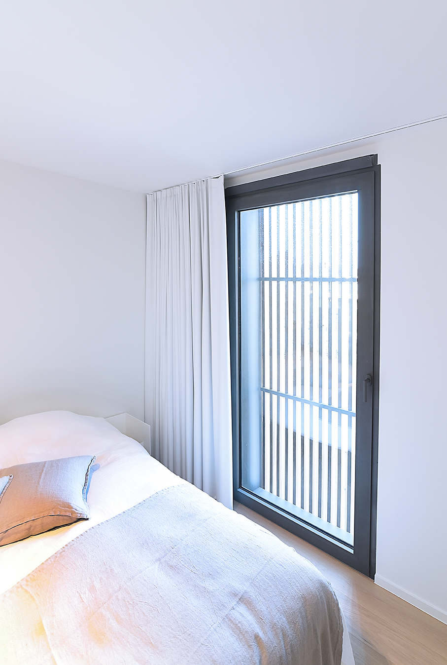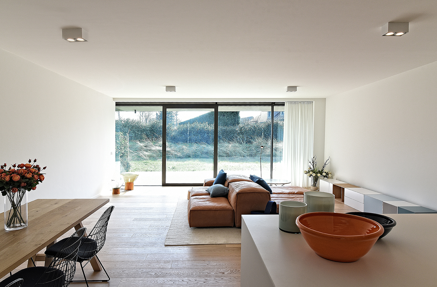 Les aérateurs ont été intégrés discrètement dans les profils de fenêtre, gage de la sobriété du design. « Dans cette résidence, une multitude d'aérateurs non fonctionnels ont également été intégrés car le nombre d'aérateurs nécessaire pour assurer la ventilation n’était pas très élevé. On arrive ainsi, tant de l’extérieur que de l’intérieur, à une uniformité esthétique dans cette structure minimaliste », ajoute Stevens.