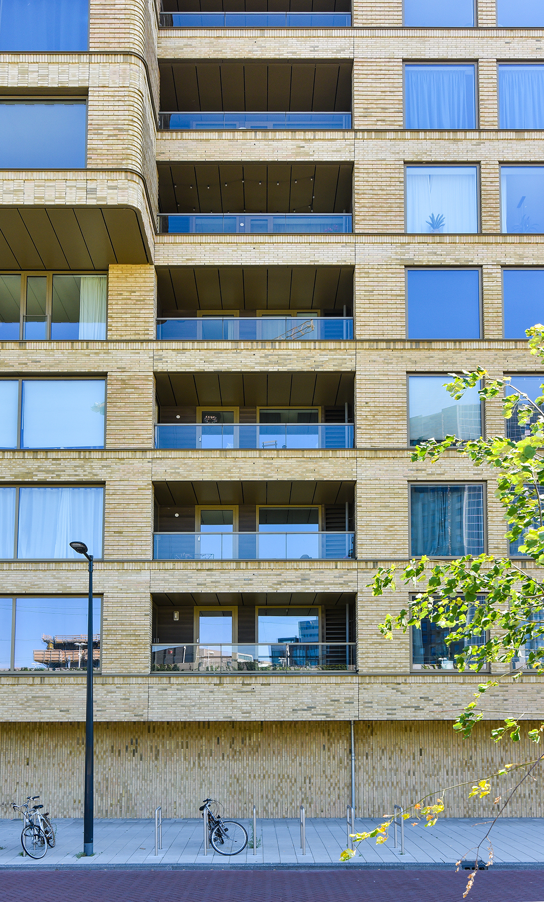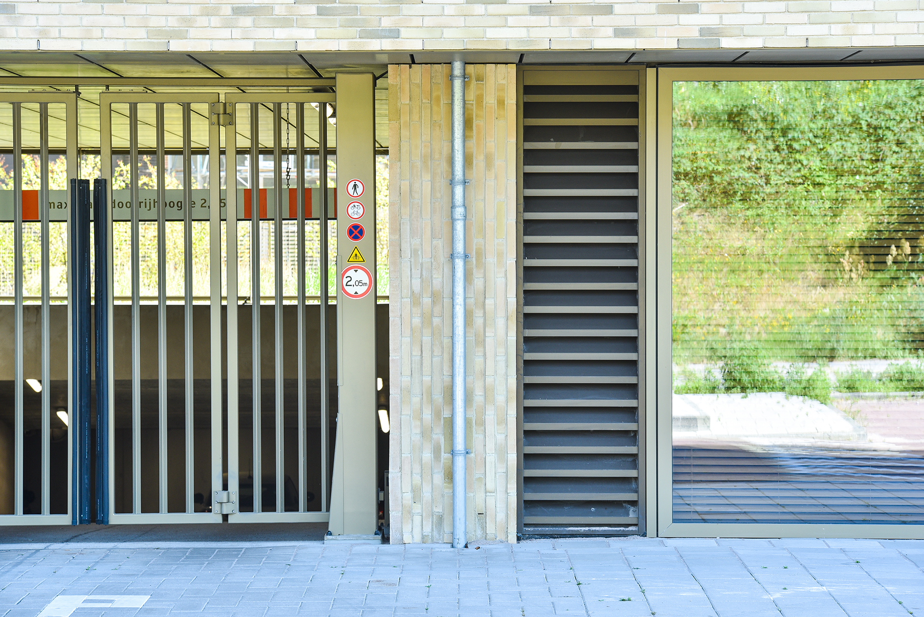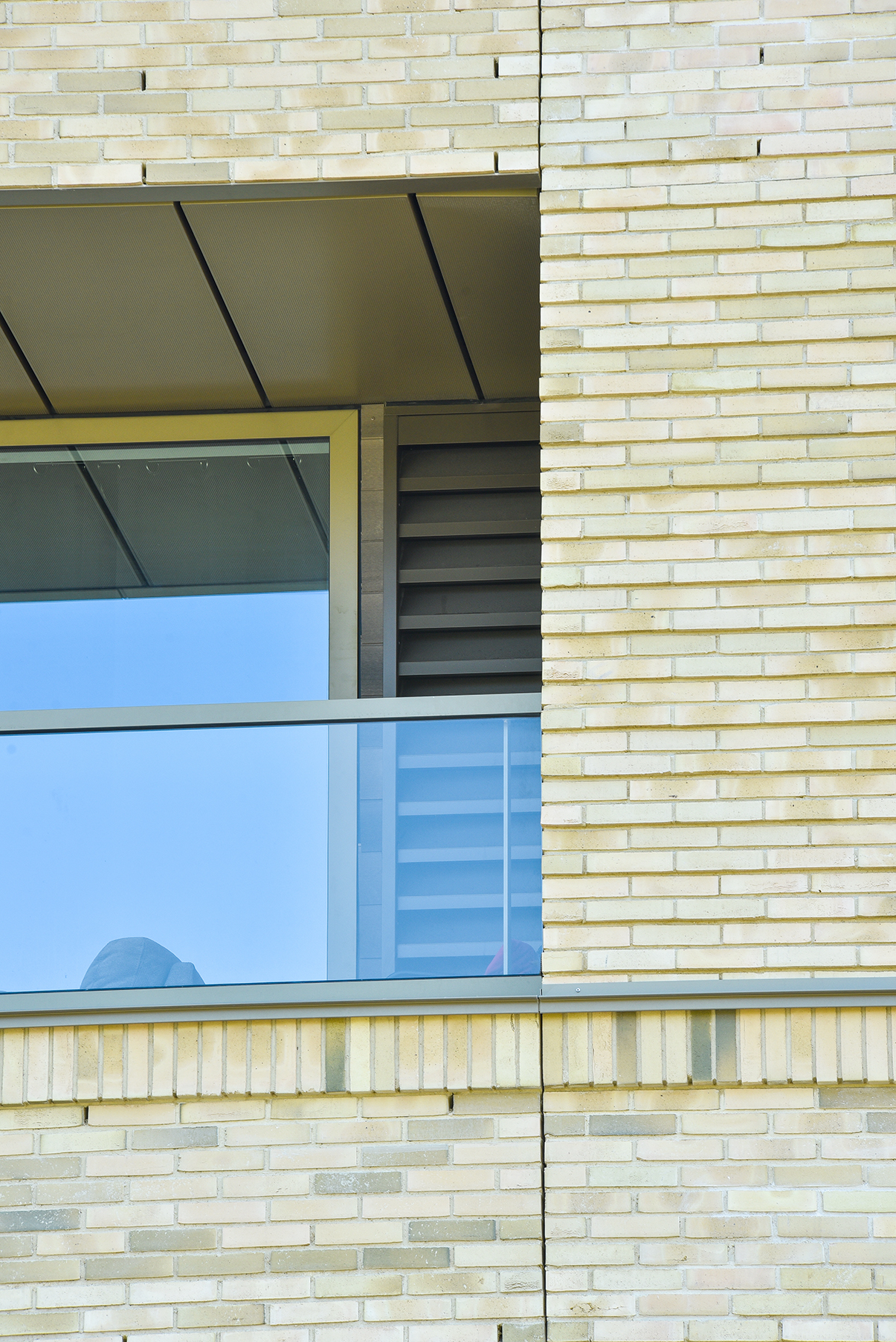« Un espace extérieur anti-bruit n’était pas obligatoire, mais une façade anti-bruit bien. Étant donné qu’une façade aveugle n’est pas requise, différentes alternatives purent être envisagées. On observe une nette préférence pour les grilles murales acoustiques par rapport aux solutions traditionnelles comme les balcons cloisonnés ou les écrans isophoniques pour bâtiment. ZZDP Architecten a décidé d’intégrer dans la façade lisse de la maçonnerie de première qualité. Les grilles sont dès lors intégrées dans les façades qui jouxtent les vérandas.