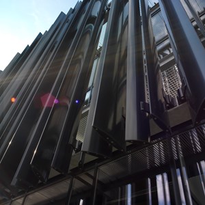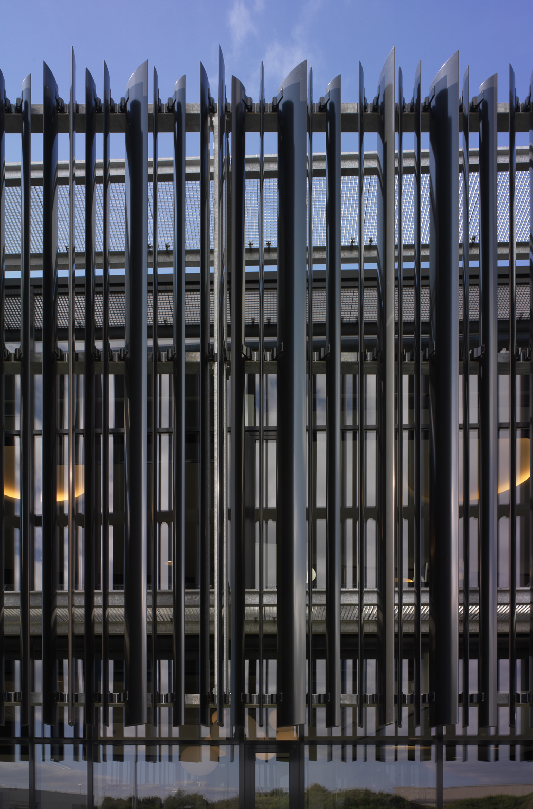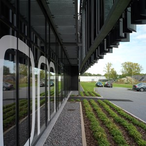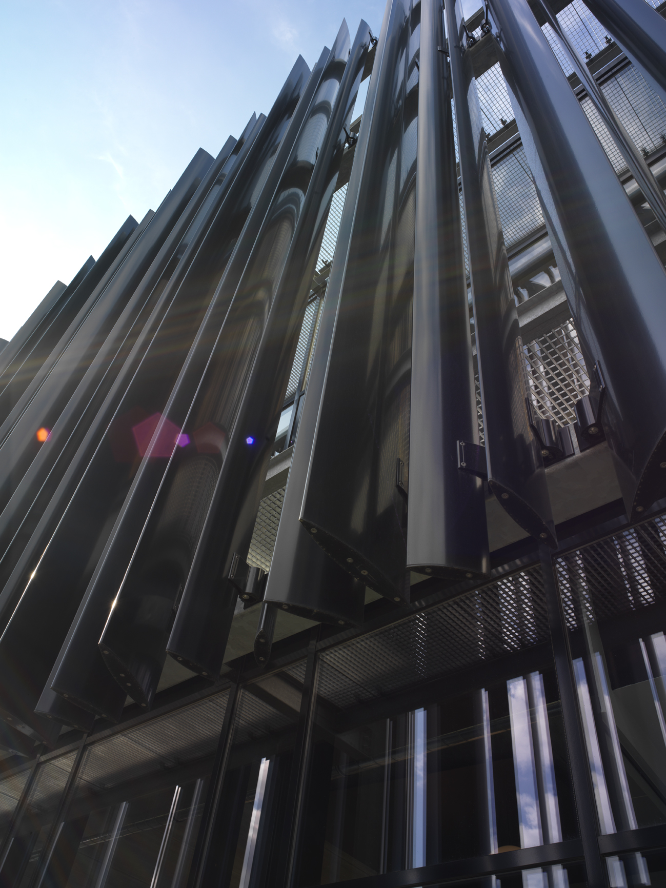 DUCO a doublement contribué à ce projet avec sa protection solaire architecturale, tant sur le plan fonctionnel qu’esthétique. Le DucoSun Ellips avec – comme son nom l’indique – ses lamelles ellipsoïdales a été monté dans divers formats (150-200-300) verticalement devant la façade. L’application de divers formats a créé un effet ludique et la façade est devenue un authentique eyecatcher visuel. La conception s’est inspirée de la forme d’un code-barres.