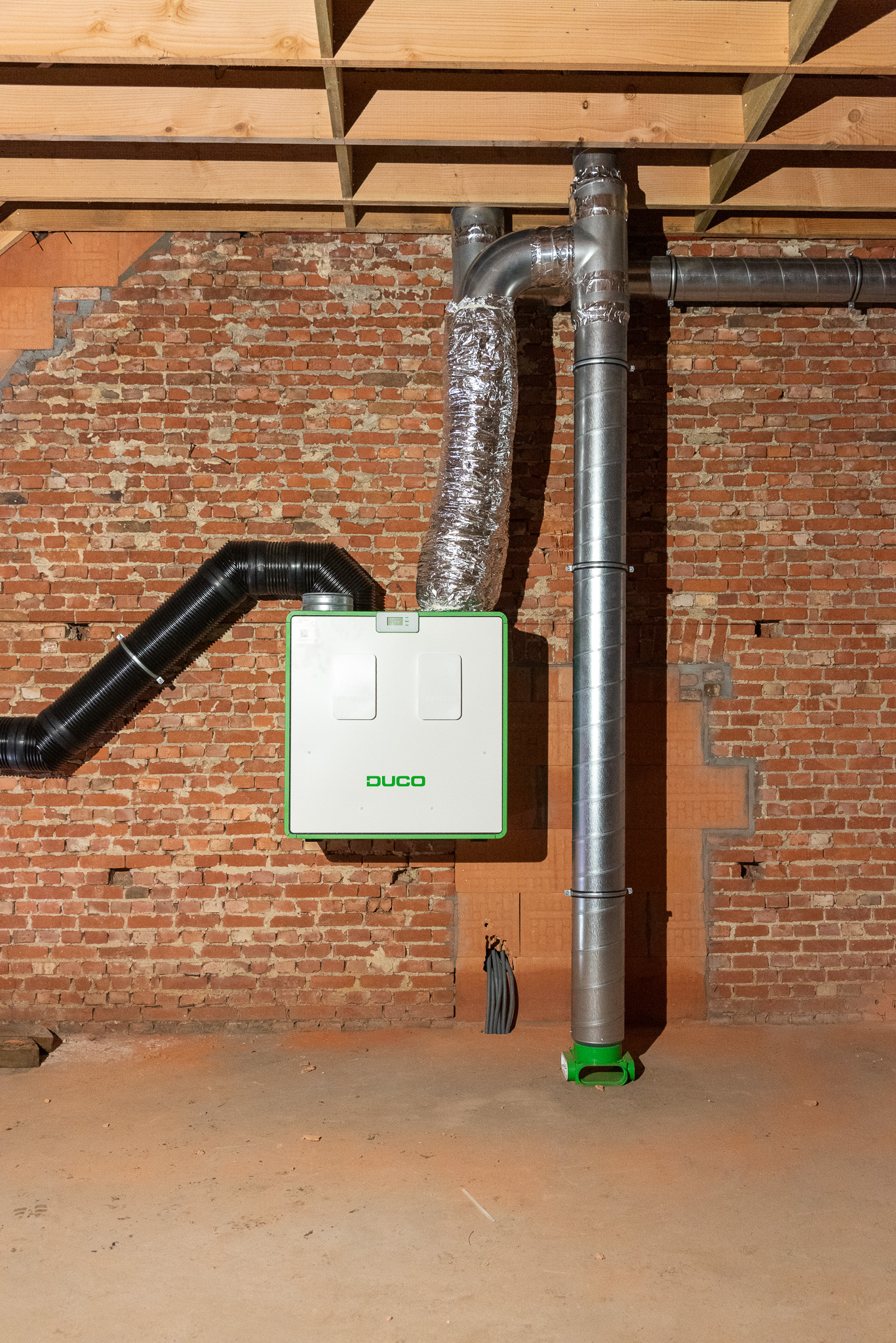 In de eerste fase van het project werden de DucoFlex luchtkanalen geïnstalleerd. Dit complete en installatievriendelijke luchtkanalensysteem is ontworpen voor zowel Systeem C als D. Dankzij het handige ‘Click & Go’-principe en het minimale gebruik van hulpstukken verliep de installatie snel en efficiënt. Dit bood de installateurs de nodige flexibiliteit, vooral gezien de uitdagingen van een renovatieproject waar men met bestaande bouwstructuren rekening moet houden.