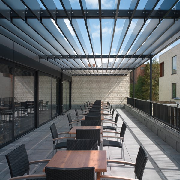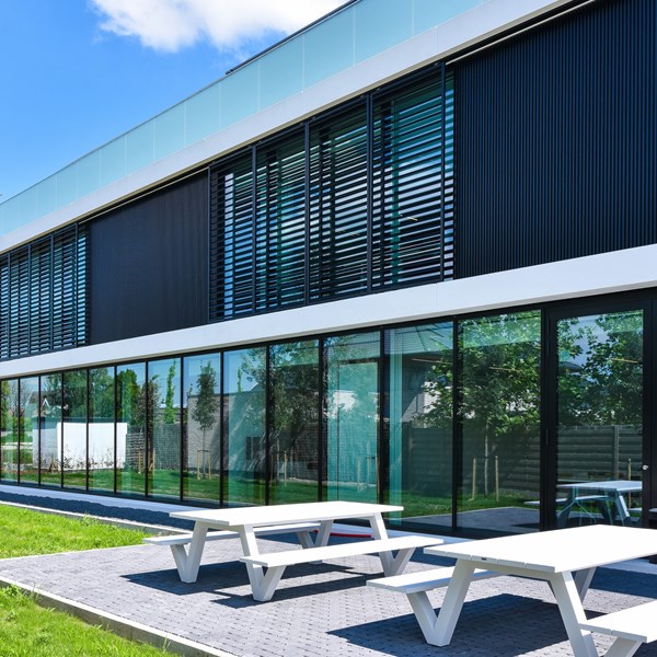 Dankzij het architecturale zonweringsysteem beschikt dit gebouw over een gezond en comfortabel binnenklimaat
