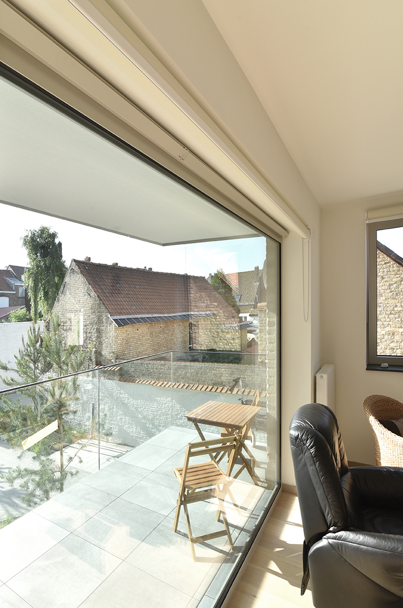 Binnenin de woningen zijn energiezuinige gasverwarmingen geïnstalleerd. Deze werden occasioneel aangevuld met gaswarmtepompen. Ook PV-panelen zijn aanwezig op de woning. “Het ontwerp houdt de middenweg tussen energiezuinige en betaalbare technieken om te voldoen aan de EPB-eisen”, gaat Sebastiaan verder. “Ook een duurzaam ventilatiesysteem met slimme vraagsturing hoort hierbij”. Omwille van beperkingen in hoogte en ruimte, werd geopteerd voor een compacte en efficiënte oplossing. Het Duco Focus System werd uitgerust met de ventilatiebox DucoBox Focus en met DucoTop 60, de voorganger van het TopVent ZR toevoerrooster.