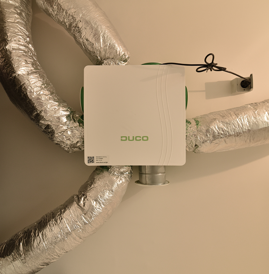 In de gemeenschappelijke ruimtes werd op verschillende plaatsen onze DucoBox Energy Premium voorzien. Dit is een balansventilatiesysteem die mechanisch vervuilde lucht afvoert van de gemeenschappelijke delen. Ook de toevoer van verse lucht verloopt mechanisch, in tegenstelling tot een C-systeem. Hierbij is er sprake van warmterecuperatie uit de afgevoerde lucht en wordt deze warmte overgedragen aan de toegevoerde lucht.