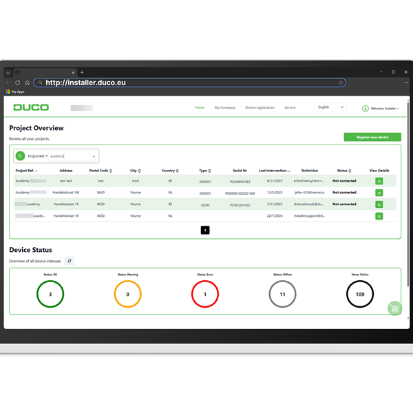 In de overkoepelende Duco Installer Portal beheer je al je projecten, bekijk je foutmeldingen en raadpleeg je de volledige servicegeschiedenis.