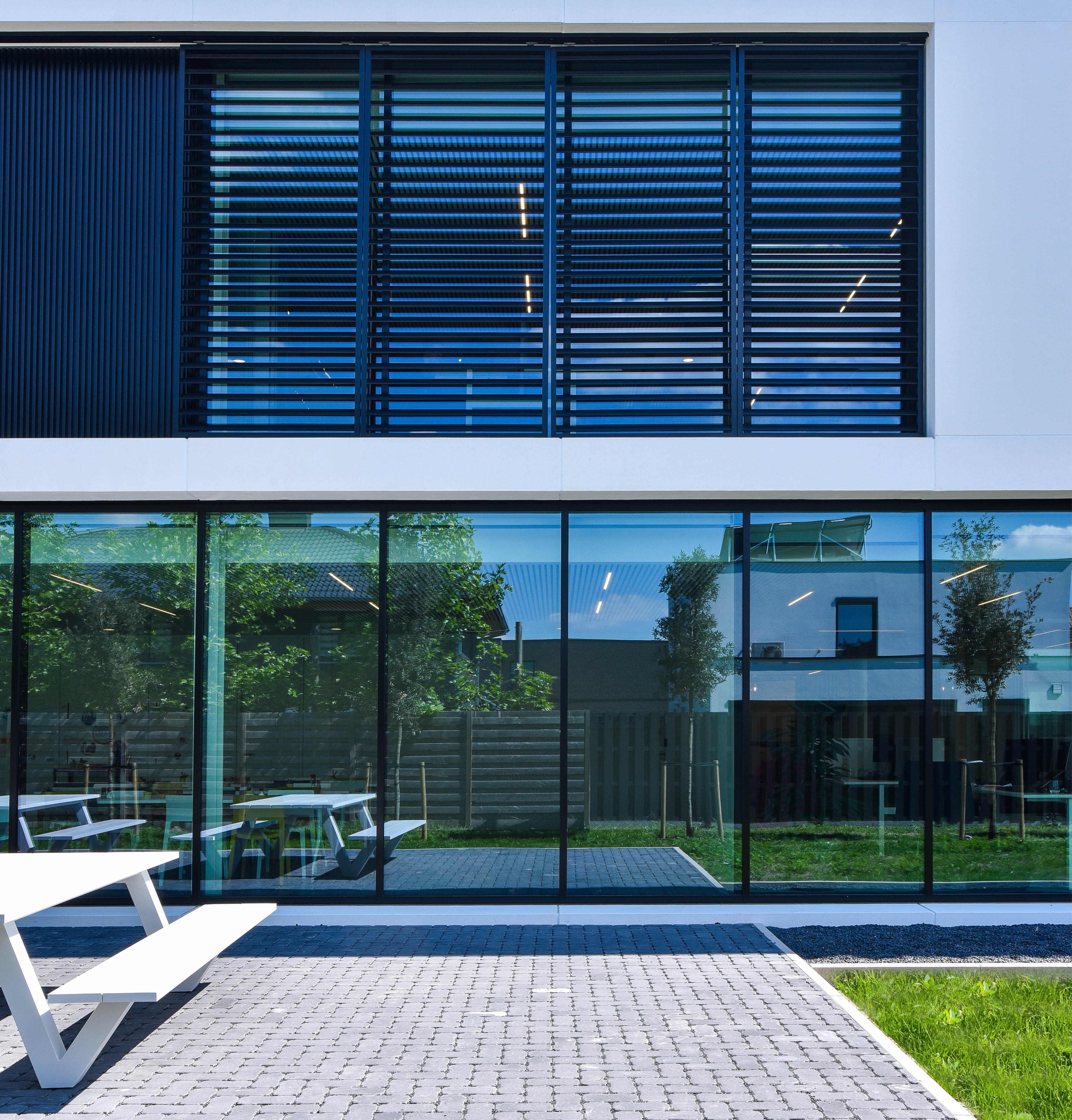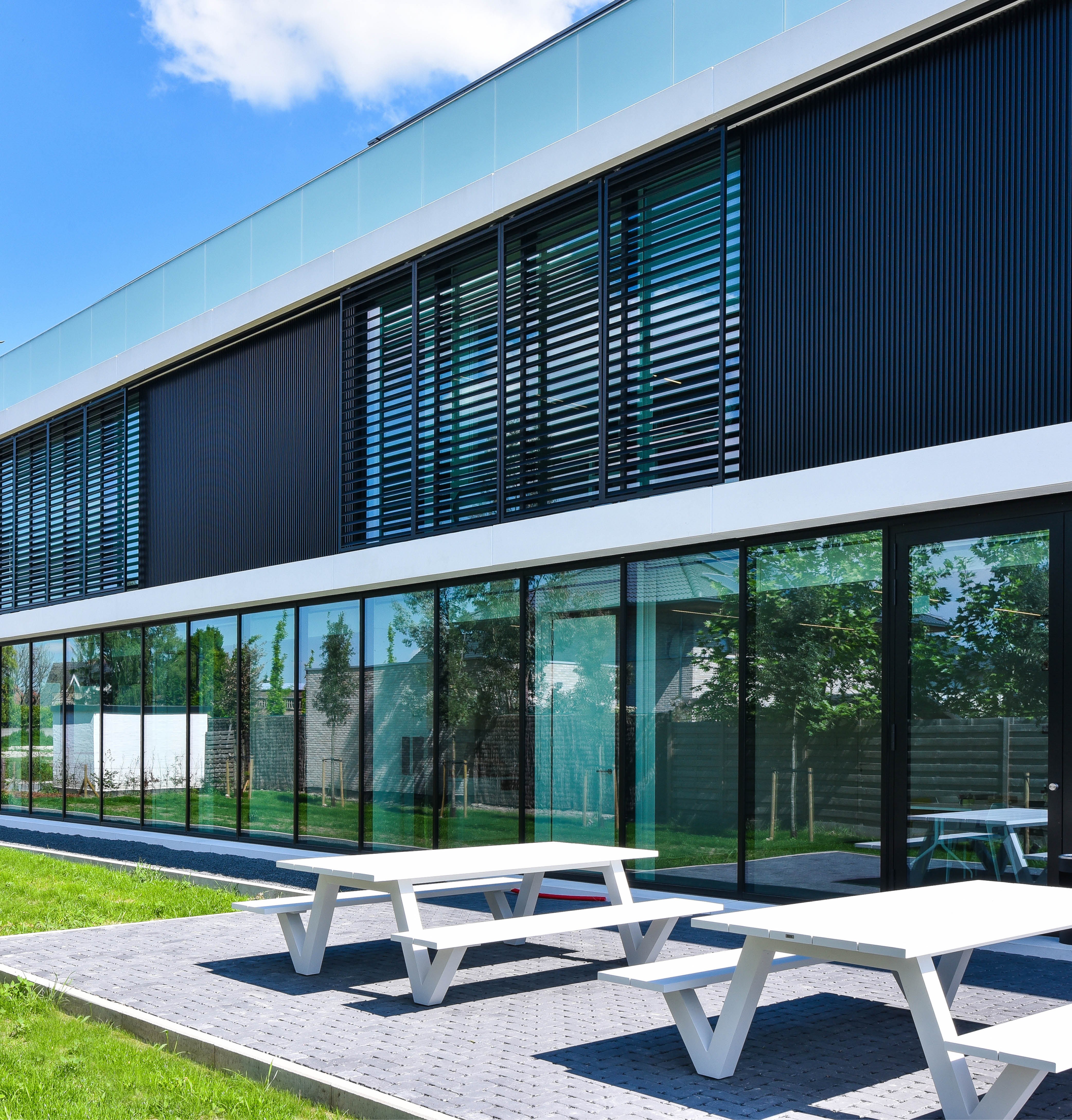 Net zoals thuis wilt u ook op kantoor geen hinder ondervinden van de zon. Dat begrijpt ook projectontwikkelaar G-Label uit Melle, dat duurzame en architecturale projecten creëert en ontwikkelt. Keuze ging uit naar de architecturale zonwering DucoSlide LuxFrame. Een extern zonweringsysteem met schuifpanelen.