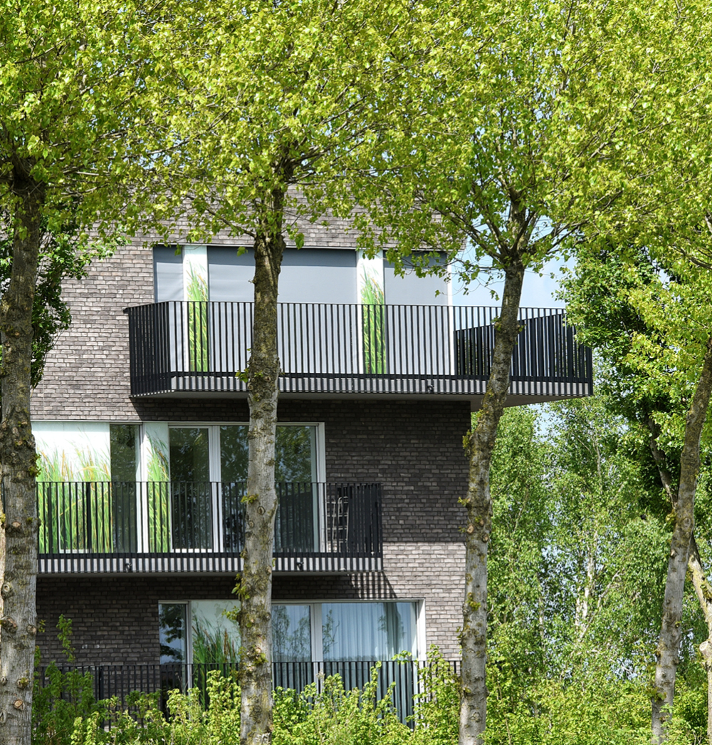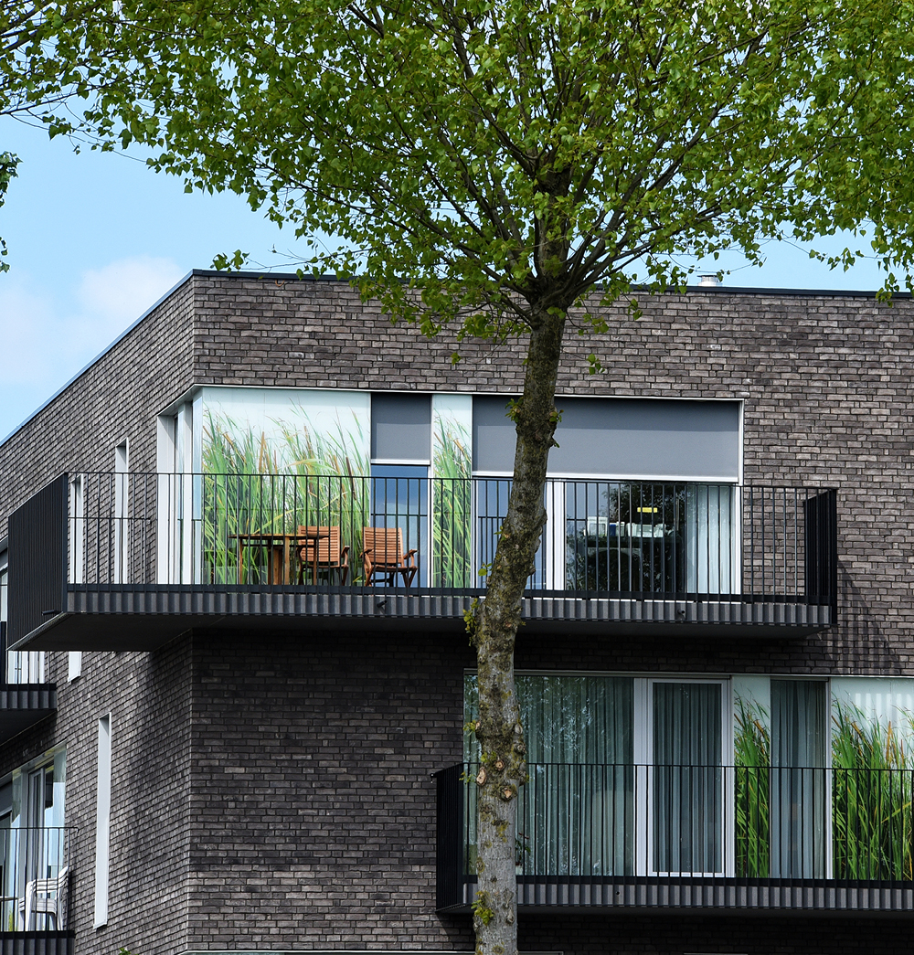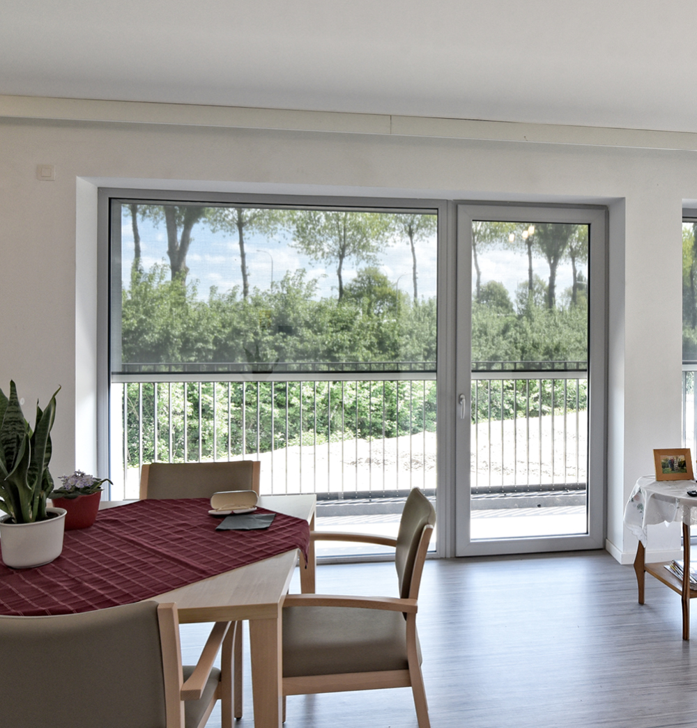 De strakke pvc-ramen van alle nieuwe zorgflats werden met deze gezonde, energiezuinige en esthetische oplossing uitgerust. “DucoScreen Front 150 wordt in de spouw geplaatst en is dus volledig onzichtbaar, maar kan wel eenvoudig via een klepje aan de onderzijde onderhouden worden”, vult Himpe verder aan. “Aan de buitenzijde is dan weer enkel het doek en de geleider zichtbaar. Bij dit project werden de ramen echter verder afgewerkt met passende glaspartijen die de geleiders aan het oog onttrekken.”