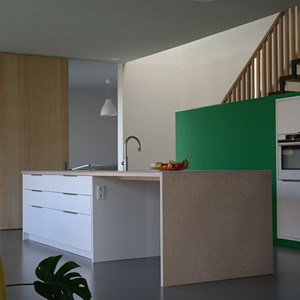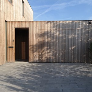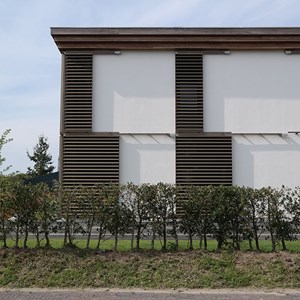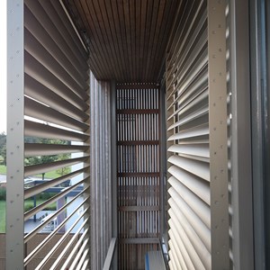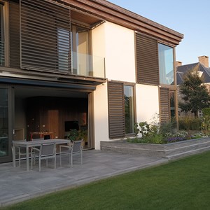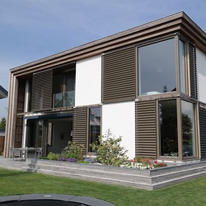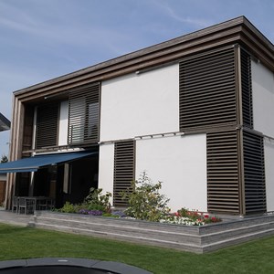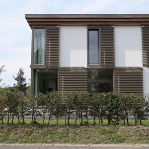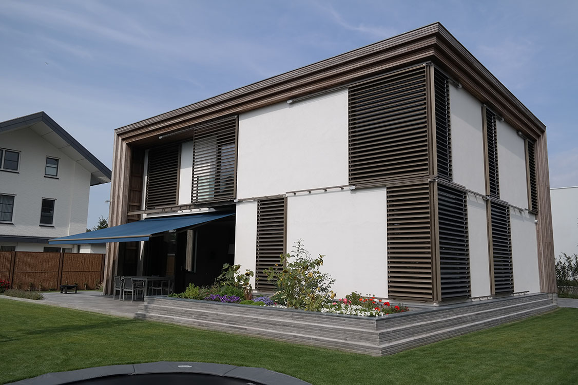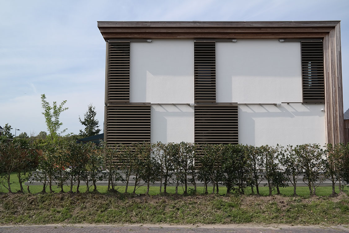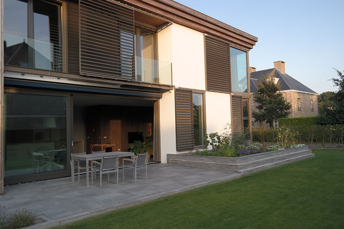 “De DucoSlide schuifluiken bezorgen de gevels een dynamische uitstraling”, legt Goedemans uit. “De open en dicht schuivende panelen laten flinke zontoetreding in de winter toe, zodat het huis deels passief verwarmd wordt, maar voorkomen oververhitting in de zomer. Zo krijgt het huis twee gezichten: hout enerzijds en stuc met schuifpanelen anderzijds. De horizontaal geplaatste lamellen zorgen tevens voor behoud van daglicht en garanderen maximale privacy.”
