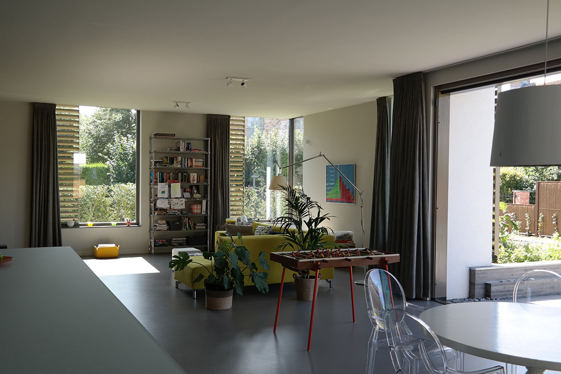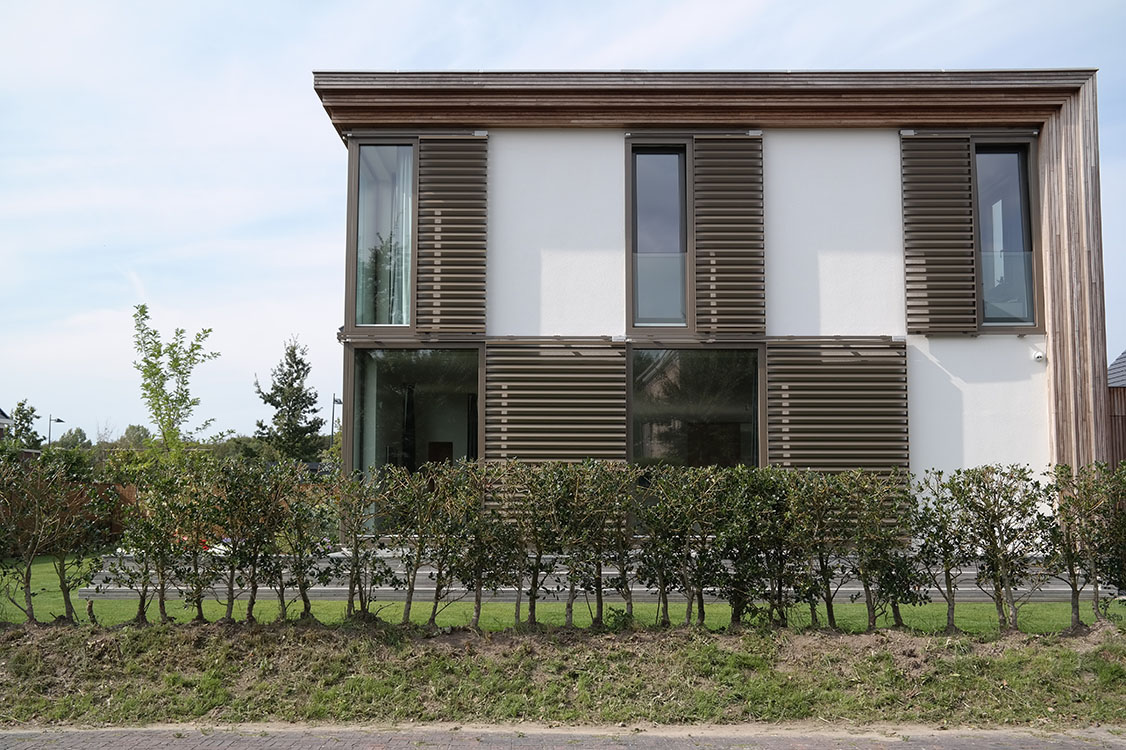 “Energiezuinig, ja! Maar niet ten koste van comfortabel wonen en een gezond binnenklimaat”, stelt Goedemans. “Natuurlijk daglicht halen we maximaal binnen via de zuidoost- en zuidwestgevels. Een goede aanpak van zoninstraling is noodzakelijk. En hier komt zonwering op het voorplan. Om ons huis als zonnecollector te laten functioneren kozen we voor aluminium schuifpanelen met lamellen. Grote dakoverstekken om oververhitting in de zomer te voorkomen vinden we namelijk onwenselijk, vanwege de beperkte lichtsterkte op bewolkte dagen in de wintermaanden.