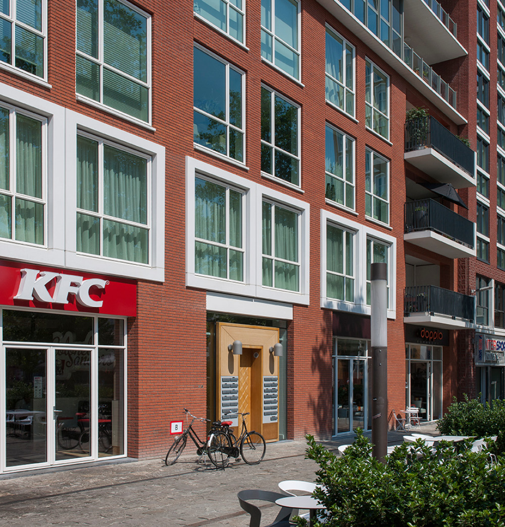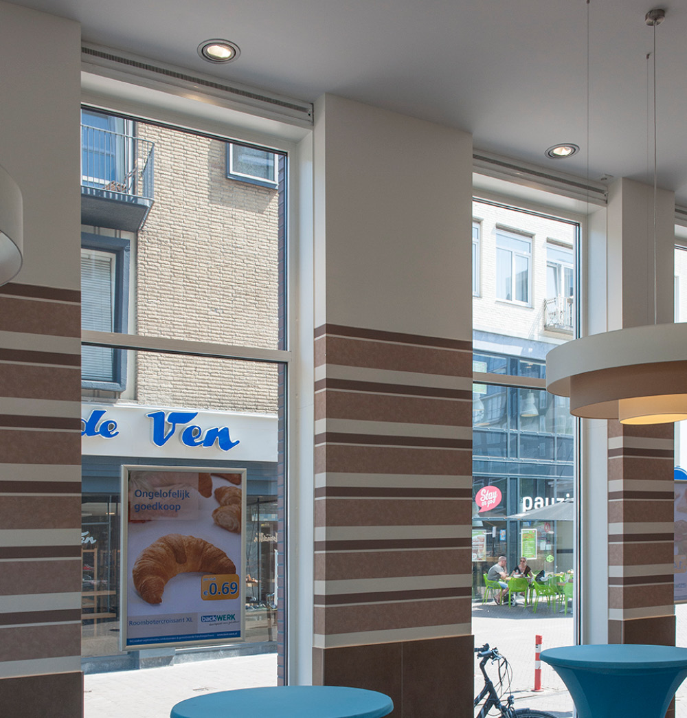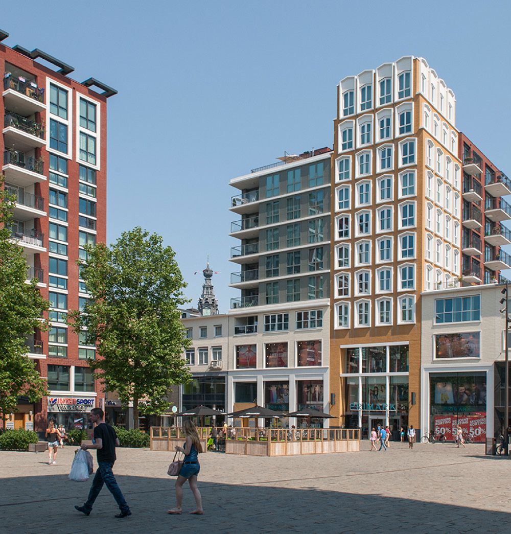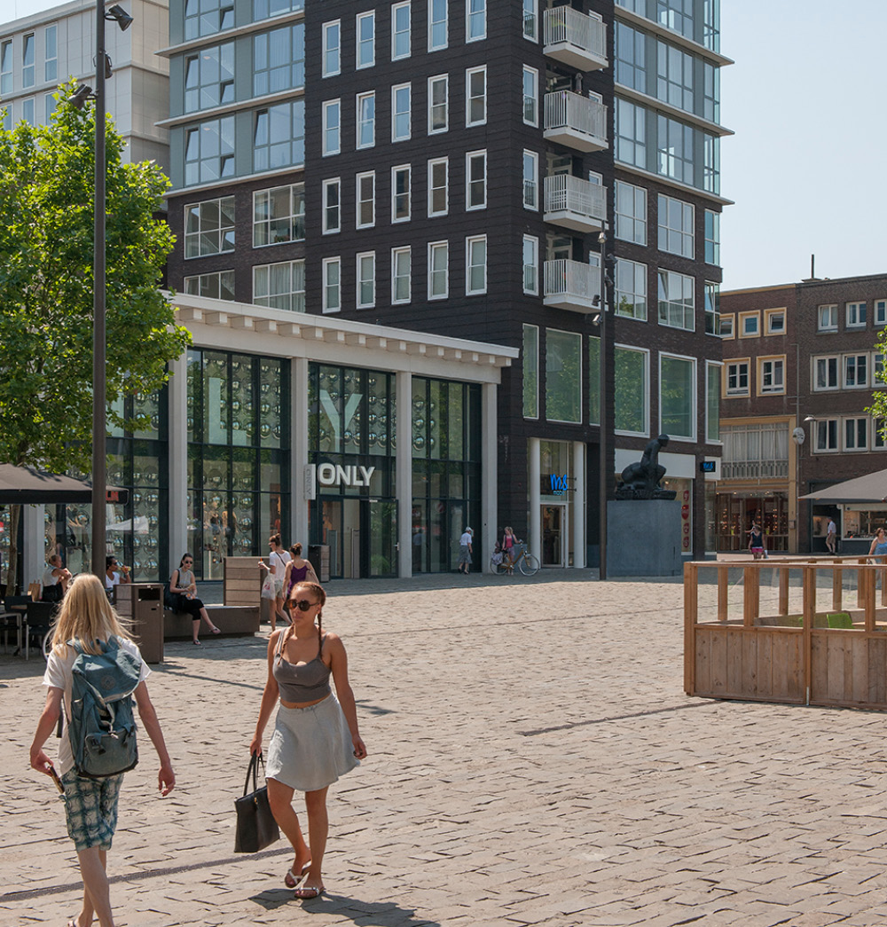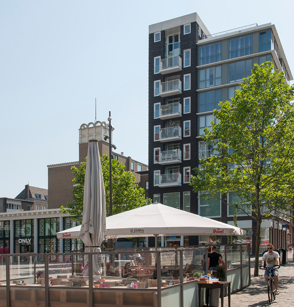 Zo werd het plein zelf volledig onder handen genomen en ingericht met een ondergrondse parking, podia, banken, tafels en veel groen. Daarnaast werd een groot deel van het plein door nieuwbouw vervangen. Maar liefst 11.000 m2 winkels, horeca- en uitgaansgelegenheden, en meer dan 110 appartementen werden rondom het plein opgetrokken. En net daar leverde DUCO zijn bijdrage aan het verhaal. Dankzij de integratie van DucoFit 50 ‘ZR’ voorzag DUCO zowel de nieuwbouwwoningen als de handelszaken van natuurlijke luchttoevoer. Doordat dit zelfregelende ventilatierooster ‘onzichtbaar’ achter de gevel kan worden geplaatst – compacte kalfplaatsing – en doordat het bijzonder eenvoudig en snel te plaatsen is, was de keuze voor dit type rooster snel gemaakt.