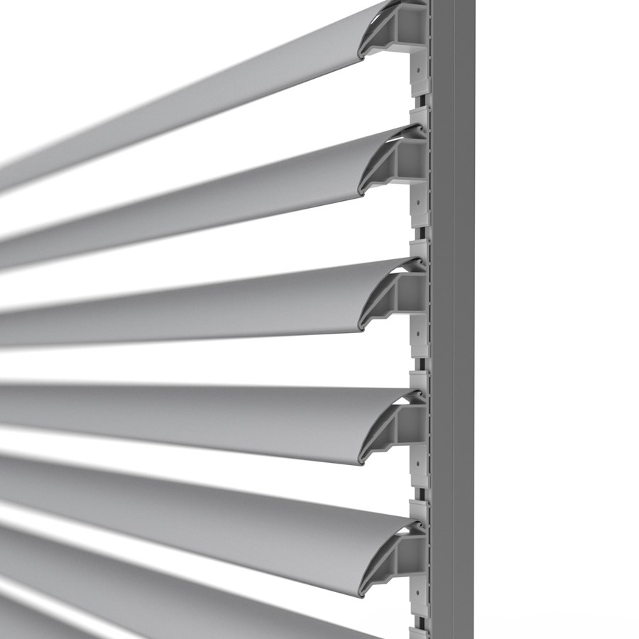 DucoSun 95 C Verticaal is een extern permanent zonweringsysteem met vaste C-vormige lamellen.