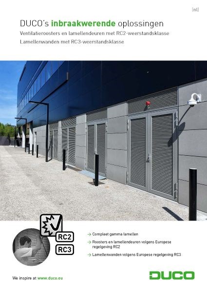 DUCO ontwikkelde een breed en vernieuwend gamma van lamellenwandsystemen: waterwerend, met hoge ventilatiecapaciteit, geluiddempend... Voortaan kan elk type lamellenwand inbraakwerend* worden uitgevoerd, door deze te voorzien van DUCO’s gepatenteerde oplossing. Hierdoor voldoet de lamellenwand aan RC3‑weerstandsklasse volgens de Europese norm. Deze compacte oplossing zorgt er bovendien voor dat de inbouwdiepte van de RC3 lamellenwand gelijk blijft in vergelijking met de standaard lamellenwanden, wat een uniform gevelbeeld garandeert. Bovendien zijn de lamellenwanden combineerbaar met DucoDoor lamellendeuren die ook inbraakwerend (RC2) uitgevoerd kunnen worden.