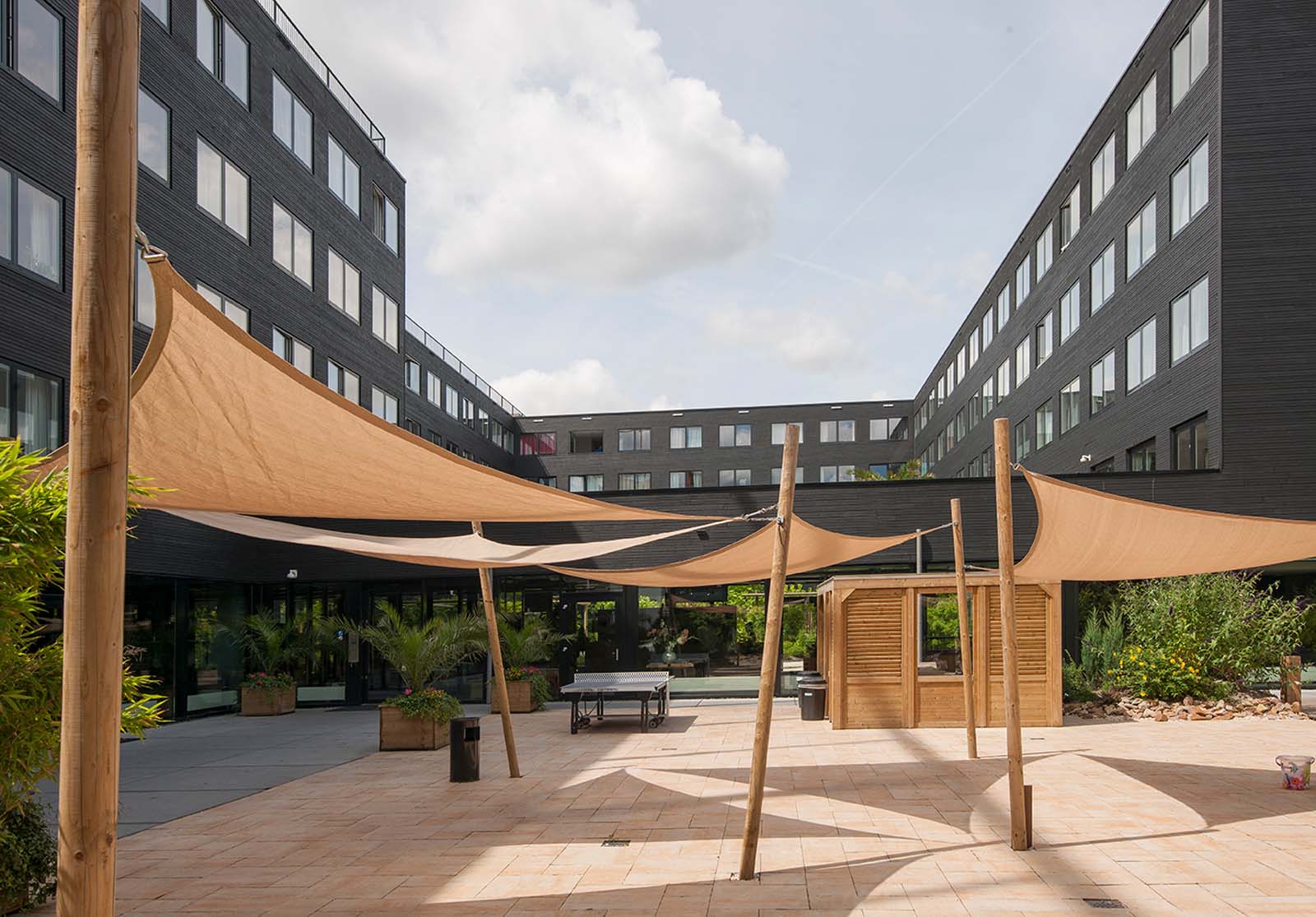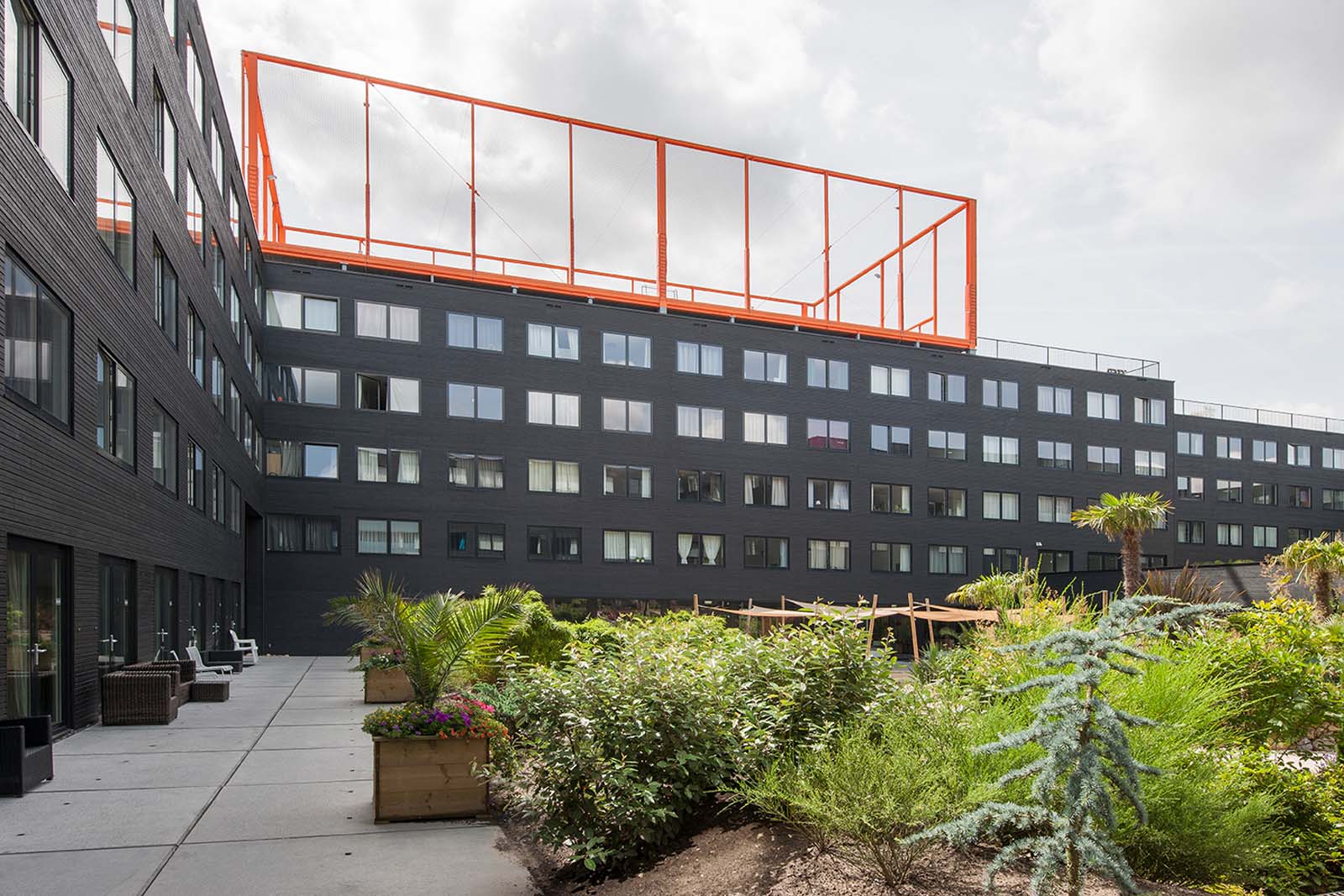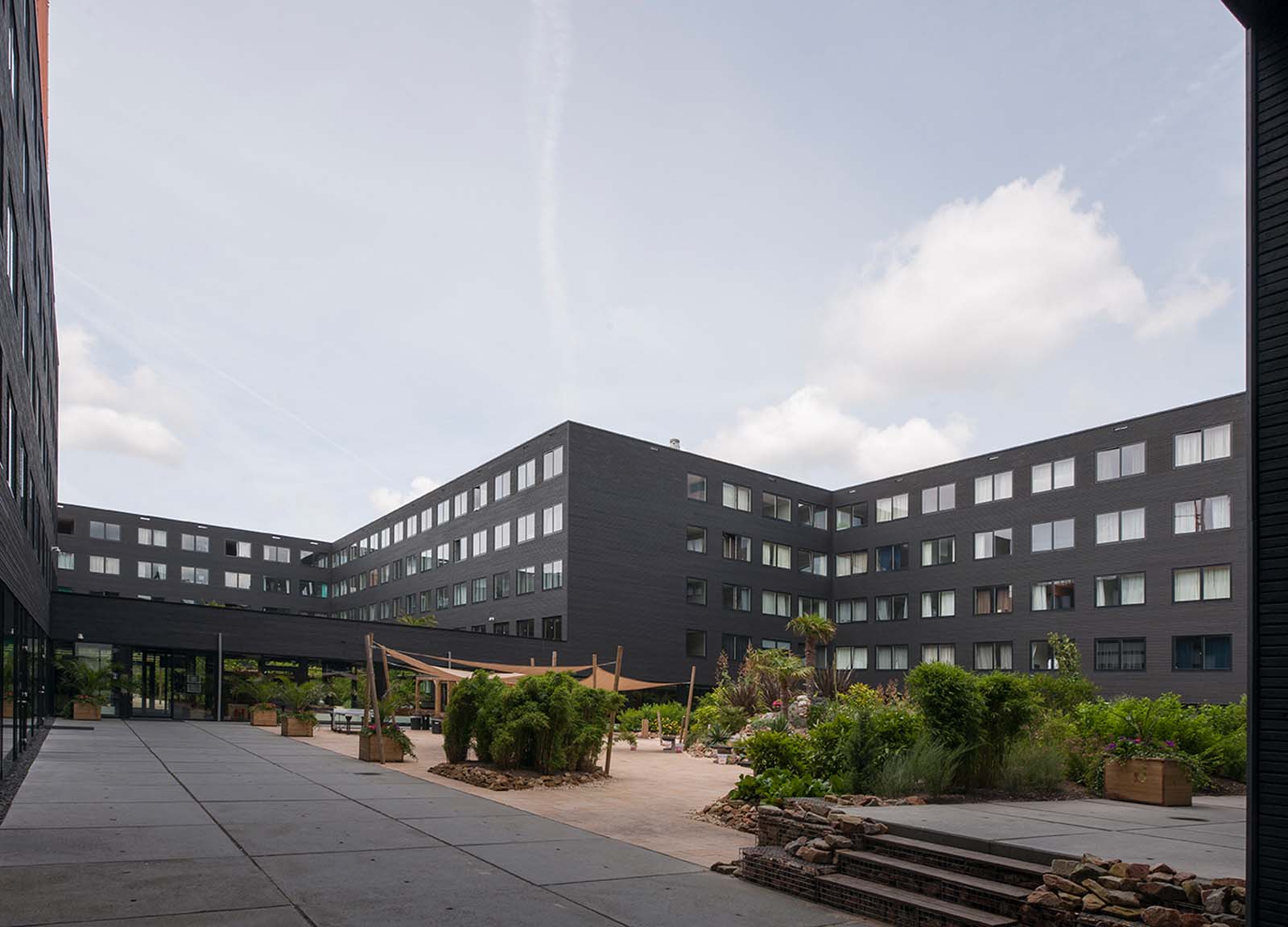 Aan het woord is Marlies Zwols, marketing- en communicatiemanager bij architectenbureau OZ: “Met vijf verdiepingen, bestaande uit 800 onafhankelijke studentenappartementen en voorzieningen zoals onder meer een café, lounge, wasserette alsook een basketbalterrein en moestuin die beide zijn gelegen op het dak, kan Ravel Residence het best worden vergeleken met een klein dorp. Het is dankzij deze boeiende mix van diverse functies dat jonge mensen hier van het leven kunnen genieten en werken in een stedelijke, maar eveneens groene omgeving. Bovendien kunnen de ruimtes gemakkelijk van functie veranderen door het modulaire bouwsysteem, wat toch vrij uniek is.”