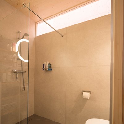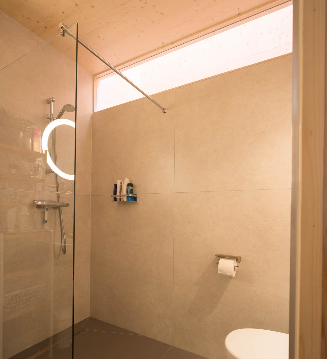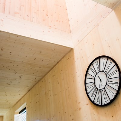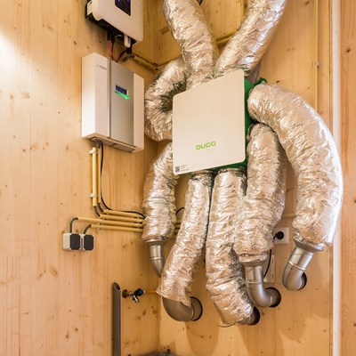 Van den Noort: “De zonneschoorsteen wordt gebruikt voor zomernachtkoeling, in combinatie met DucoGrille Solid roosters (++ M 30Z) voor draai/kiepramen. Na een warme zomerdag kan de hele woning eenvoudig en energiezuinig worden gekoeld door thermische trek.” Hospers vult aan: “Hittestress komt steeds vaker voor, mensen krijgen hun woning gewoon niet meer koel, terwijl ze er wel behoefte aan hebben. Wij bouwen met lichte massa, dat zorgt ervoor dat de warmte niet in het gebouw blijft zitten. In combinatie met de zomernachtventilatie zorgt het ervoor dat je deze woning wel op een energiezuinige manier koel kunt houden.”
