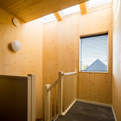 De uitdaging was om op een beukmaat van 5.40 meter alle maatschappelijke vraagstukken die er spelen integraal op te pakken. Met de bewoner centraal en met een prijs die bij sociale woningbouw past. Hospers: “We zijn simpelweg begonnen door op te schrijven wat er maatschappelijk allemaal speelt en daar passende antwoorden op te vinden. Je gaat dan kijken wat er beschikbaar is in de markt en verschillende kennispartijen bij elkaar brengen om gezamenlijk tot oplossingen te komen. Zo kwam ook VELUX in beeld. De zonneschoorsteen voor extra daglicht en natuurlijke ventilatie zat al vroeg in het ontwerp. Dan heb je een lichtstraat nodig die open kan en voor natuurlijke trek kan zorgen. En voor dagen waarop natuurlijk ventileren minder comfortabel is, neemt het zon- en CO2-gestuurde ventilatiesysteem (natuurlijke toevoer en mechanische afvoer) van DUCO het over.”