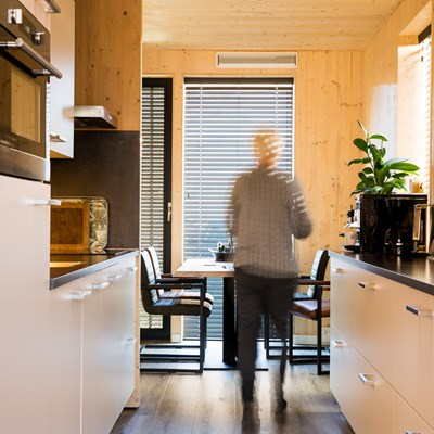 Hospers vult aan: “Door de toevoeging van een schuifdeur, een wand en het draaien van de keuken, kunnen we bovendien eenvoudig een slaapkamer en badkamer realiseren op de begane grond. Dat maakt de woningen erg levensloopbestendig. De woningen zijn nu al smart, onder andere omdat je het licht met je stem of telefoon kunt aansturen. Dit vullen we uiteindelijk ook aan met domotica-oplossingen die mensen kunnen helpen om langer in de woning te blijven wonen.”