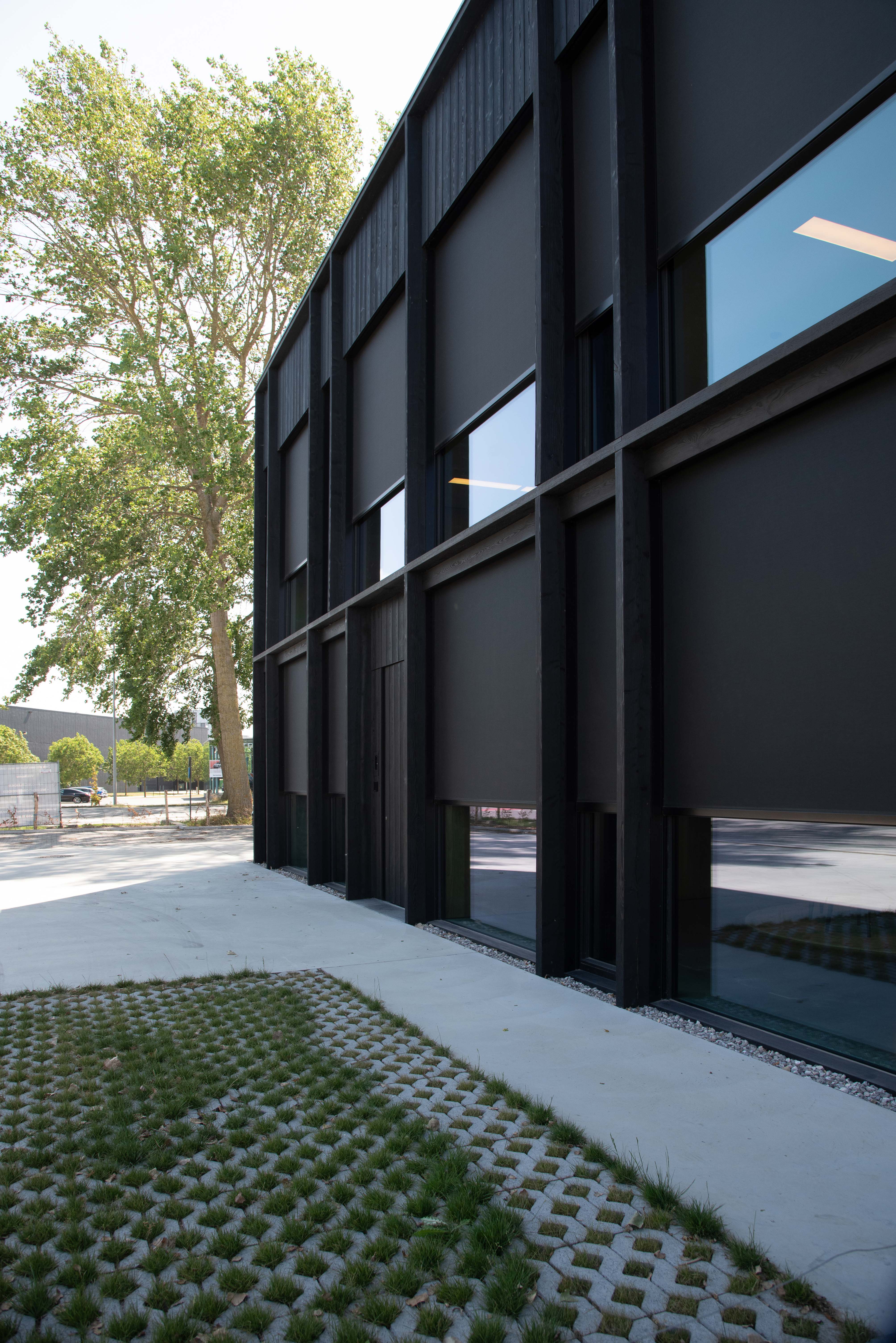 De structurele zwarte DucoScreen Front 150 FIX doekzonwering past perfect bij het zwart, houten schrijnwerk en de betonnen gevel van het bedrijf. Dit was een zeer belangrijke voorwaarde voor Vandamme Houtatelier. Het plaatje moest 100% kloppen.