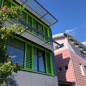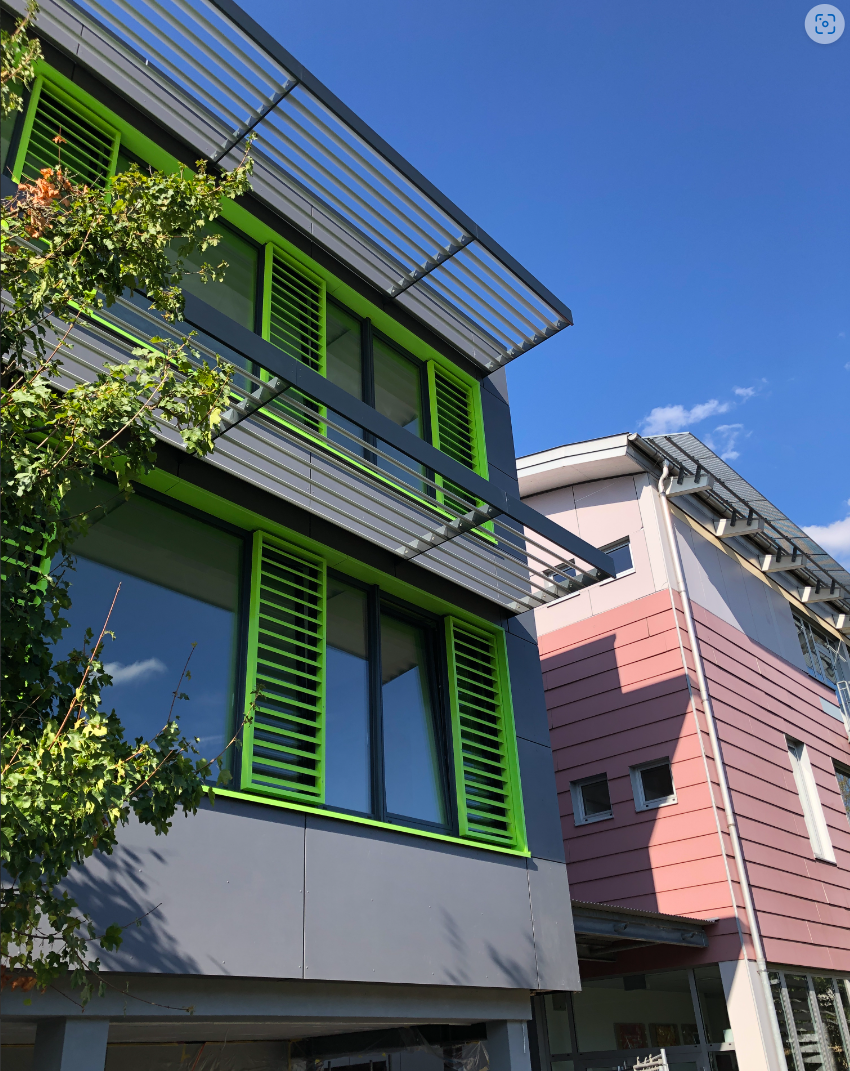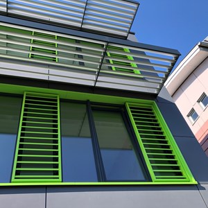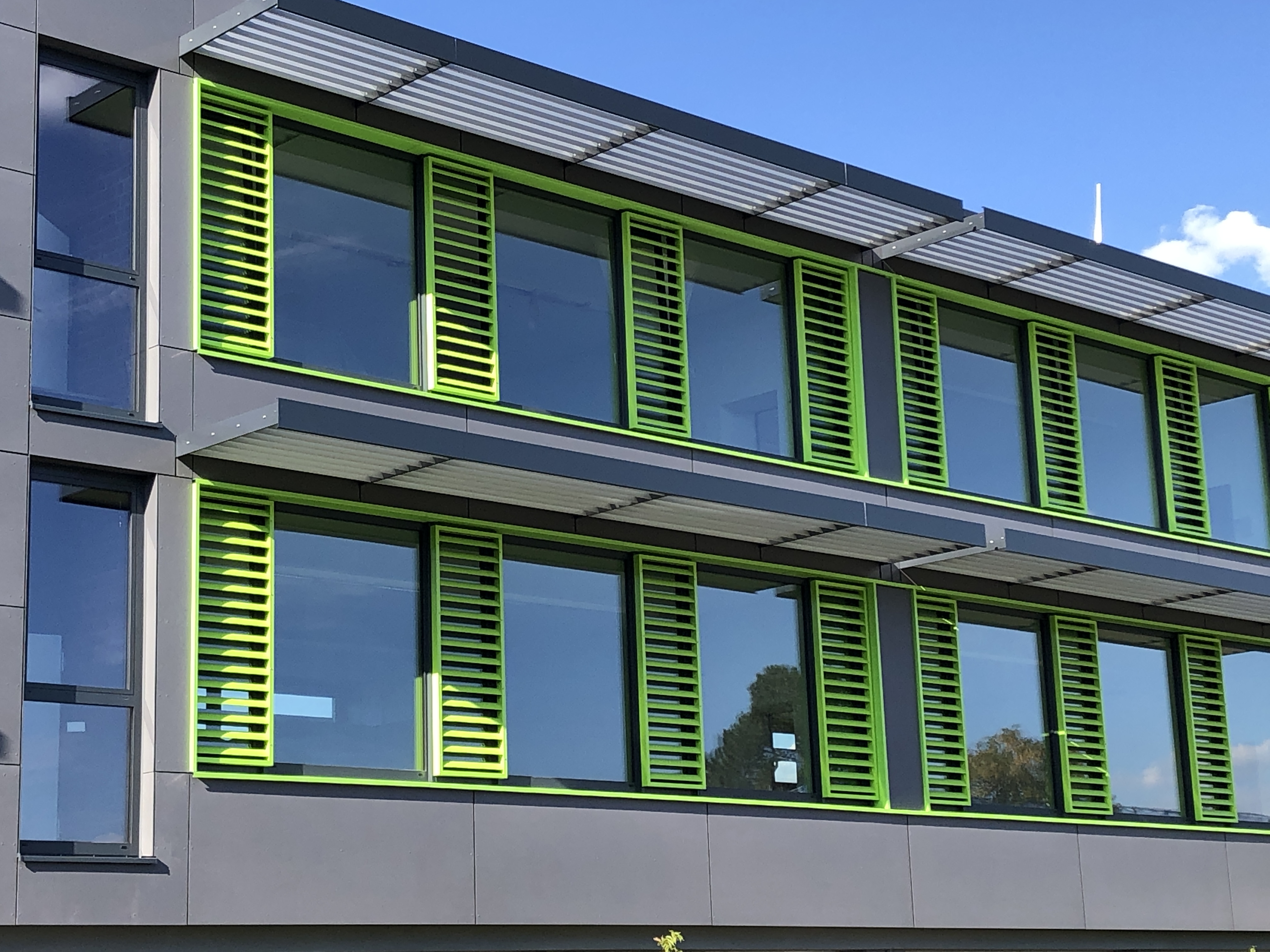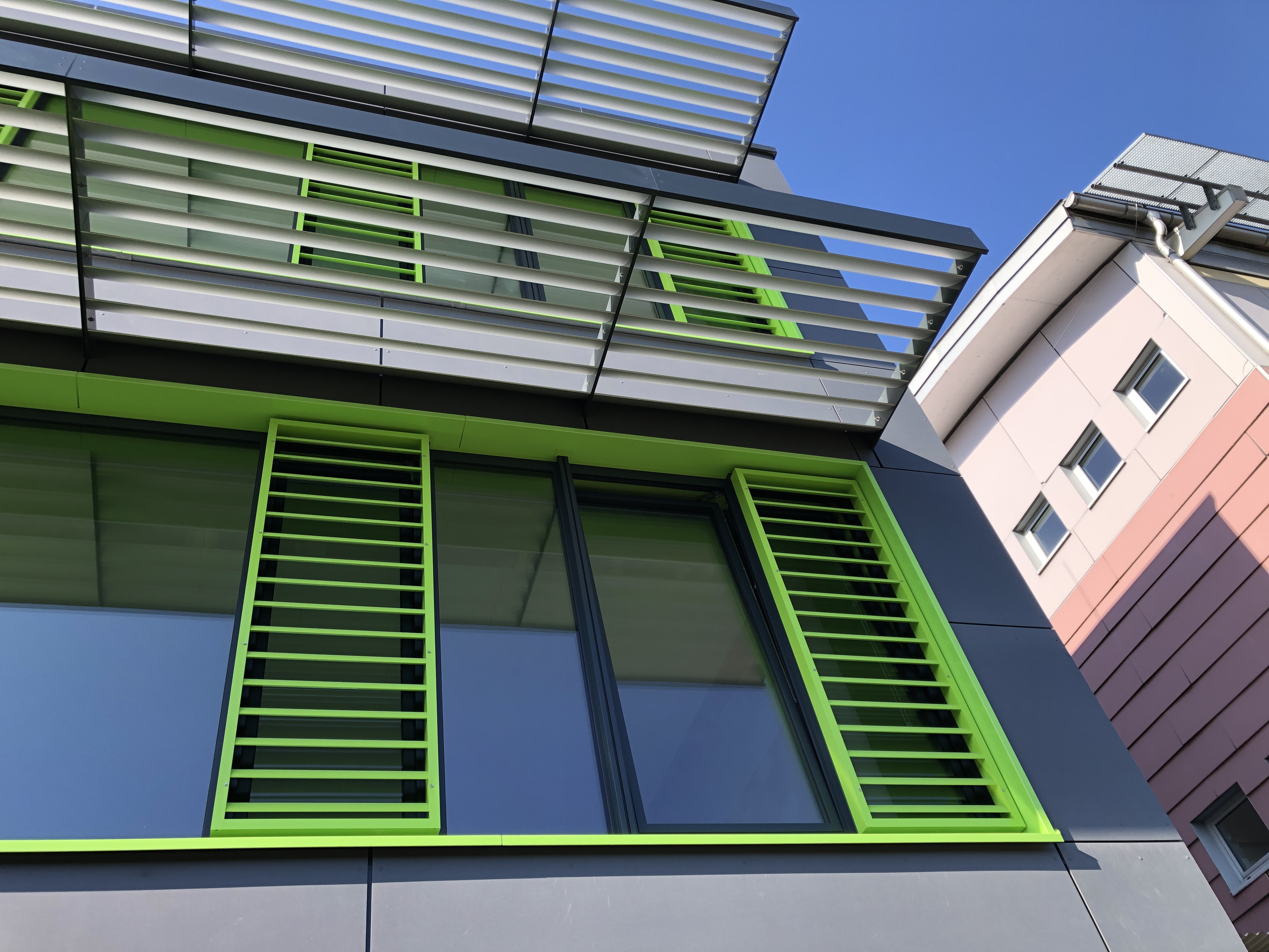 Die Integration dieser beiden Systeme hat die Schule in ein Zentrum der Produktivität und des Wohlbefindens für Schüler und Lehrer verwandelt. Die Fassade mit den leuchtend grünen DucoSlide-Alumiumlamellen verleiht der Schule einen Hauch von Verspieltheit und architektonischem Reiz.