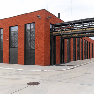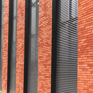 In the original design, secondary volumes were provided in masonry with removable panels. For aesthetic reasons, such as harmony with the highly articulated masonry volumes, and because of technical requirements for large façade openings (HVAC), the executive design team proposed to execute these volumes with a continuous louvre wall system from DUCO. The colour and shadow patterns of the louvres provide a visual connection to the other buildings on the site.