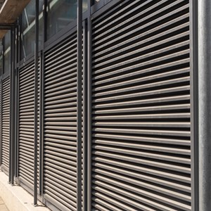 This window louvre combines functionality with design through 'stackable' aluminum louvres with perforated insect protection. The Z-shaped louvre contributes to the sleek appearance of the facade.