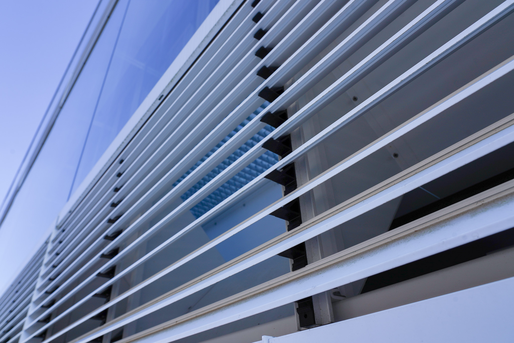 The DucoWall Classic 50HP louvres span multiple floors, creating a visually cohesive interplay between the sleek glass elements and functional louvre walls. The repeated louvre sections provide a rhythmic design element that complements the transparent facade while ensuring efficient airflow management.