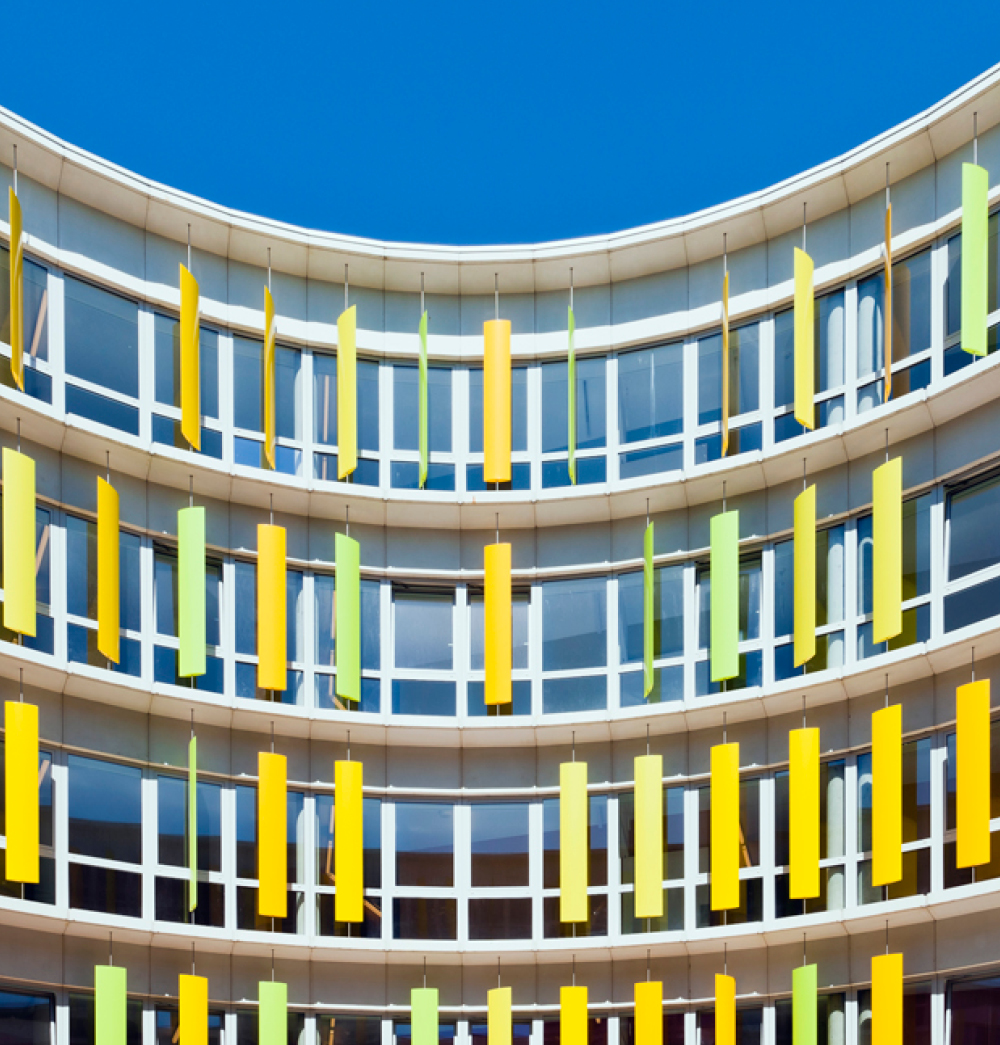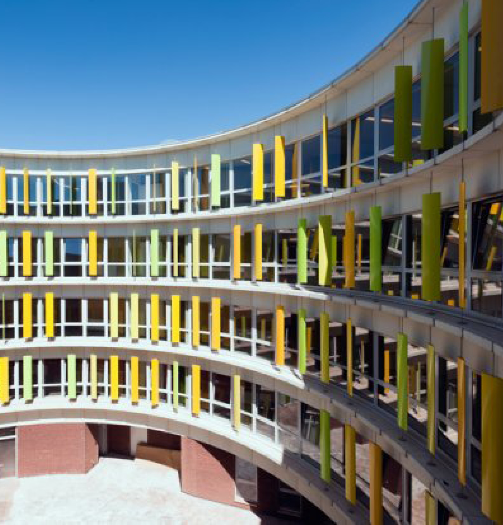 DUCO provided the non-profit organisation De Spoele with a true eye-catcher. The colourful architectural solar shading system is an essential part of the design and immediately catches your eye. The ellipse-shaped blades of the DucoSun Ellips 400 do not just provide an aesthetic added value, but also provide a maximum of diffuse daylight.