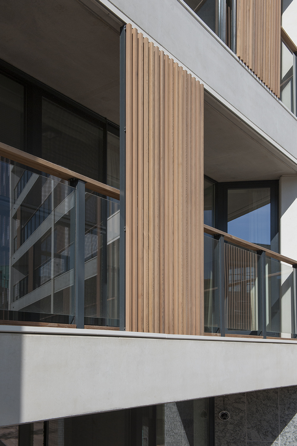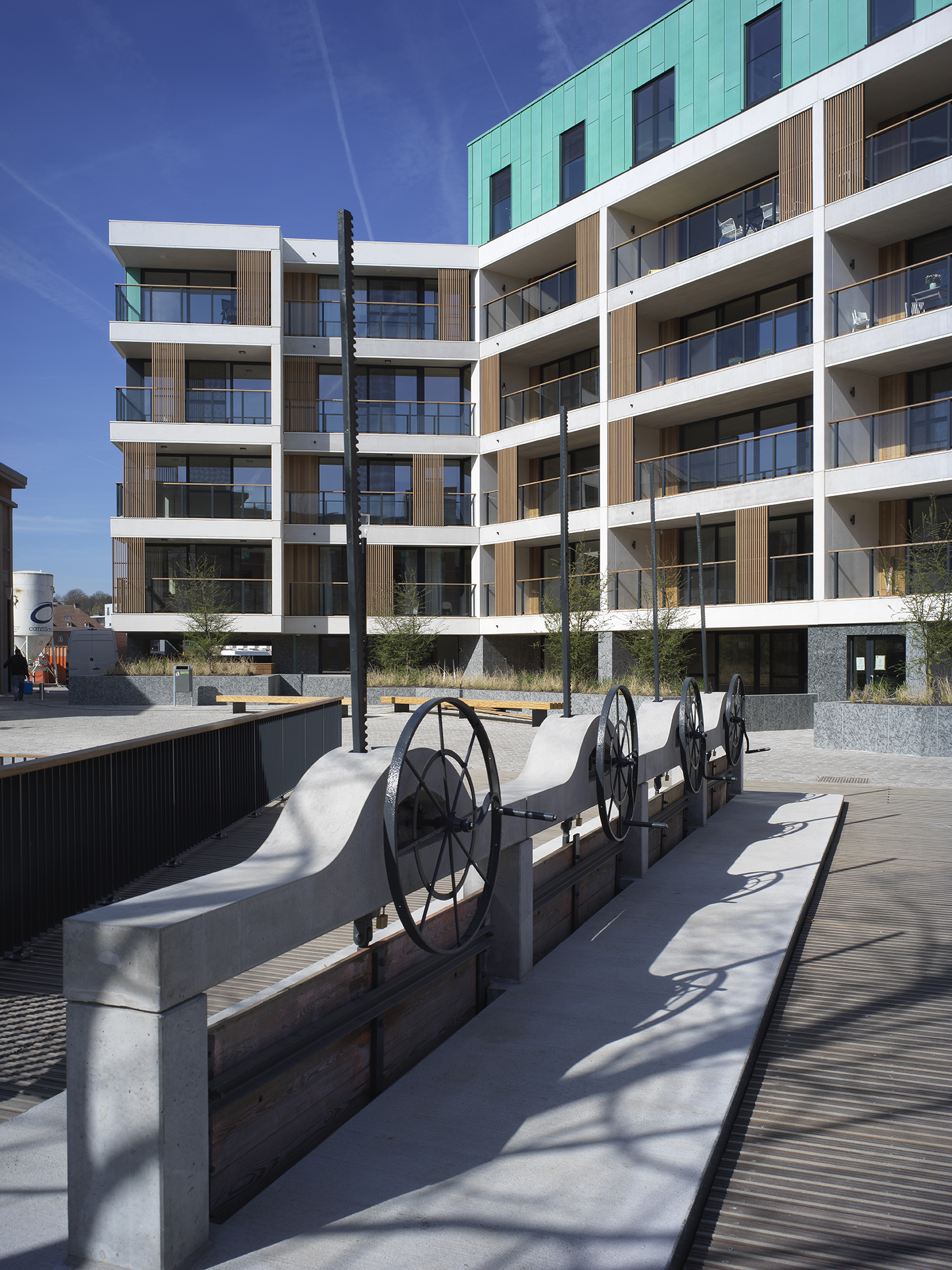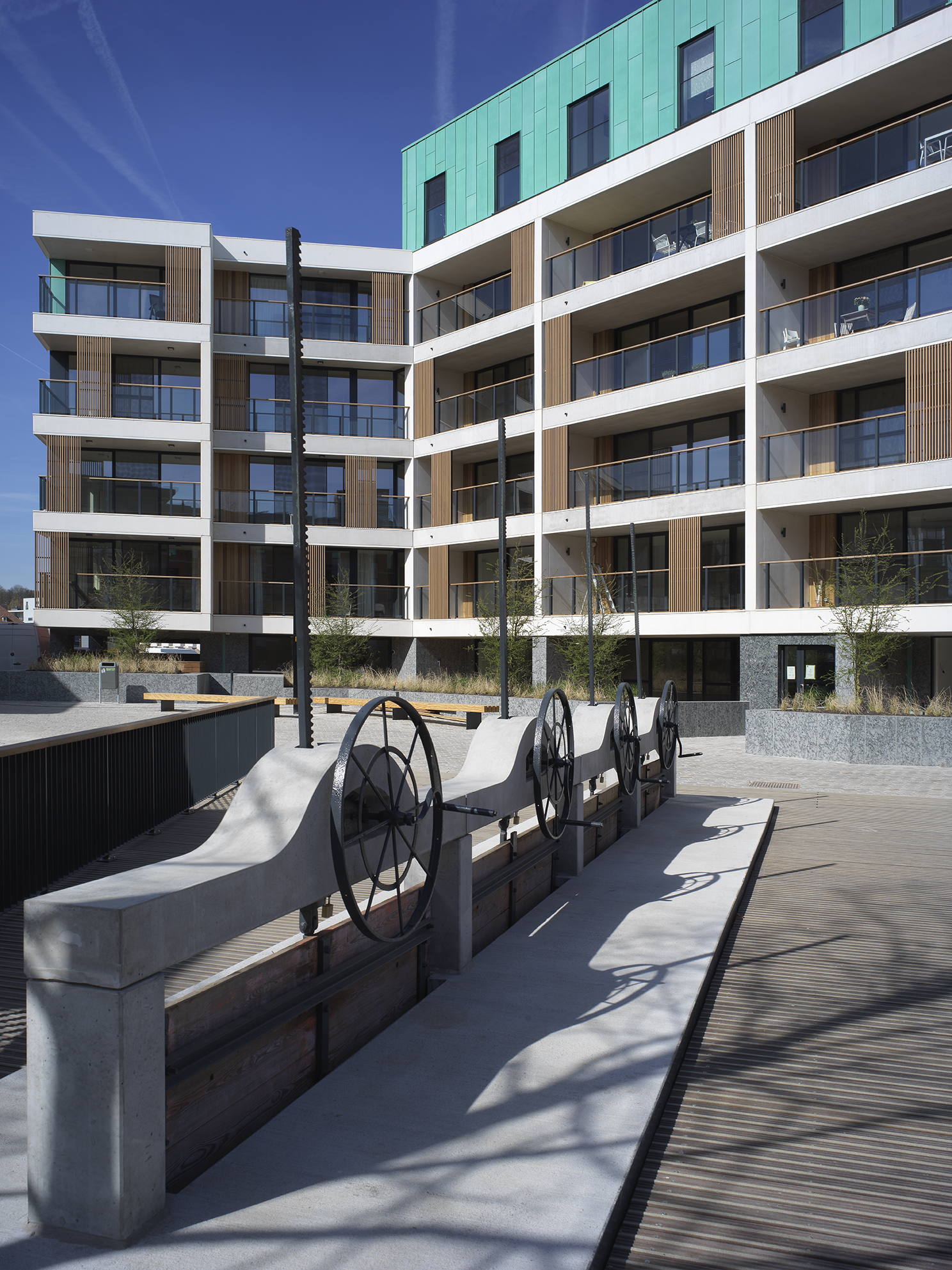 “In the discussions for the preliminary design of the site, the city of Leuven revealed its desire for the façades to have a more vertical appearance,” explained Erik Van Raemdonck, project architect at SVR-ARCHITECTS. “This was because both the surrounding buildings and the original ones have a strong verticality about them. However, the scale of the project, with its 80 apartments, meant that it had horizontal lines. So, to go some way towards meeting this requirement, we conceived of the idea of adding vertical sliding elements to the balconies.”