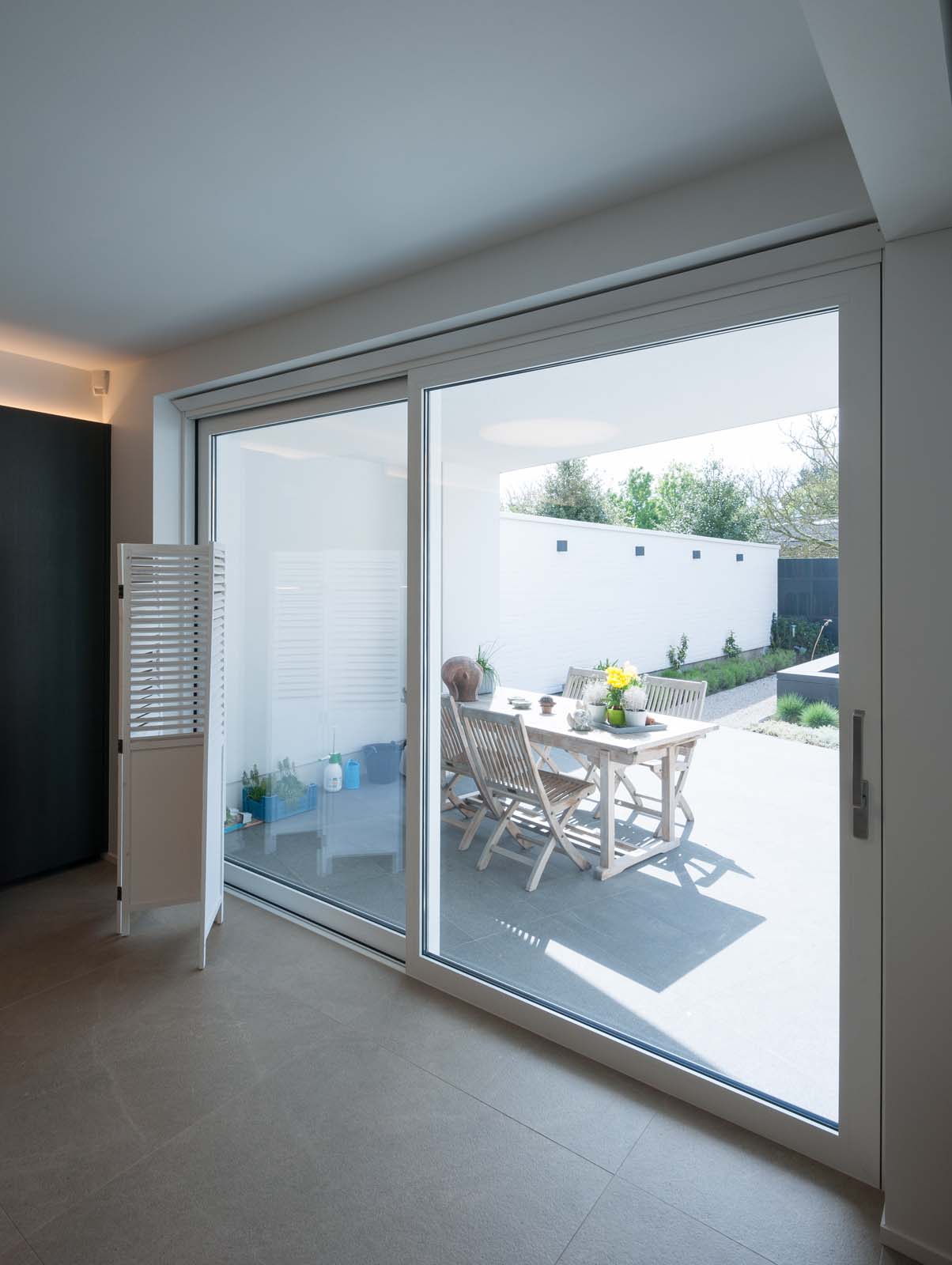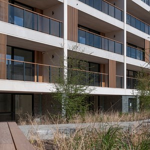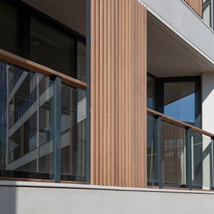 “All the apartments in the Feestzaal building are corner apartments with a large frontage. The DucoSlide Wood Vertical lends an interesting form to the transition between the apartment and the surrounding area. It presents a boundary with the terrace and also provides the fully glazed apartments with greater privacy, while maintaining the view through to the outside. The cedar cladding is vertical rather than horizontal. Its vertical placement is intended to break the horizontal lines of the structure. “Cedar was chosen to please our client Virix, which always seeks to make use of natural materials. The entire ensemble has to radiate cosiness, warmth and class. DUCO was the ideal partner to meet these expectations,” decided Van Raemdonck.