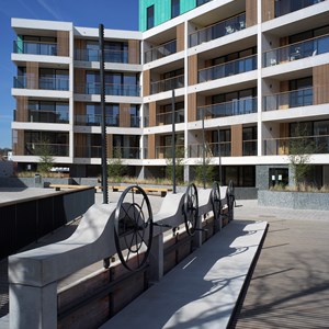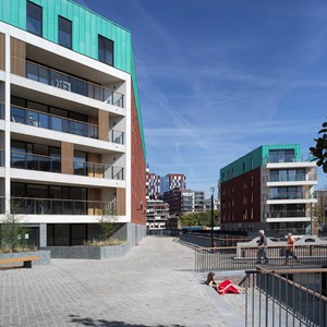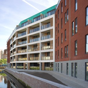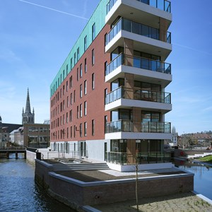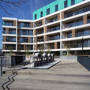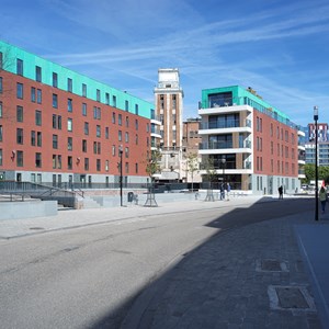 Over the years, the Dyle had been routed underground and covered. Now, with the DijleDelta project, the river has been opened up again. All the buildings are located along the water’s edge, giving residents a fabulous view of the water features. Not only has the Dyle been restored, but the original quay walls have also been renovated. This new district is also home to the ‘Eiland’ and ‘Feestzaal’ apartment buildings, built by project developer Virix. The ‘Eiland’ project offers 66 apartments on six floors, while ‘Feestzaal’ groups together 14 apartments on five floors. Both have an E-level that is lower than that required by law.