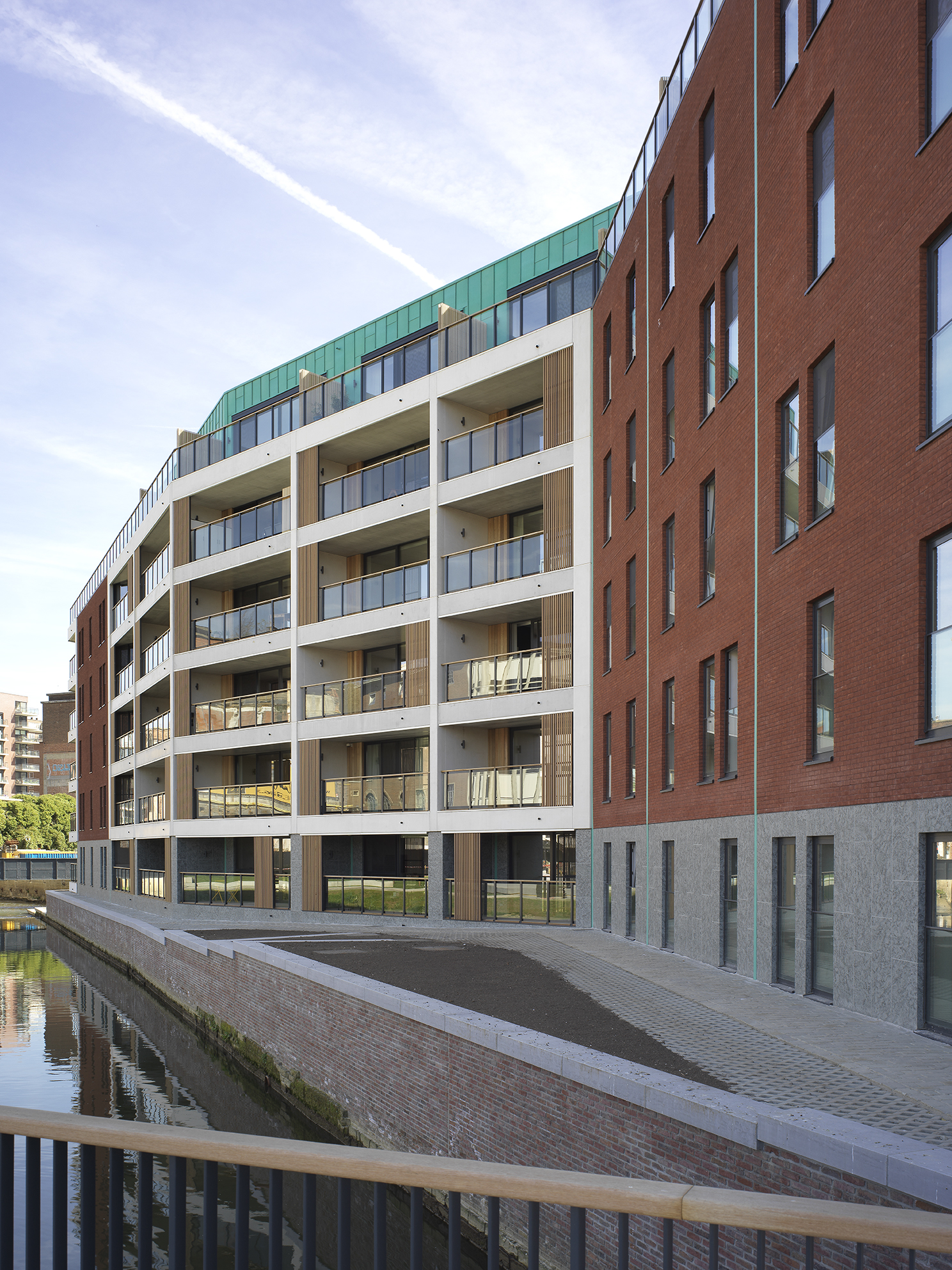 Where there once stood a brewery belonging to AB Inbev, a few years ago the DijleDelta project emerged along the southern waterfront of the Vaartkom. This old industrial site made way for a new district with space for townhouses and apartments, integrated into green and blue surroundings. Architectural firm SVR-ARCHITECTS from Antwerp was responsible for the design of the ‘Feestzaal’ and ‘Eiland’ buildings. With these buildings it is more apparent than ever before that DUCO solar shading does not always have to have a functional purpose.