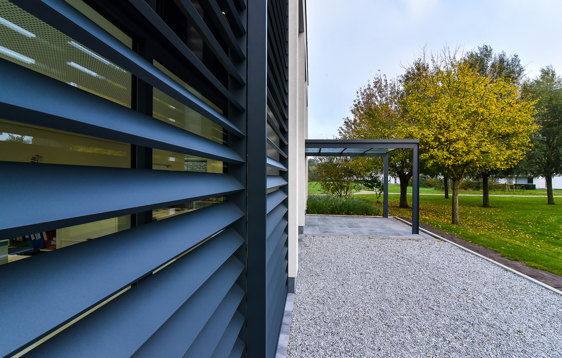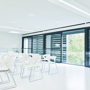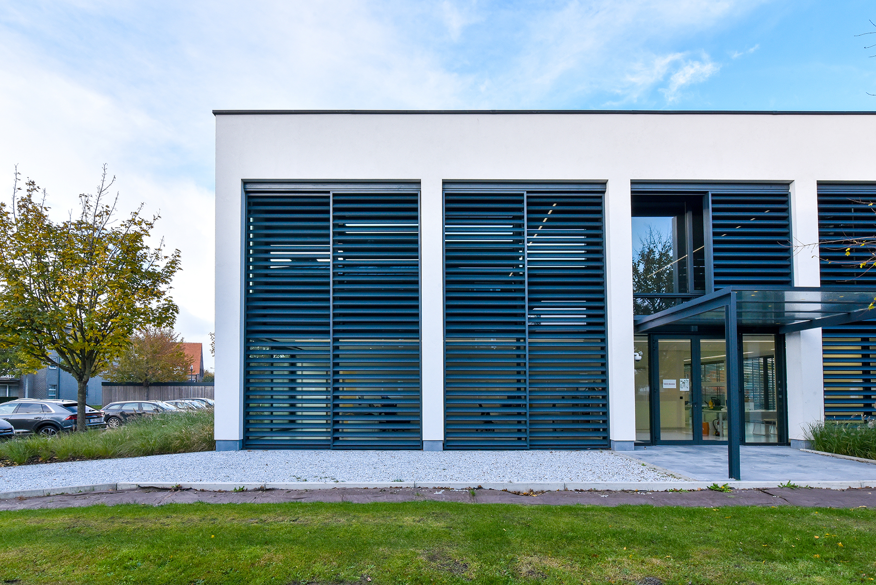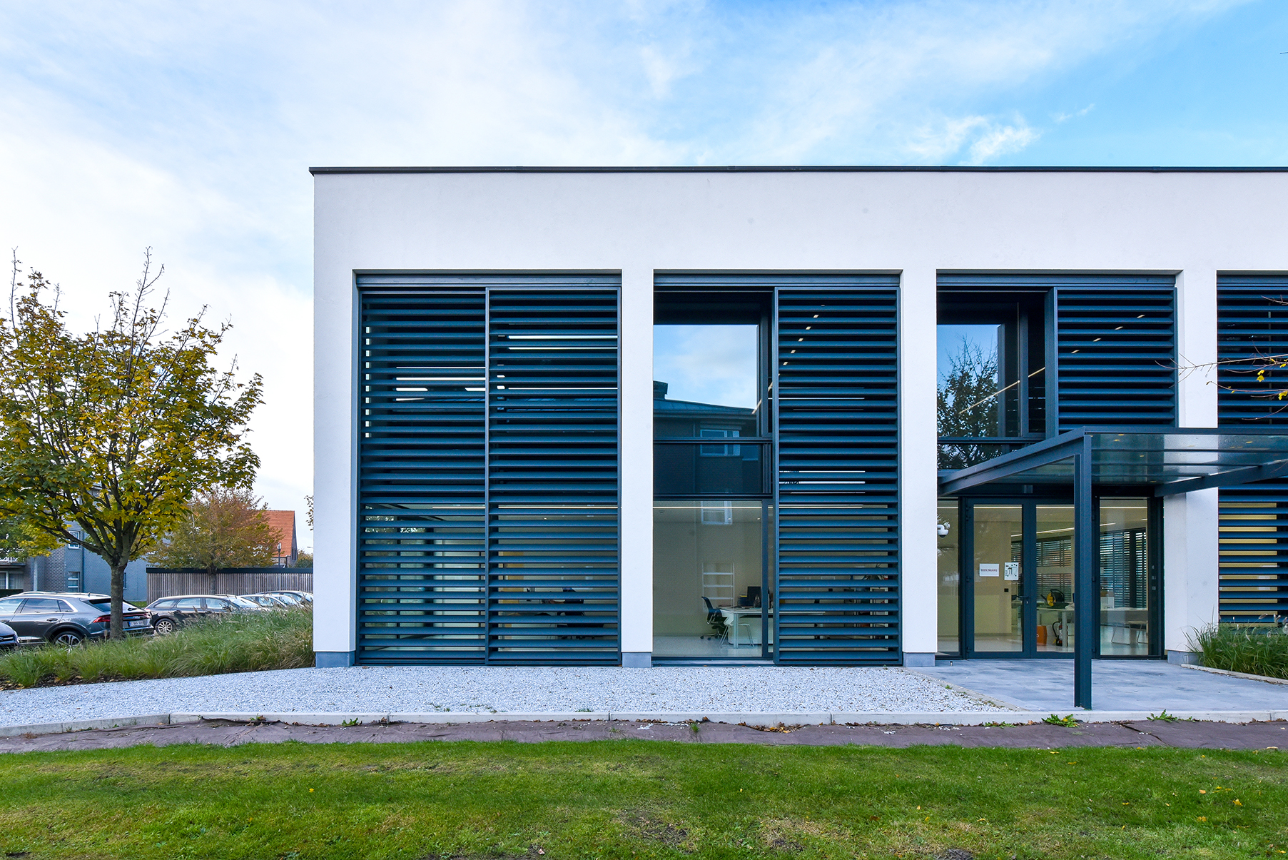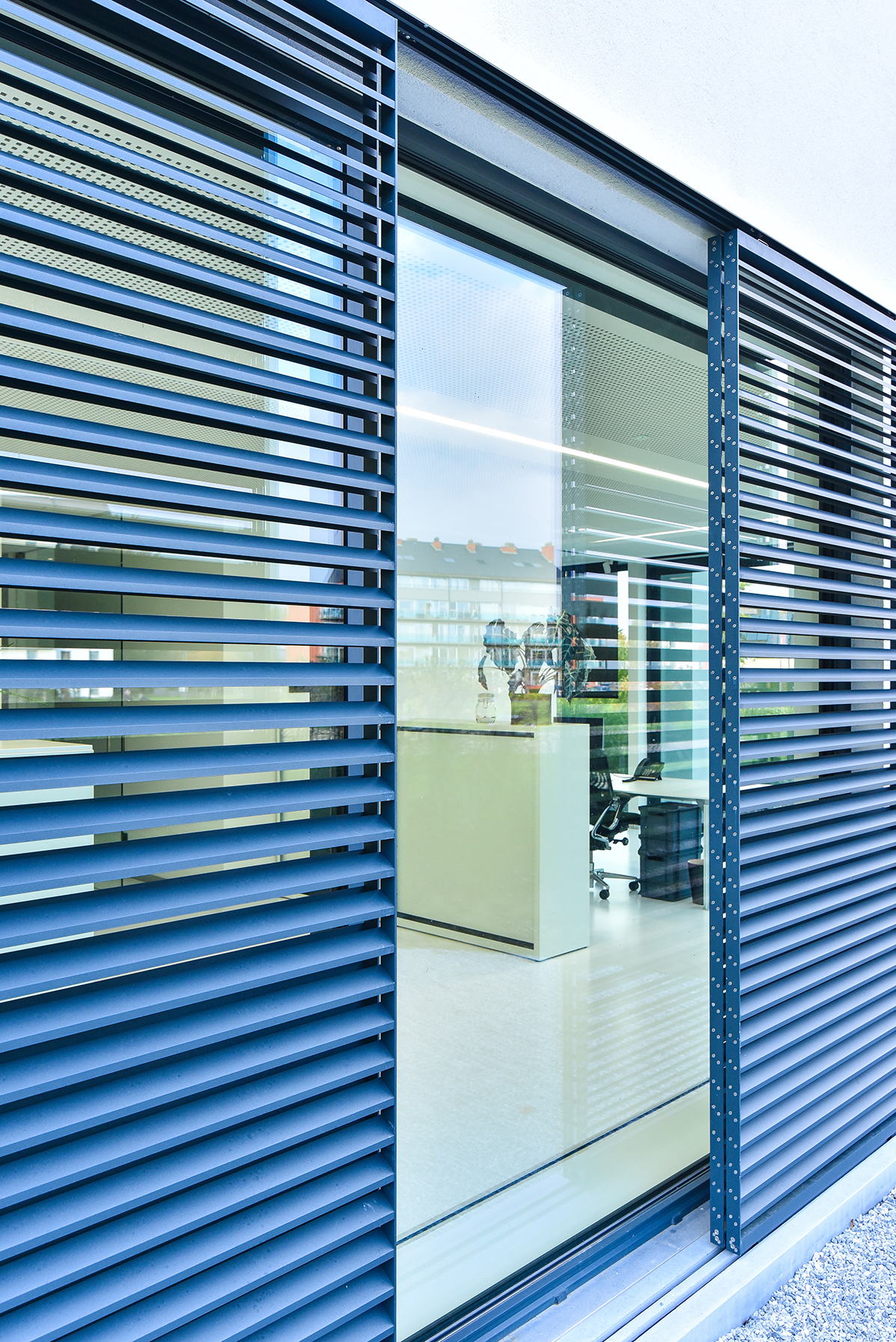 ‘In the office there was the possibility of passive cooling with a maximum temperature difference of 3 degrees,’ Casteur continues. ‘But because of the large window surfaces this wasn’t efficient. We therefore decided to use DUCO’s XXL aluminium sliding panels. To keep out the sun’s heat and lower the temperature in the workspace. But also because this solar shading system forms a perfect match with the building.’