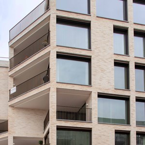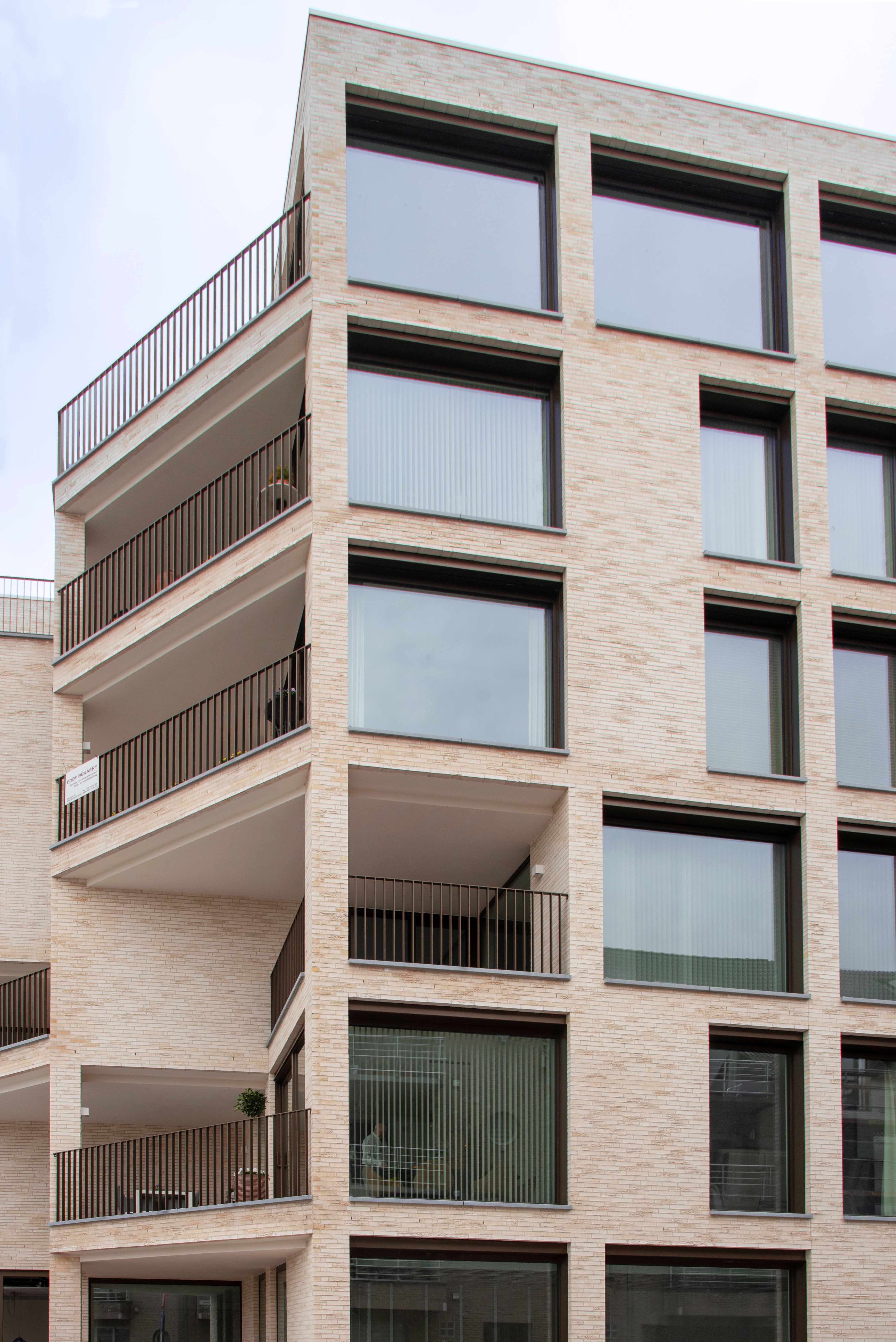 The project comprises 18 apartments in variable sizes, layouts, natural light and views, attracting a highly diverse audience. The architect deliberately chose warm materials with a very natural feel using a light facing brick, exterior joinery in a warm shade and a number of highlights in wood. The result is an elegant and high-quality project with fine detailing.