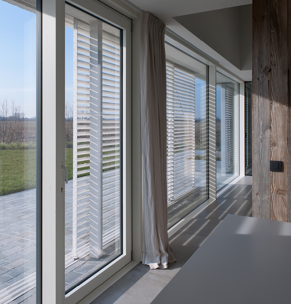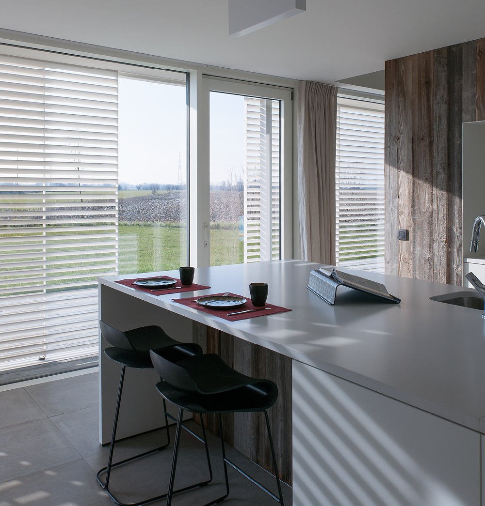 Lapeirre Woningbouw has recognised how fundamental large areas of glazing are in contemporary architecture. Thus, virtually the entire rear façade is built using large areas of glazing which creates a unique view of the surrounding area. A glass façade also allows a great deal of natural light into the home but this can soon give rise to all manner of discomforts for the resident. What about privacy for example? What’s more, large areas of glazing draw in too much heat in the summer and the rising or setting sun can be a nuisance in transitional seasons. After the necessary study it seemed appropriate to choose external solar shading.