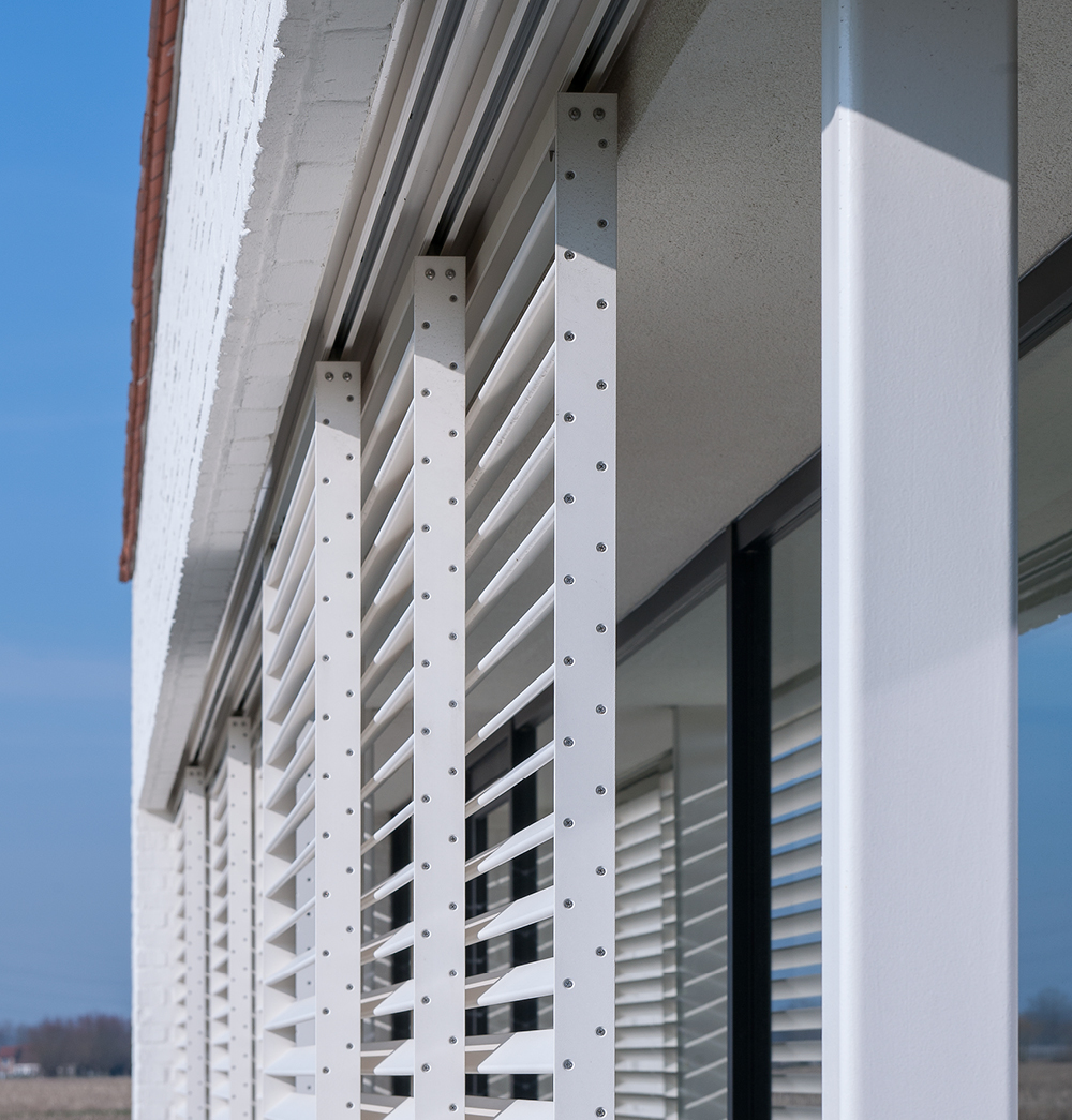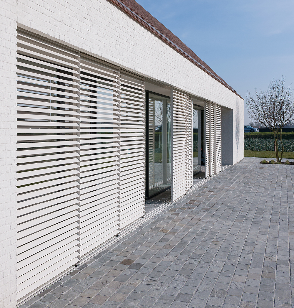These days solar shading is no longer strictly functional but also increasingly a more aesthetically pleasing option. “And here too DucoSlide fits just right,” says the spokesperson for Woningbouw Lapeirre. “This solar shading system lends the façade a unique touch thanks to its sleek, rectilinear design. Choice of frame profile is the SlimFrame, whereby the discreet and elegant side profiles proved popular. In addition, DucoSlide also brings added dynamism to the façade thanks to the sliding sections that make up a playful and fascinating interaction with the strict architectural lines. An additional plus point was the fact that the DucoSlide louvre blades could be painted in the same colour as the whitewashed facing brick!”