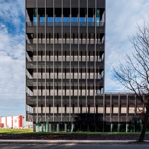 The corona crisis tested the patience of the Limburg family business. In mid-2021, the new head office could finally be put into use. On the existing site in Genk-North, an attractive, future-oriented building was erected, which presents itself as a model of sustainability. "Optimal use of space was the objective, so we decided to build upwards," explains Salvatore Napolitano, Chief Procurement Officer at H.Essers. "The new head office was built on the site of an old, single-storey car park. With a height of 30 metres and six floors, the new building offers 4200 m² of useful space. A new parking tower, designed in the same style, meets the need for additional parking space."