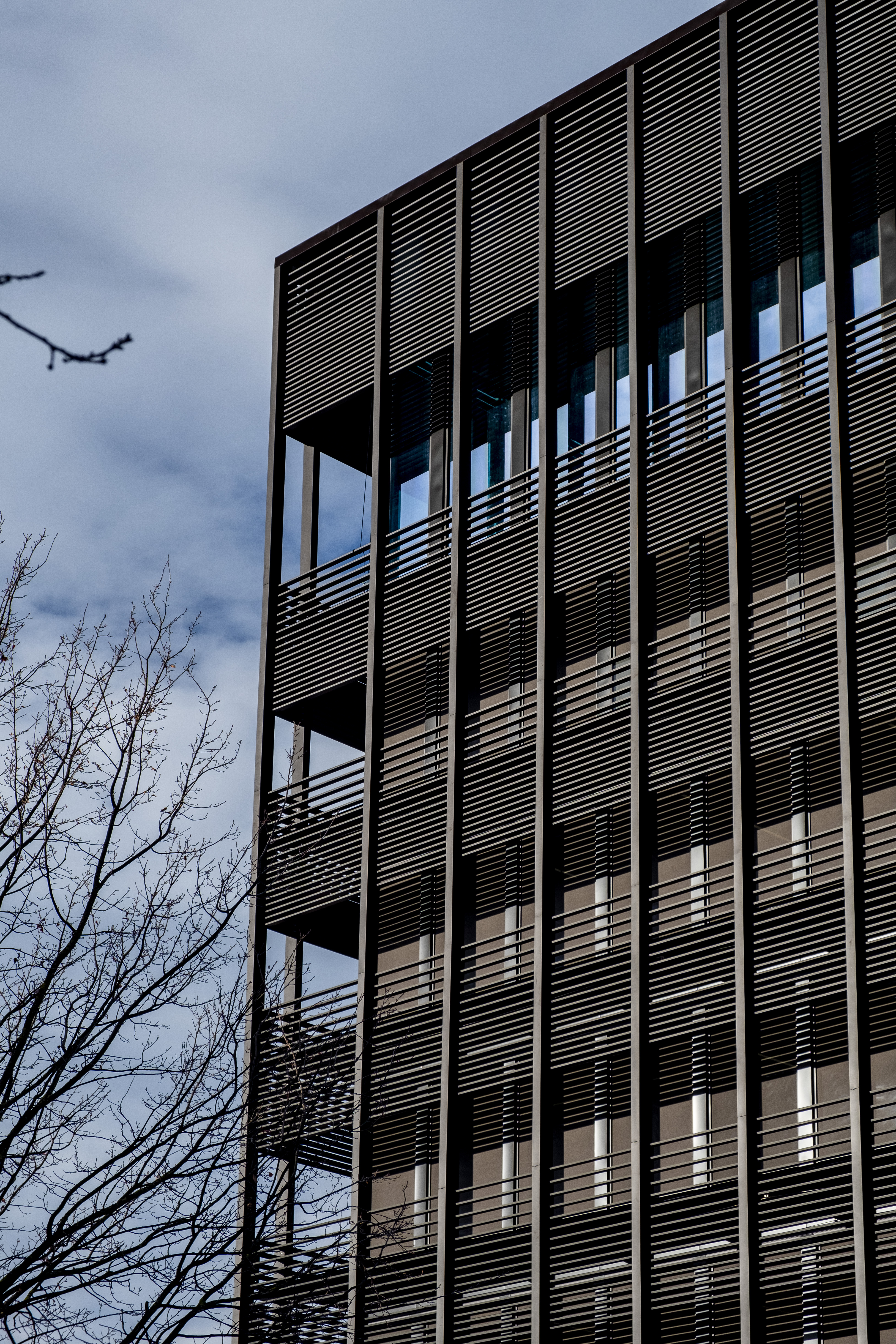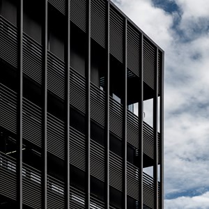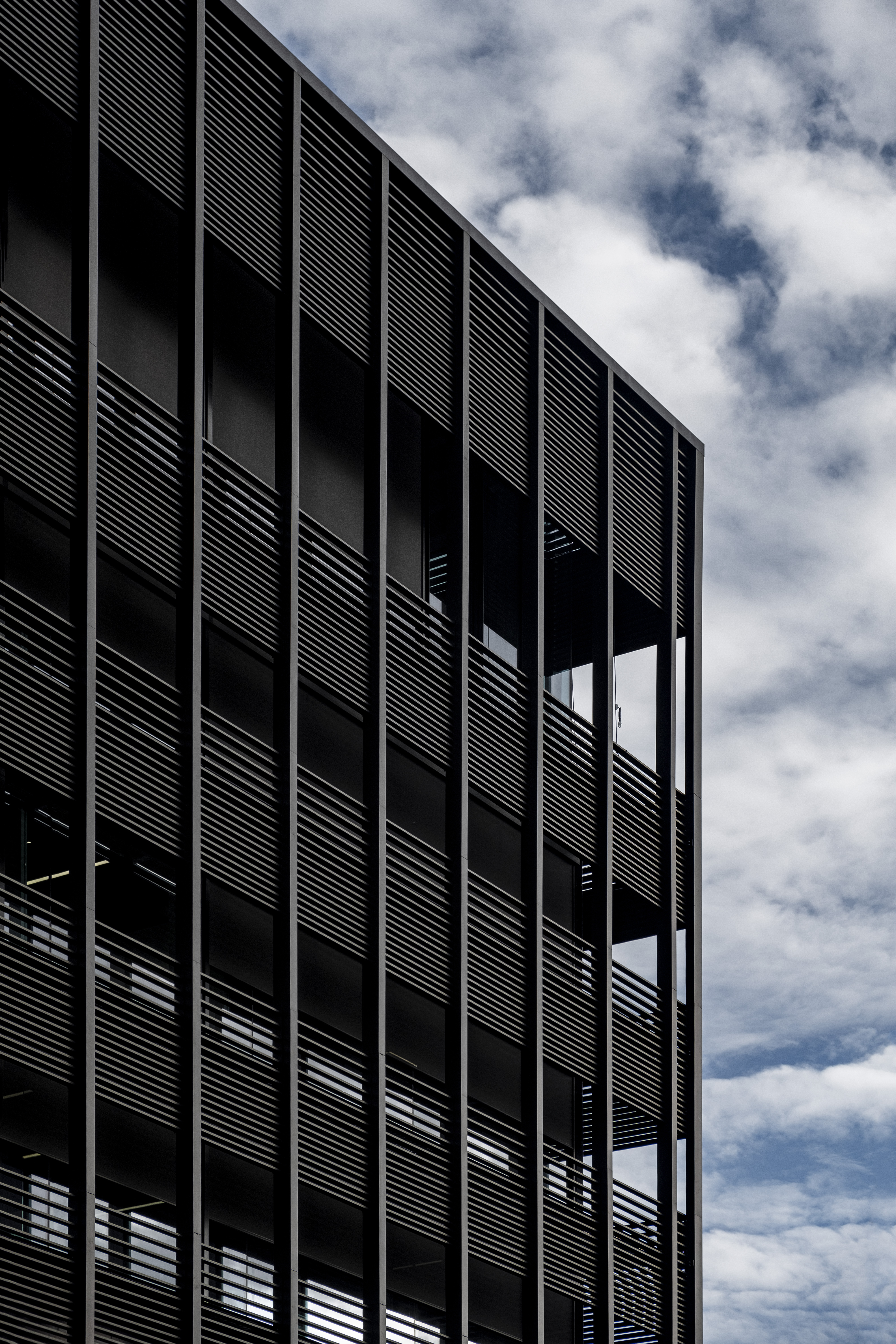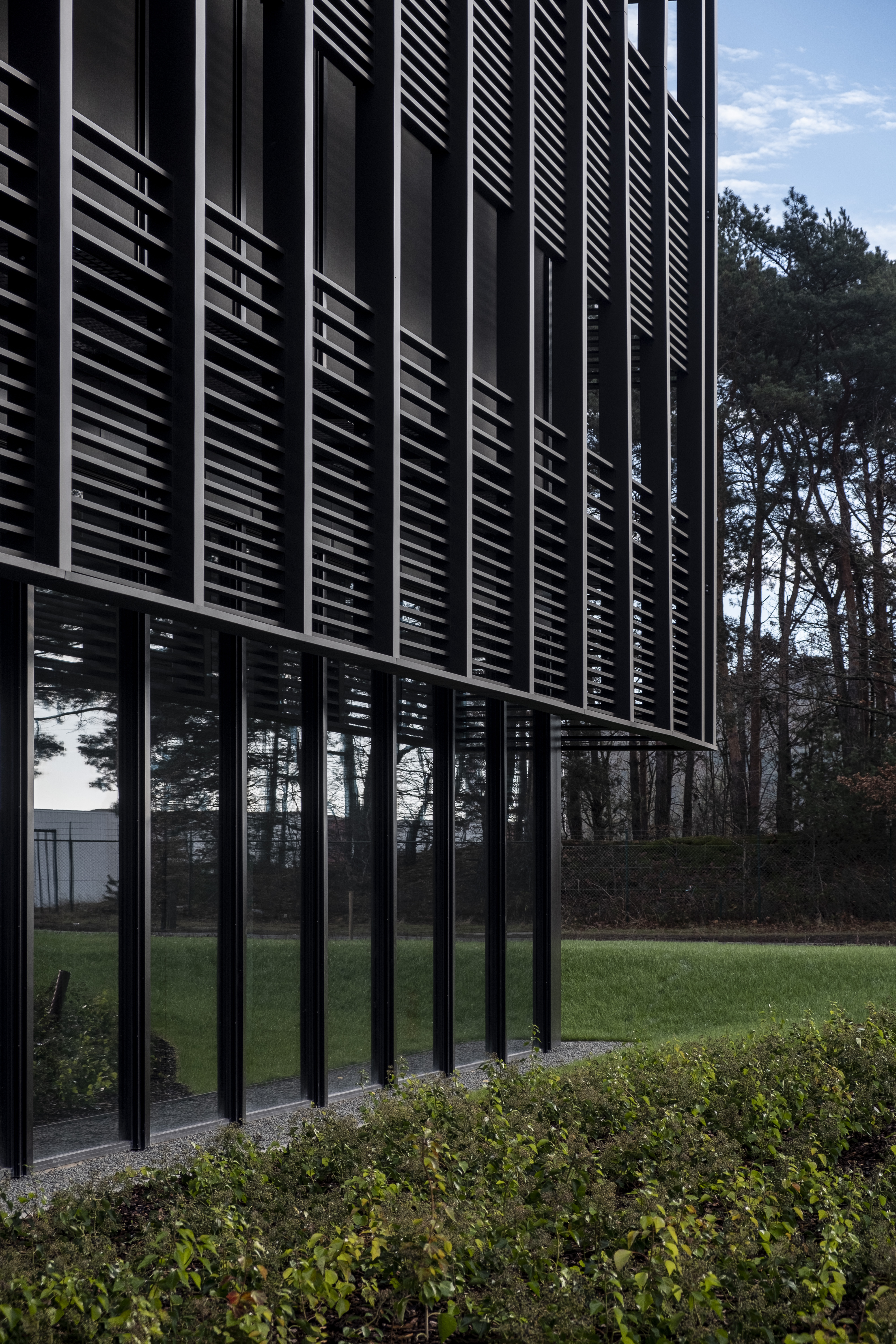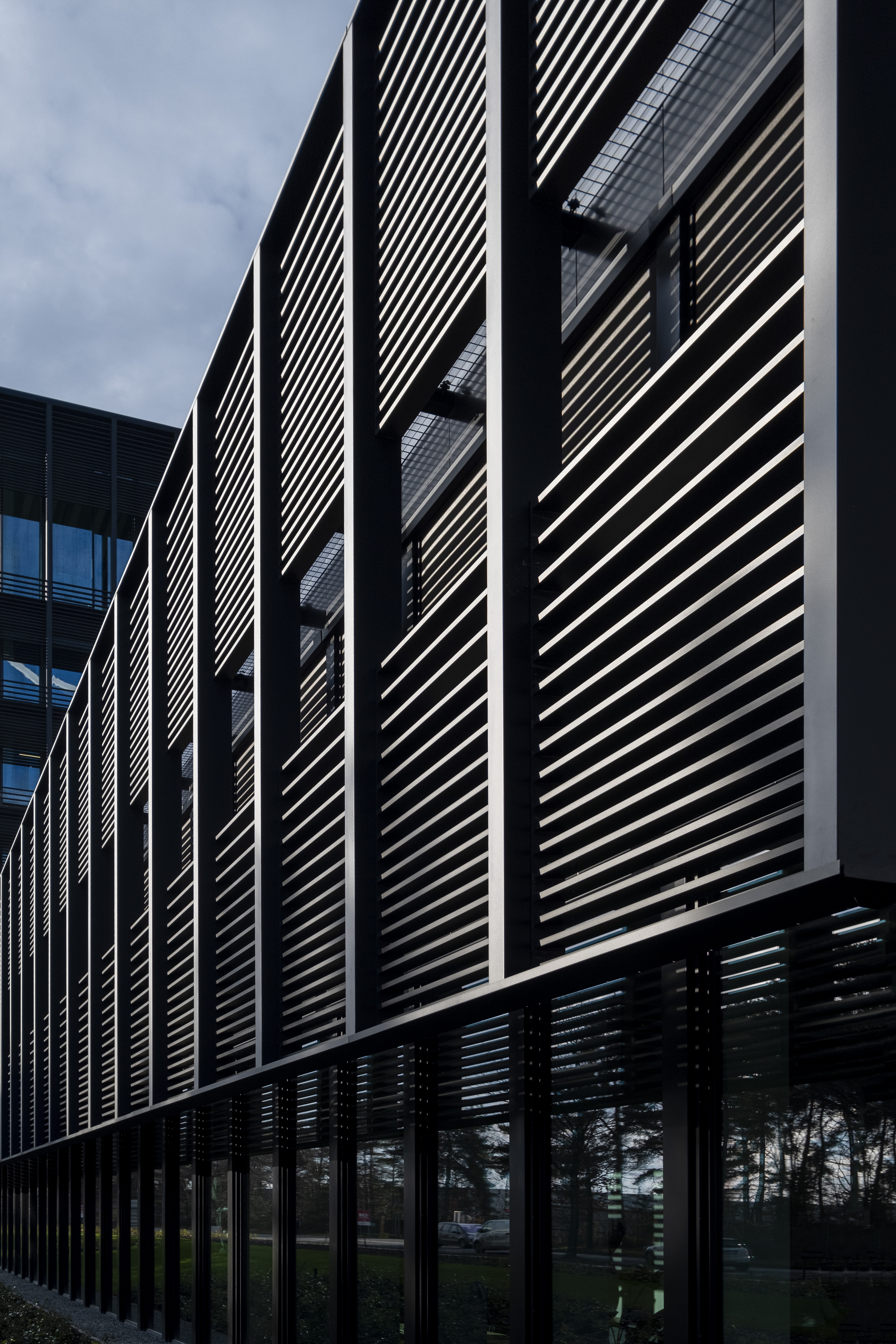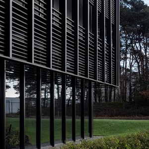 The façade construction was worked out in detail. "A major concern was the cast shadow from the wind turbines on the site - which sometimes caused annoyance in the former company building," explains Bylois. "At the same time, it was important to provide sufficient light and air. That is why we opted for a double façade quite early on. The outer shell in concrete and glass is flanked by a steel façade consisting of strategically positioned, horizontal, black DucoSun Cubic 150 louvres. Partly inspired by the Ghent library De Krook. They provide a pleasant interior experience (without restricting the view) and make a valuable aesthetic contribution."