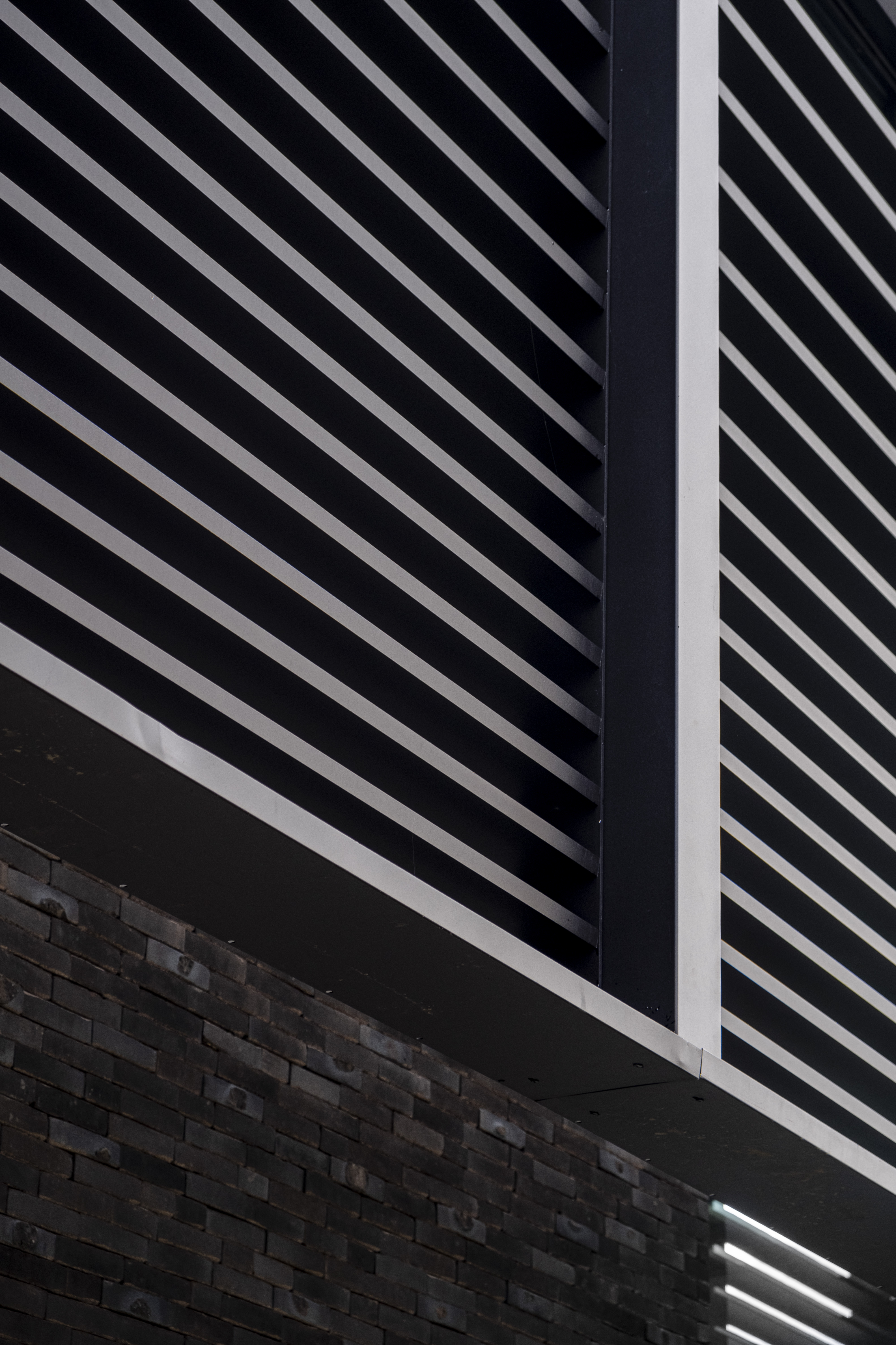 The top of the building's facade was dressed with black rectangular DucoSun Cubic slats. These aluminium slats have a double function. On the one hand, they serve as sun protection and prevent people from looking in. On the other hand, they provide a playful dynamic and a special appearance.