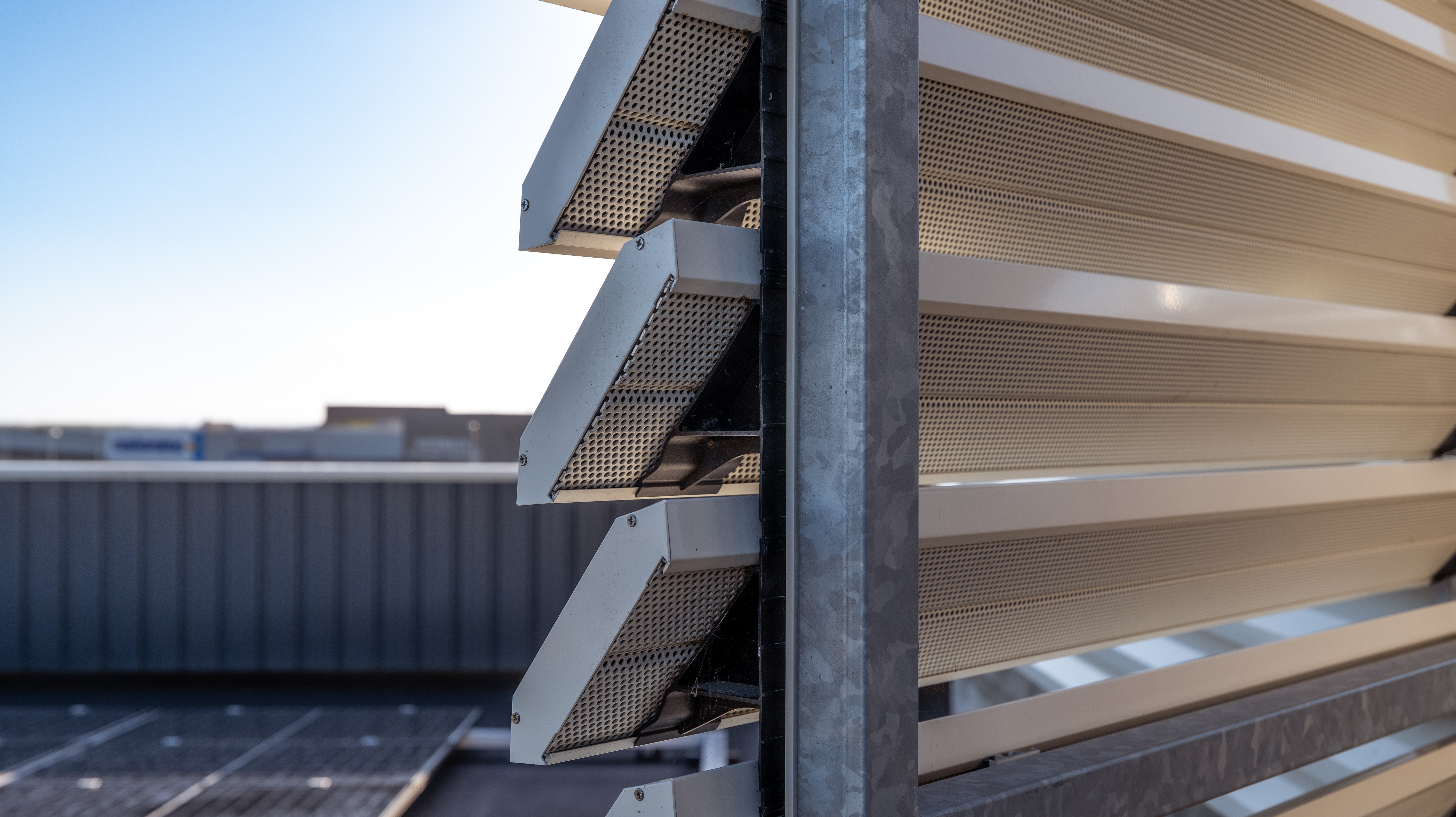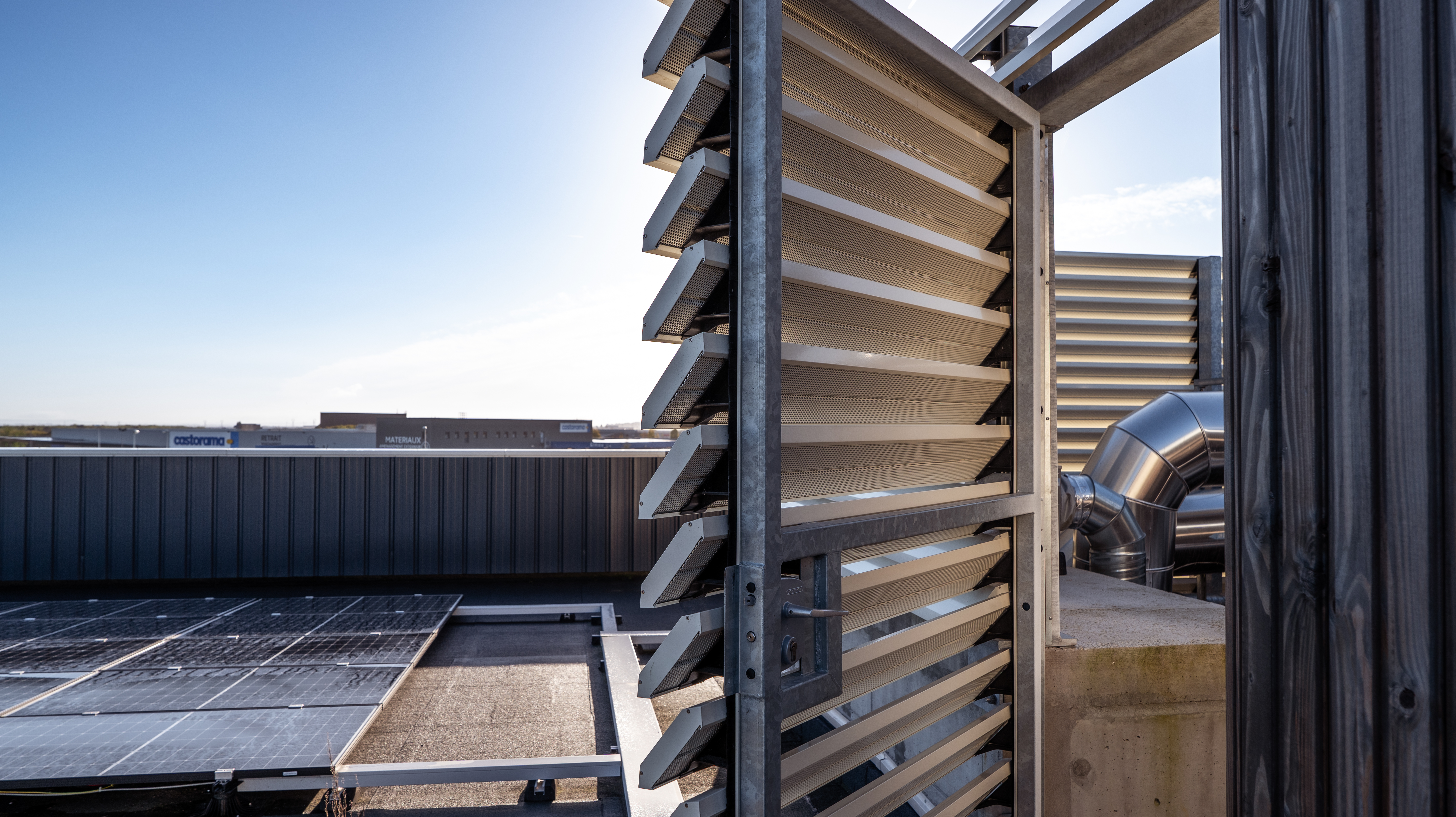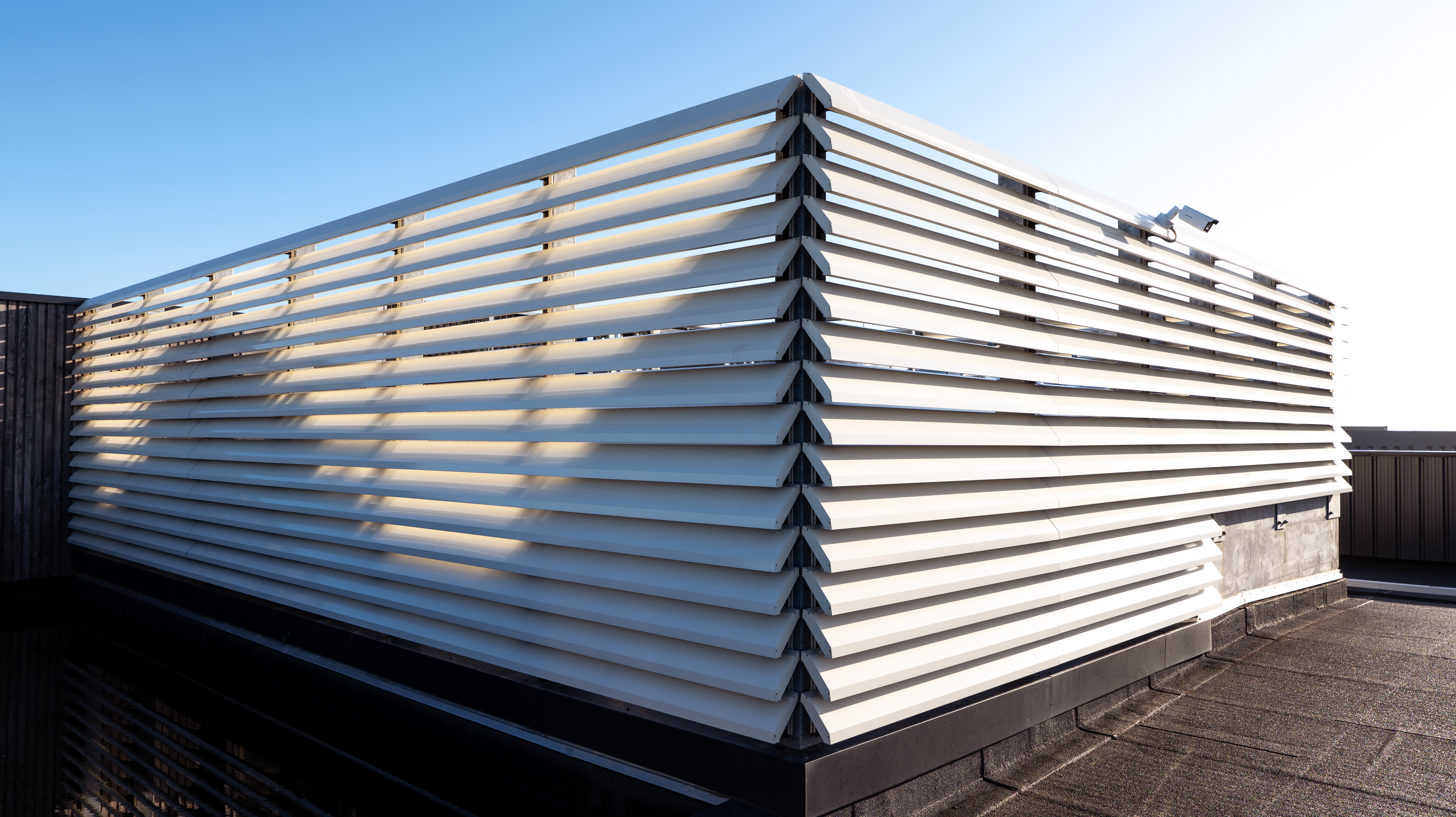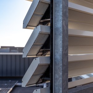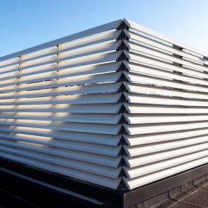 The DucoWall Acoustic 150 system, made up of extruded aluminium profiles, is specially designed to conceal and protect technical equipment while integrating the building harmoniously into its environment. The aluminium louvres are securely clipped onto plastic supports, forming a discreet barrier that protects the equipment from the elements and prying eyes. Thanks to its modern design and architectural flexibility, DucoWall Acoustic adds a neat, contemporary finish to the building's roof.