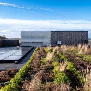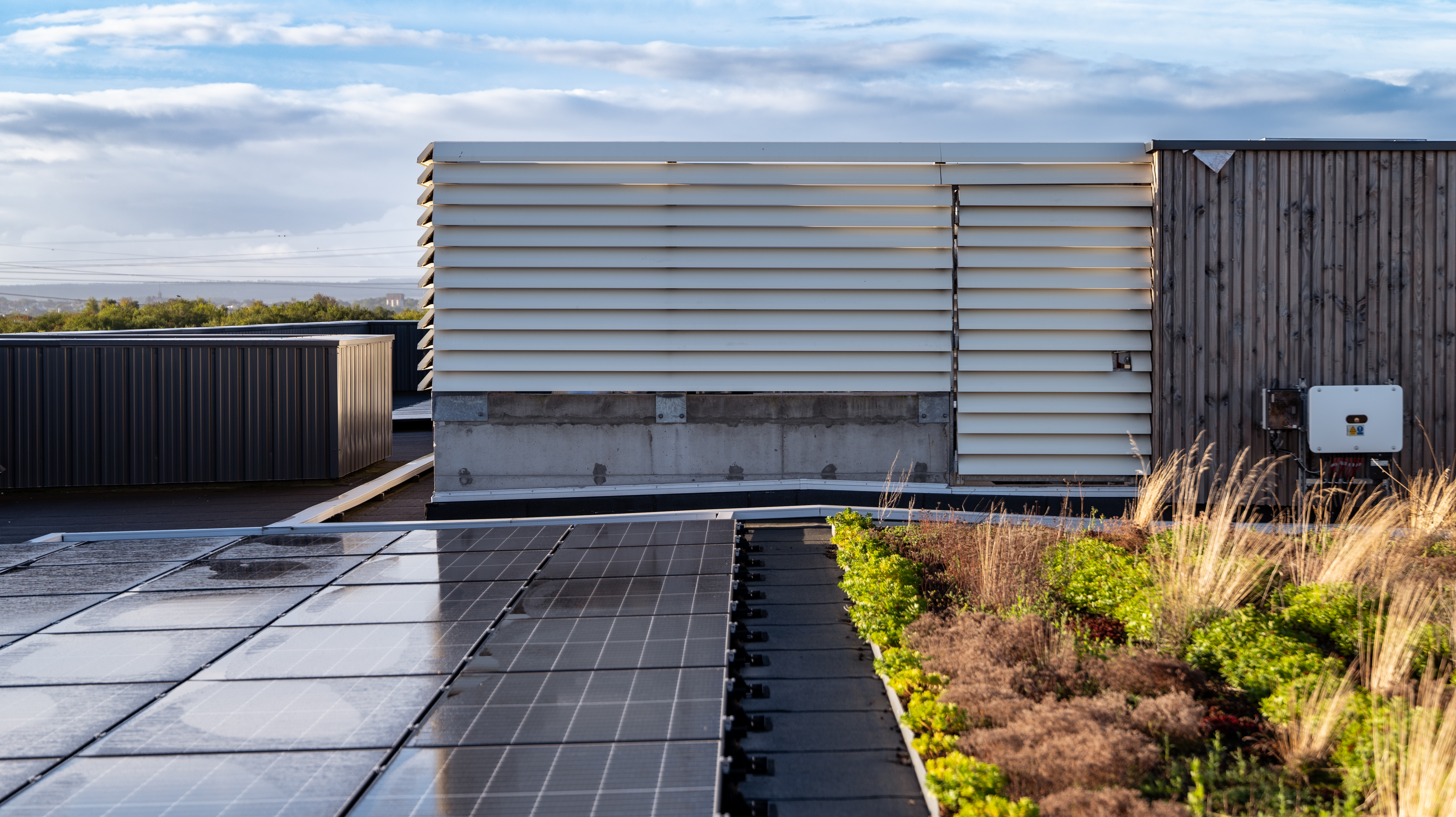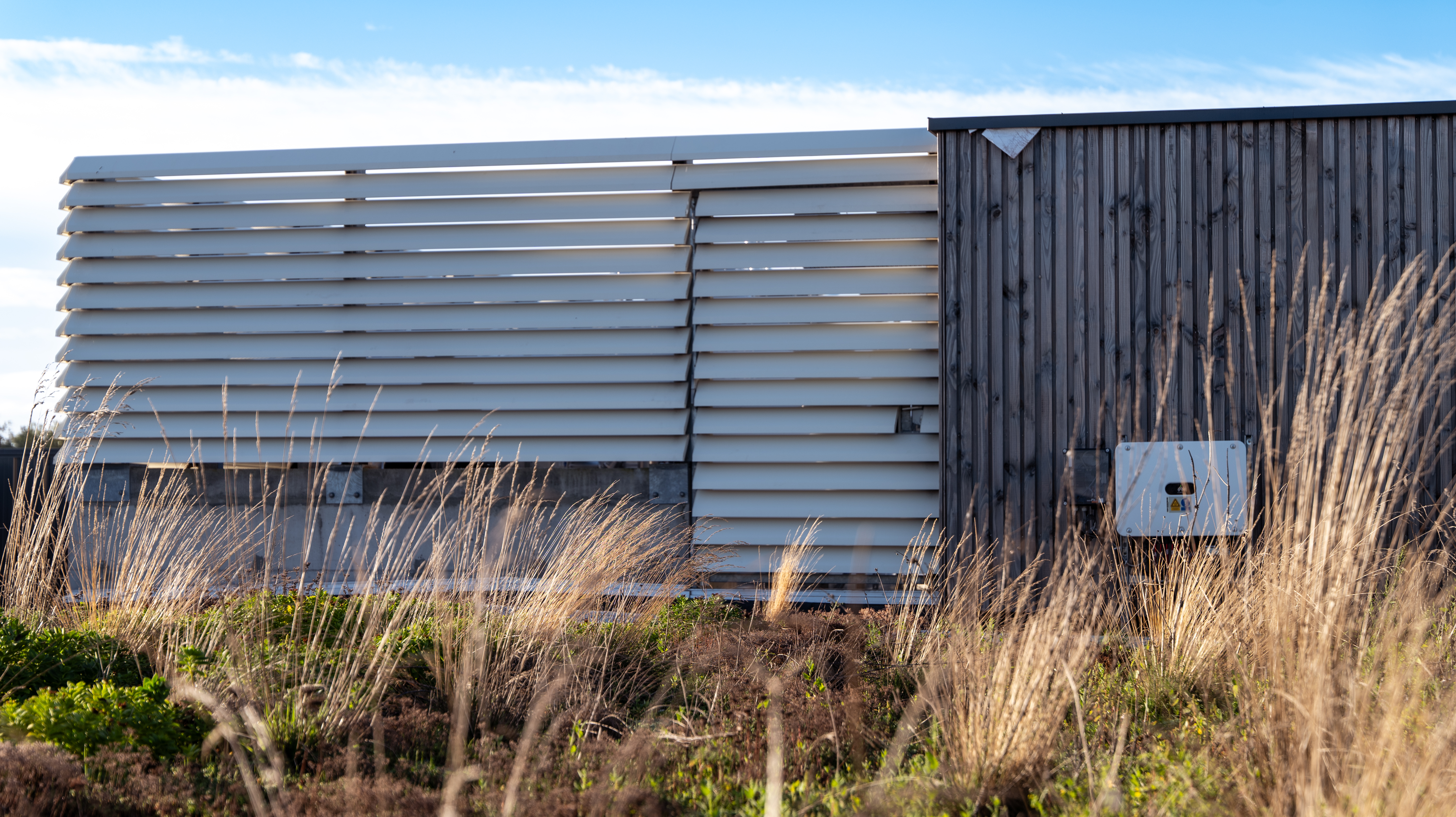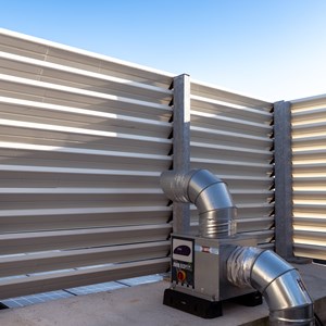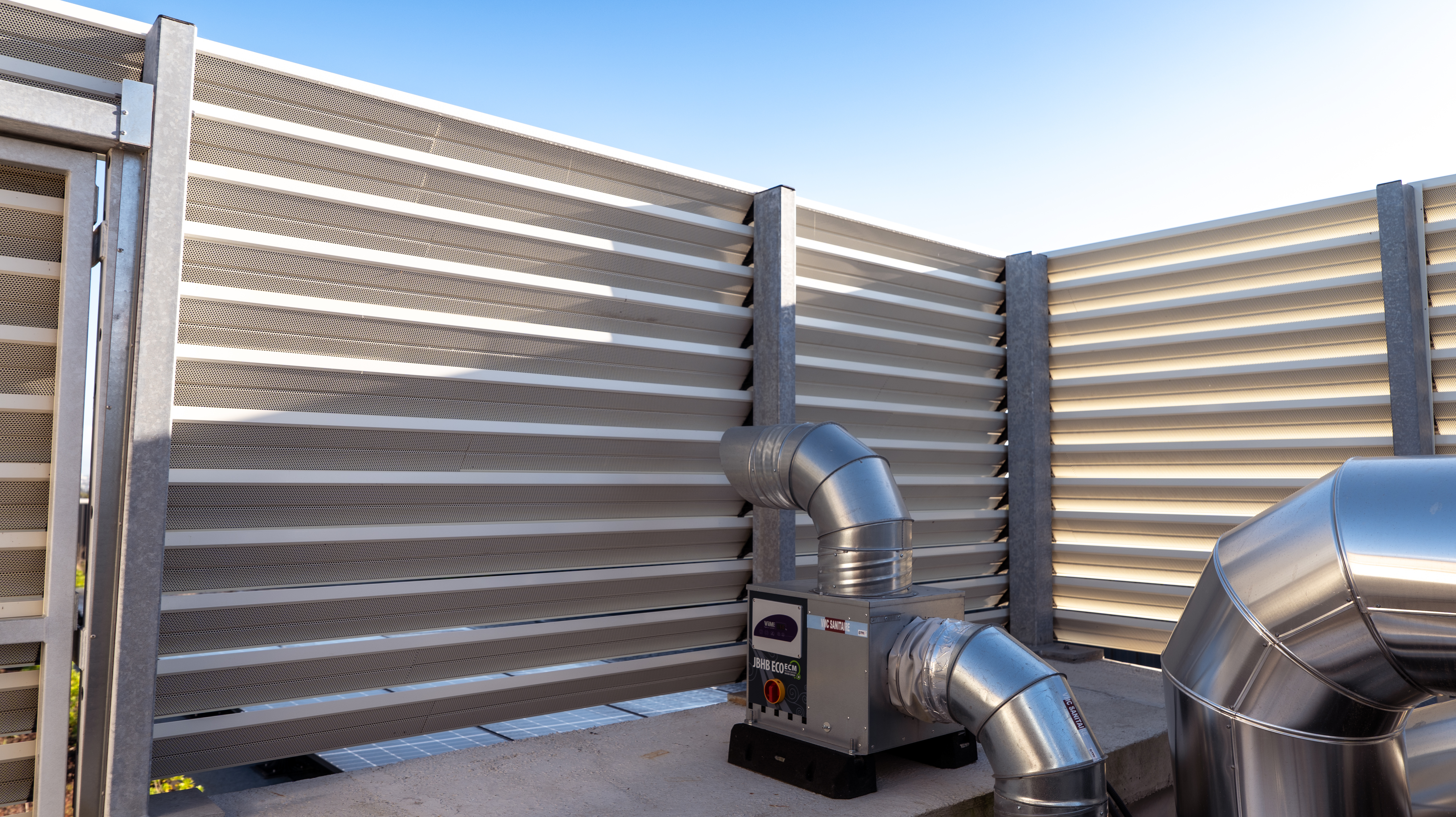 The DucoWall Acoustic 150 system, made up of extruded aluminium profiles, is specially designed to conceal and protect technical equipment while integrating the building harmoniously into its environment. The aluminium louvres are securely clipped onto plastic supports, forming a discreet barrier that protects the equipment from the elements and prying eyes. Thanks to its modern design and architectural flexibility, DucoWall Acoustic adds a neat, contemporary finish to the building's roof.