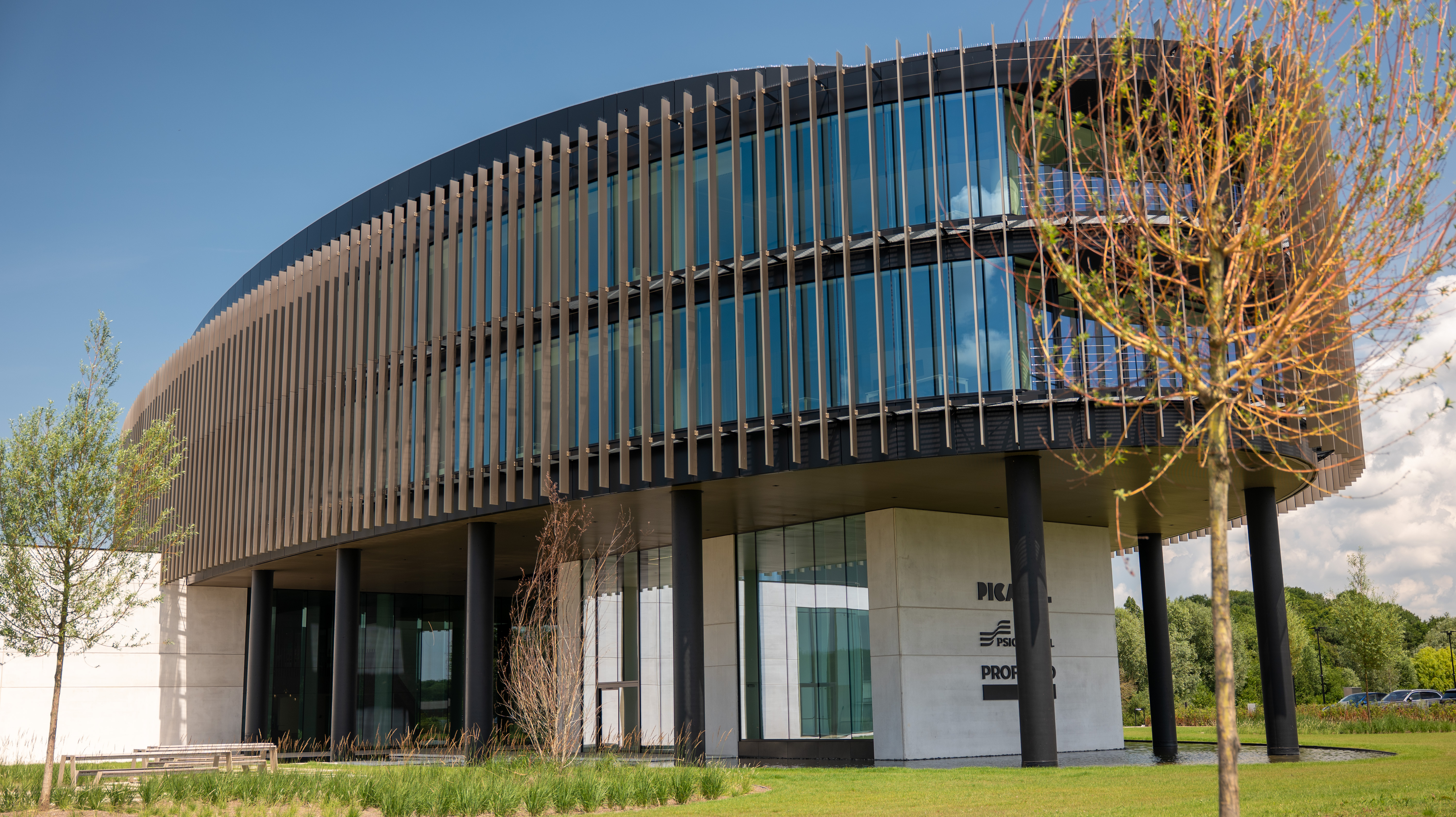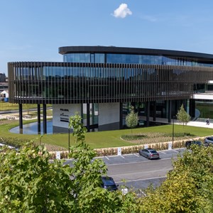 The striking façade of the new Picanol Group headquarters in Ypres is completed by cutting-edge external solar shading technology that elevates both comfort and aesthetics to a higher level: the DucoSun Cubic architectural louvre system.