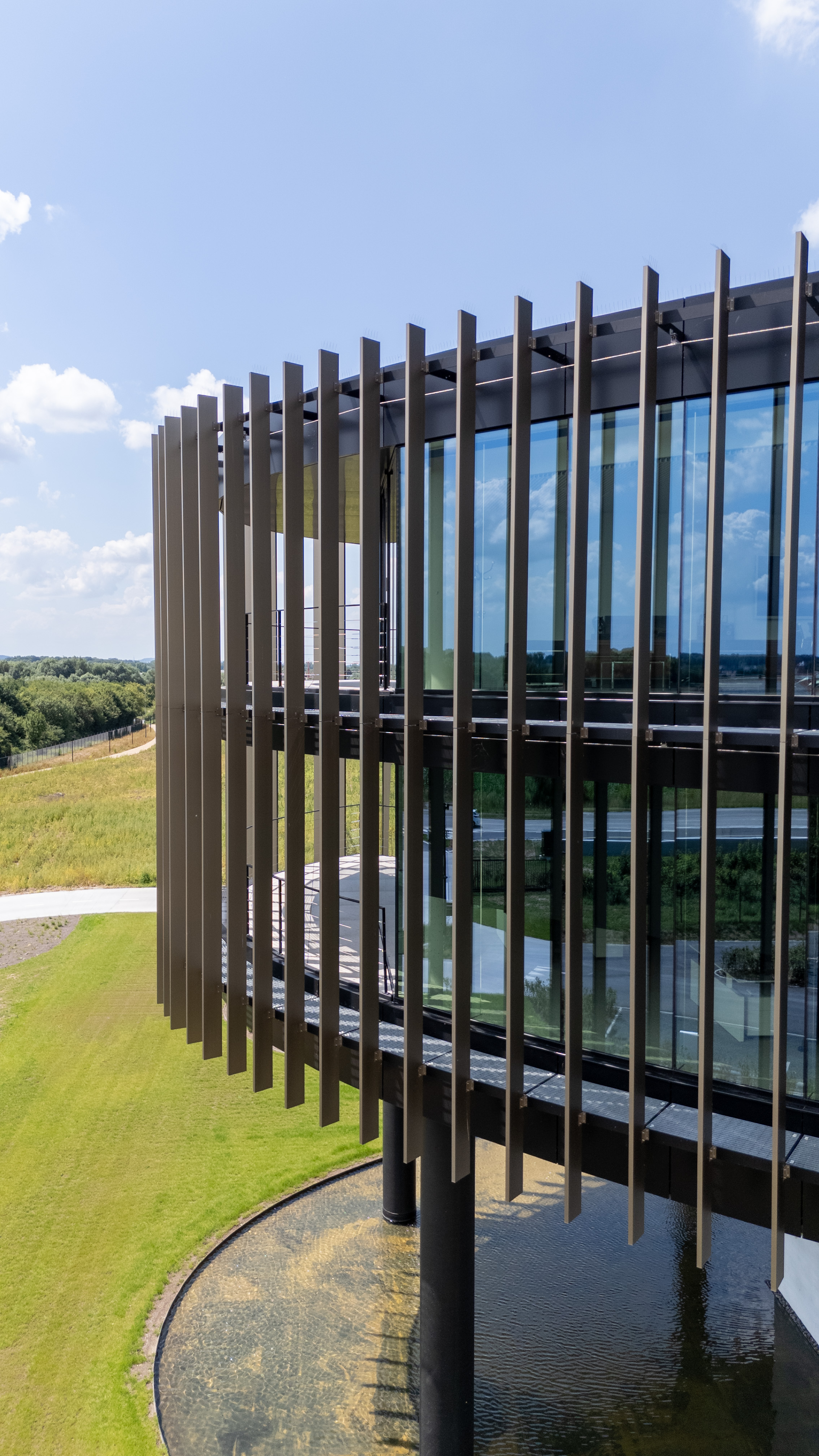 The new Picanol Group headquarters in Ypres is more than just an office building – it has become an architectural landmark showcasing advanced solar shading solutions. The characteristic bobbin shape with its elliptical façade of vertical louvres literally forms the "golden crown" of the complex. This striking façade is completed by cutting-edge external solar shading technology that elevates both comfort and aesthetics to a higher level: the DucoSun Cubic architectural louvre system.