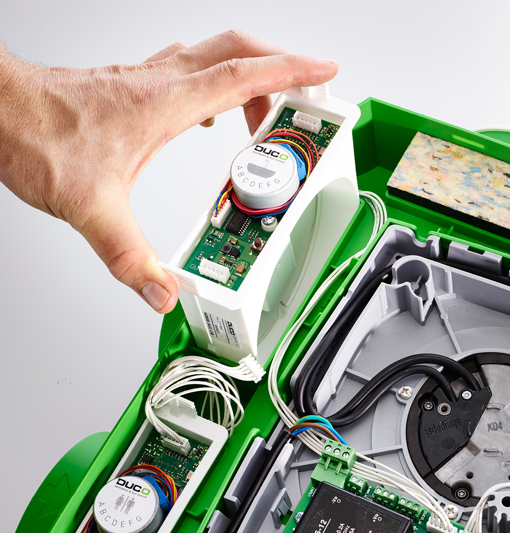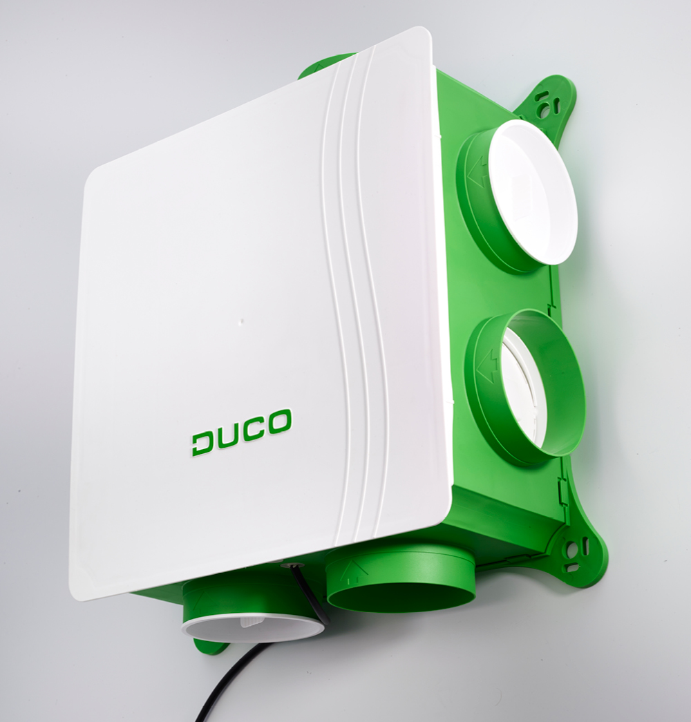 The DucoBox Focus is Europe’s quietest and smartest zonal extract unit. The integrated and patented CO2 and Humidity Control valves guarantee that the correct amount of air is extracted smartly and efficiently, and only when and where this is necessary! The NightBoost function integrated into the DucoBox Focus reduces the risk of overheating.